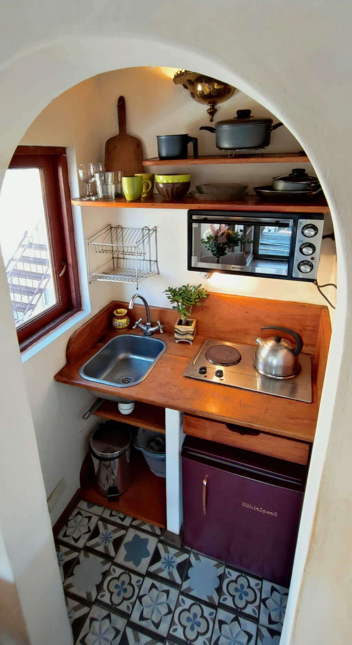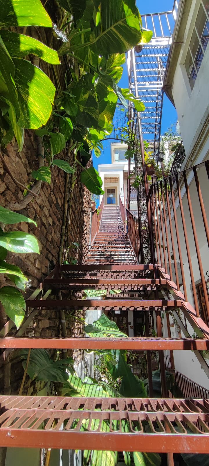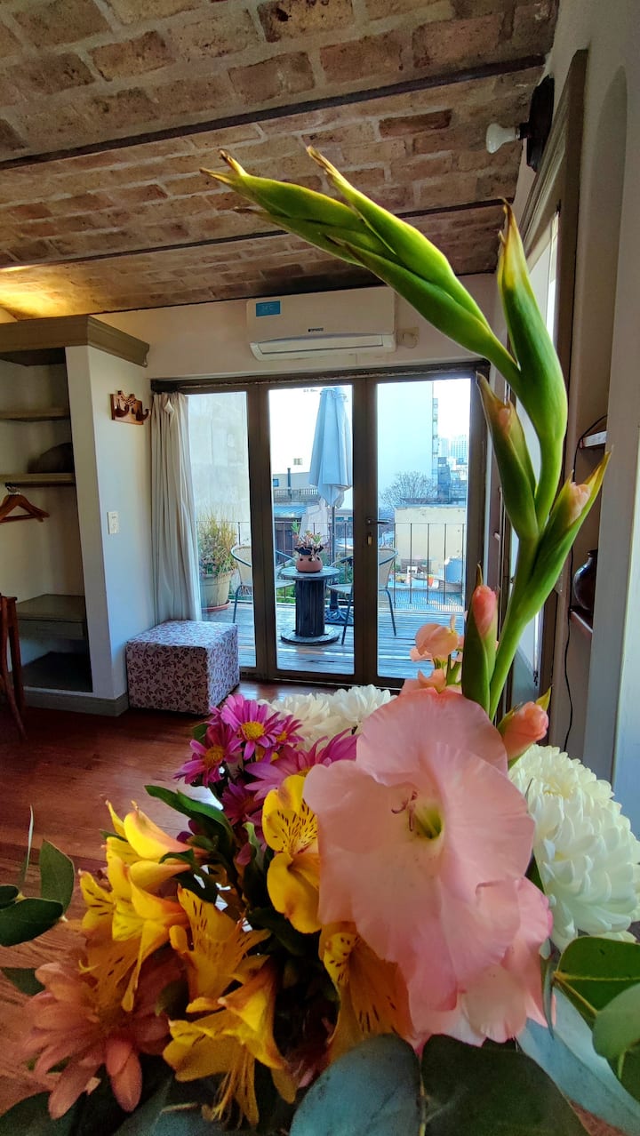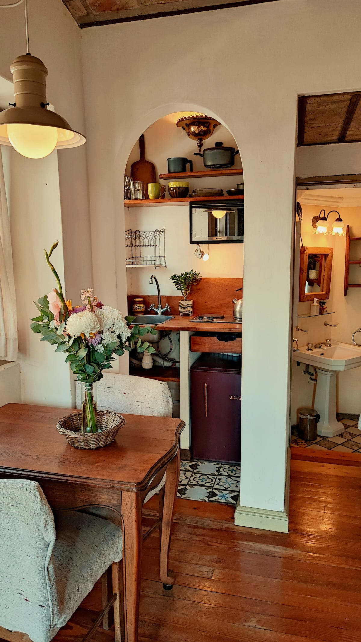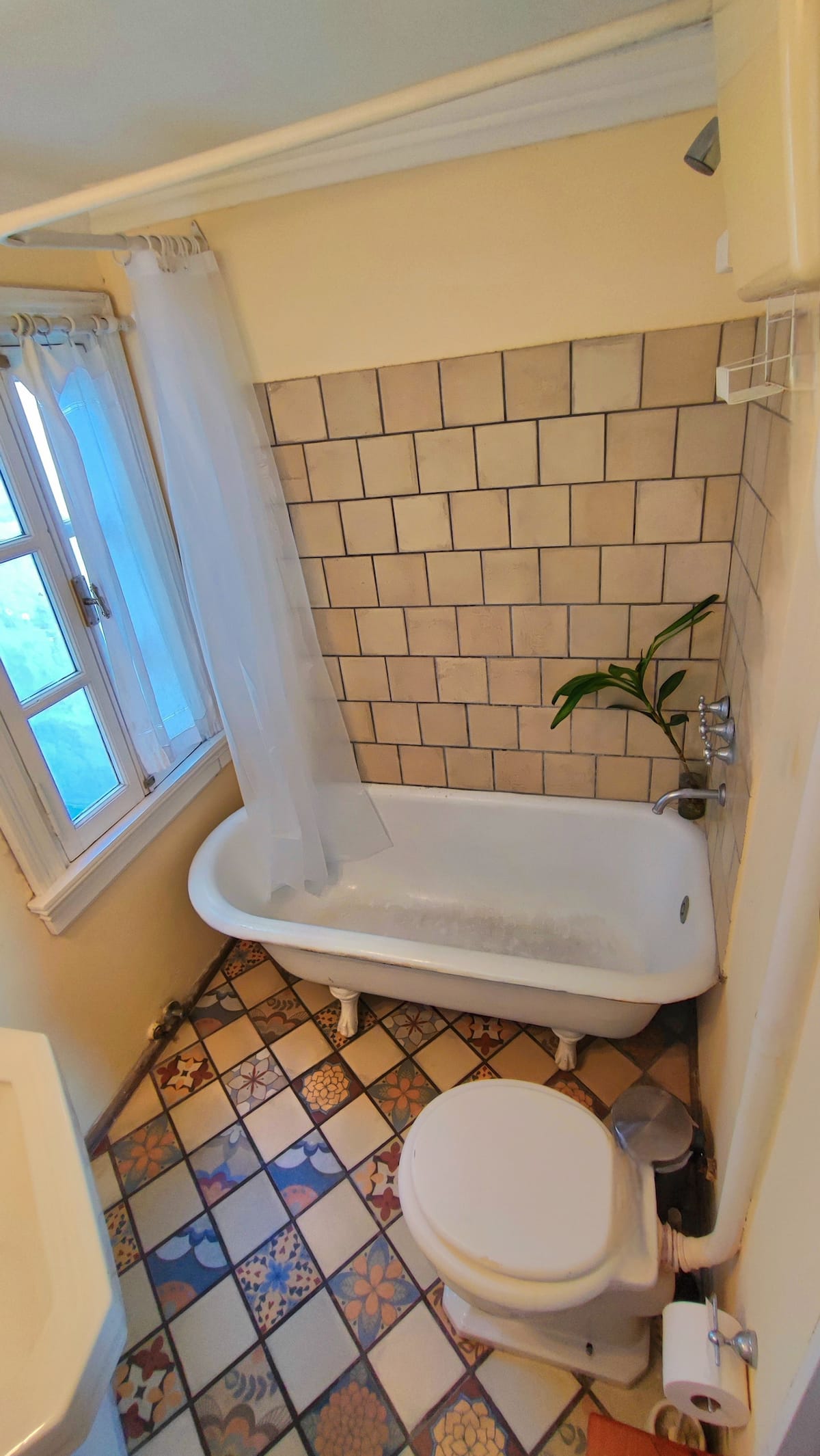 Studio apartment with north-facing orientation. Includes a wooden deck/balcony, air conditioning and 3500 cold/large-heat capacity unit, unlimited hot water, a recycled pine-wood floor and a vault-style ceiling. The building has 11 furnished, fully equipped apartments and an internal courtyard shared by residents; ground-floor space has been used for a free movement internship since 1989.