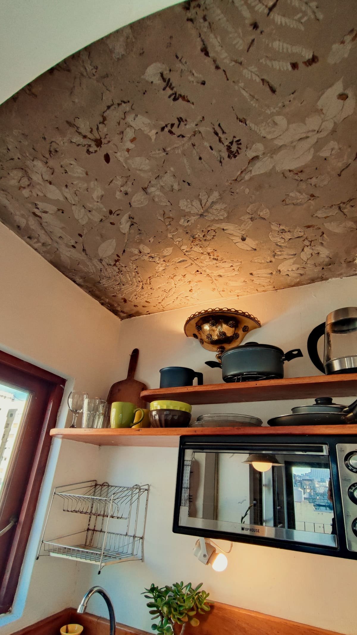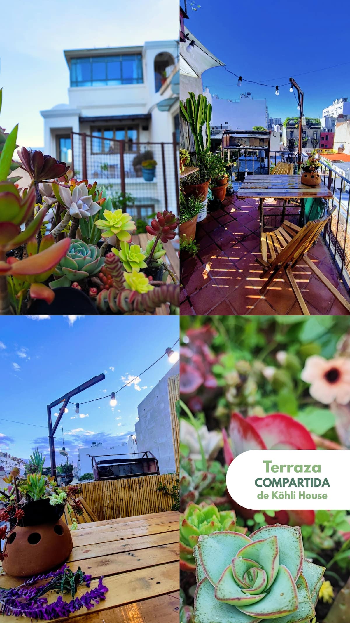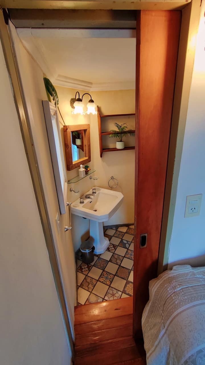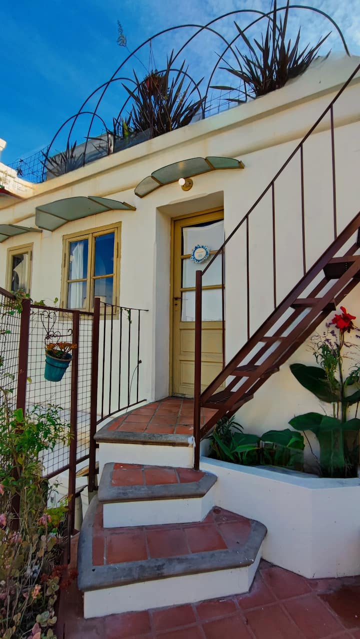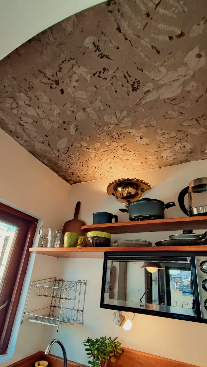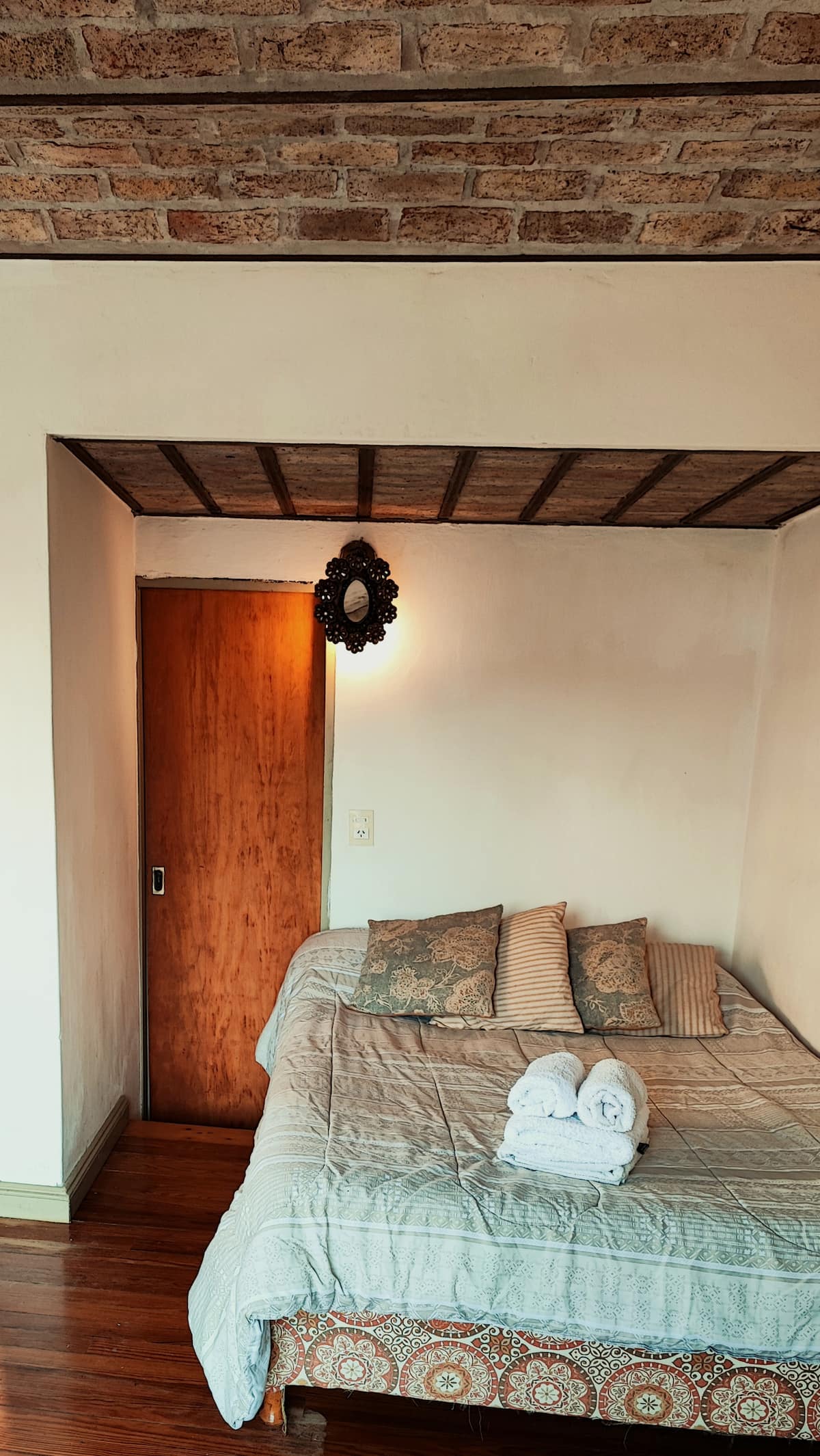 Studio apartment with north-facing orientation. Includes a wooden deck/balcony, air conditioning and 3500 cold/large-heat capacity unit, unlimited hot water, a recycled pine-wood floor and a vault-style ceiling. The building has 11 furnished, fully equipped apartments and an internal courtyard shared by residents; ground-floor space has been used for a free movement internship since 1989.