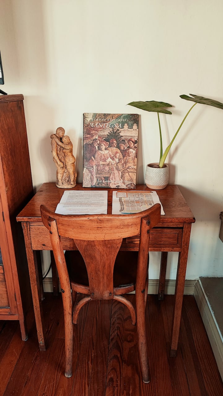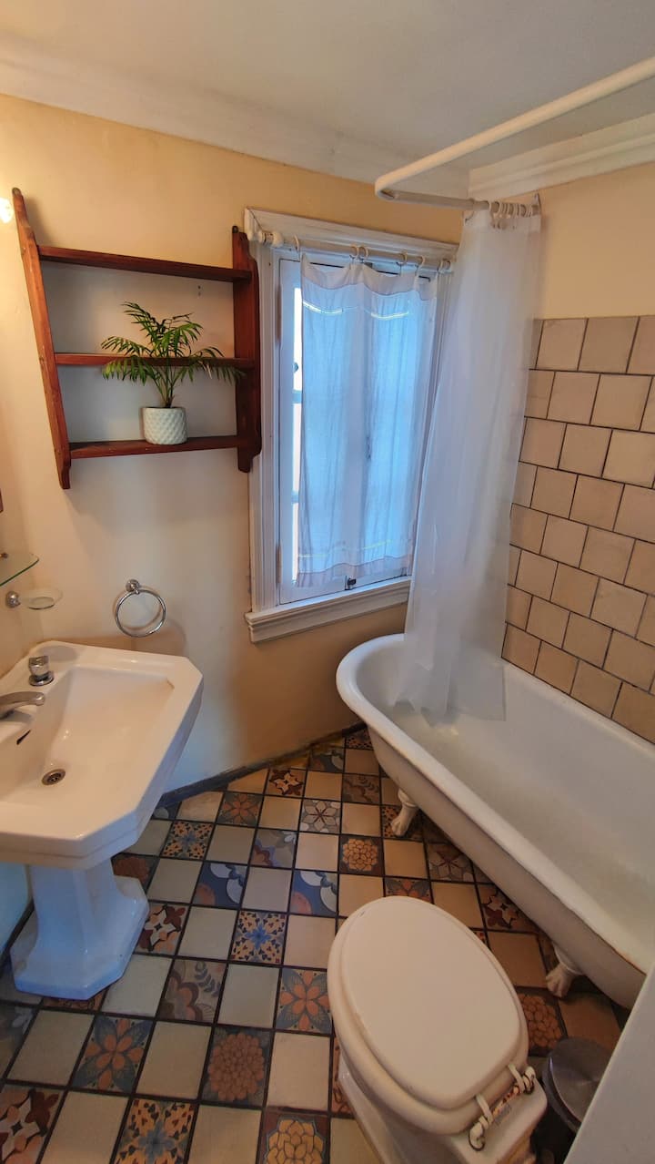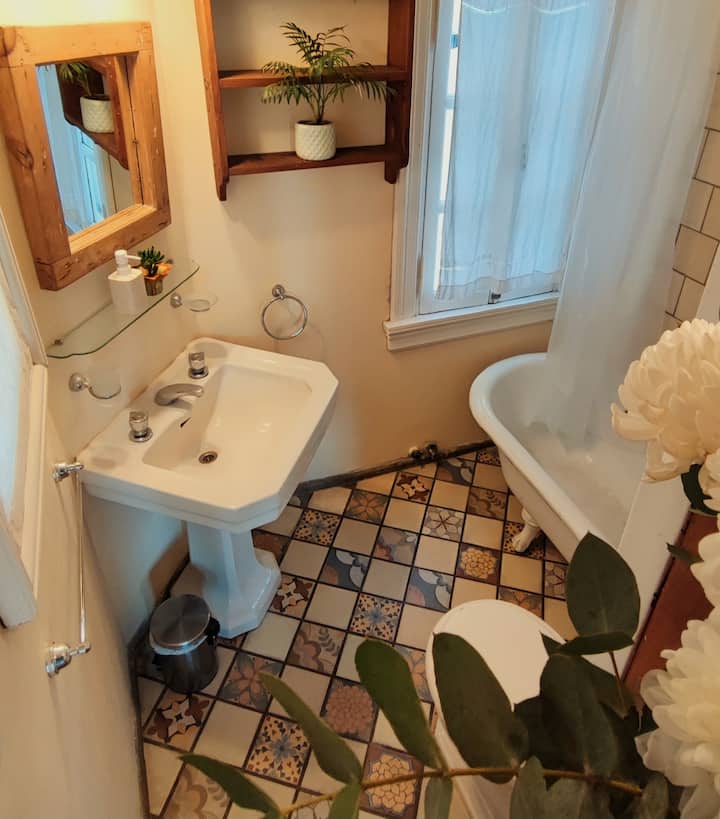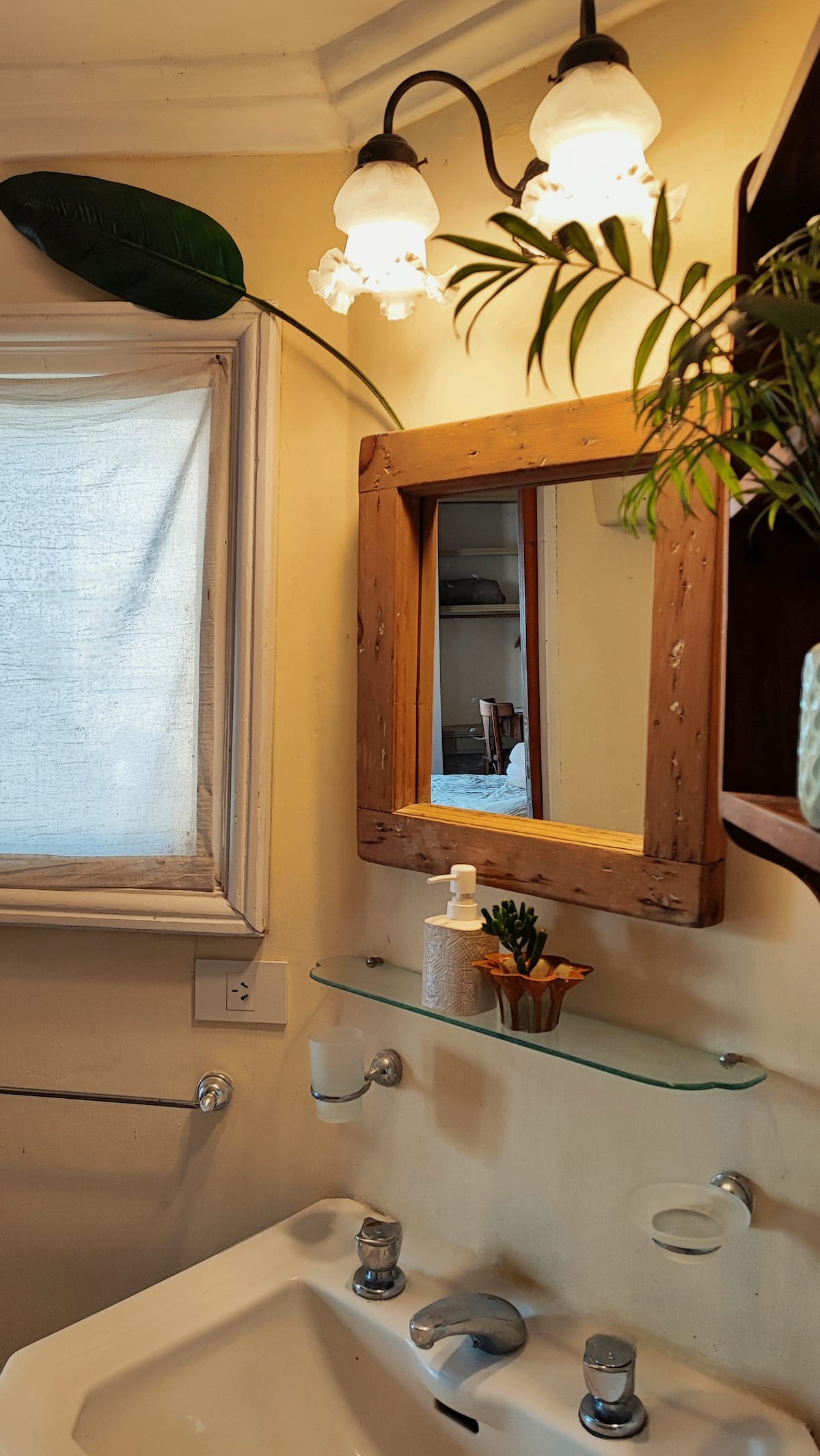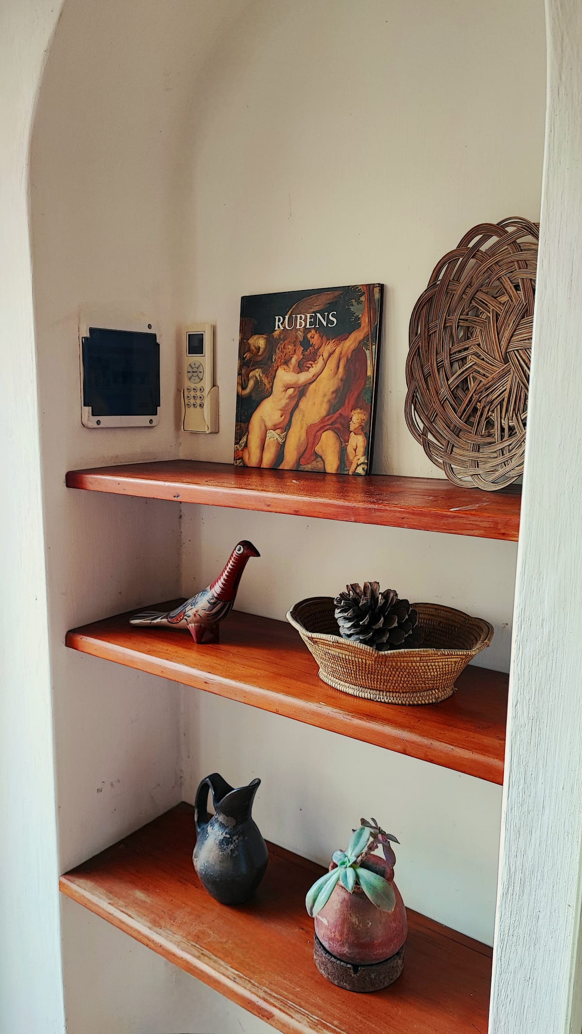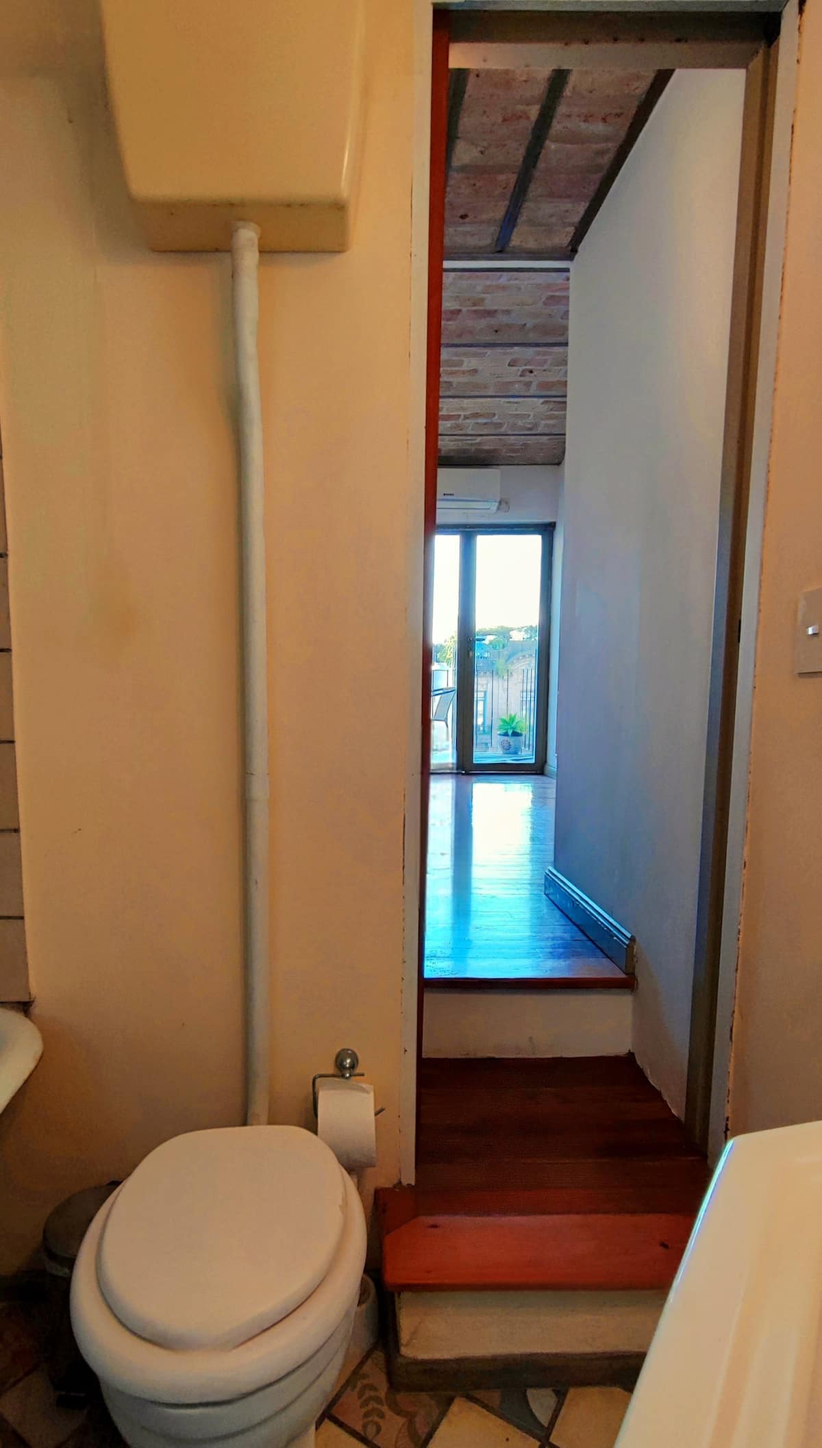 Studio apartment with north-facing orientation. Includes a wooden deck/balcony, air conditioning and 3500 cold/large-heat capacity unit, unlimited hot water, a recycled pine-wood floor and a vault-style ceiling. The building has 11 furnished, fully equipped apartments and an internal courtyard shared by residents; ground-floor space has been used for a free movement internship since 1989.