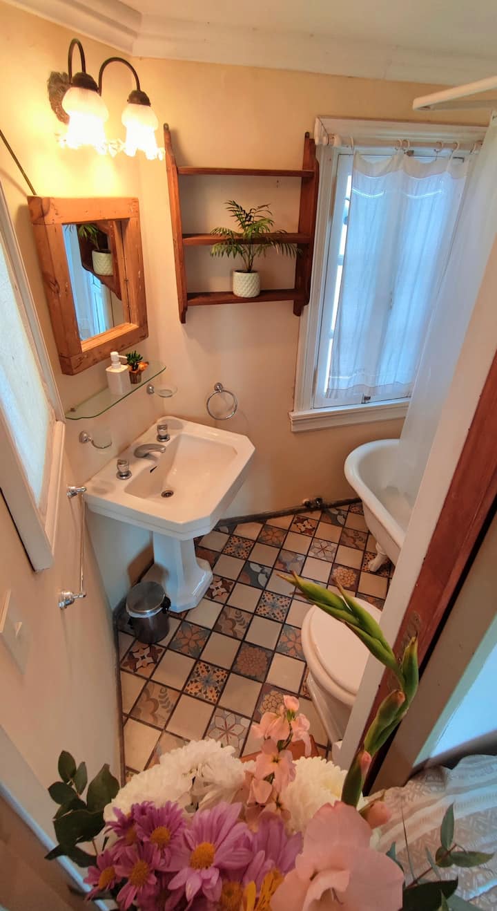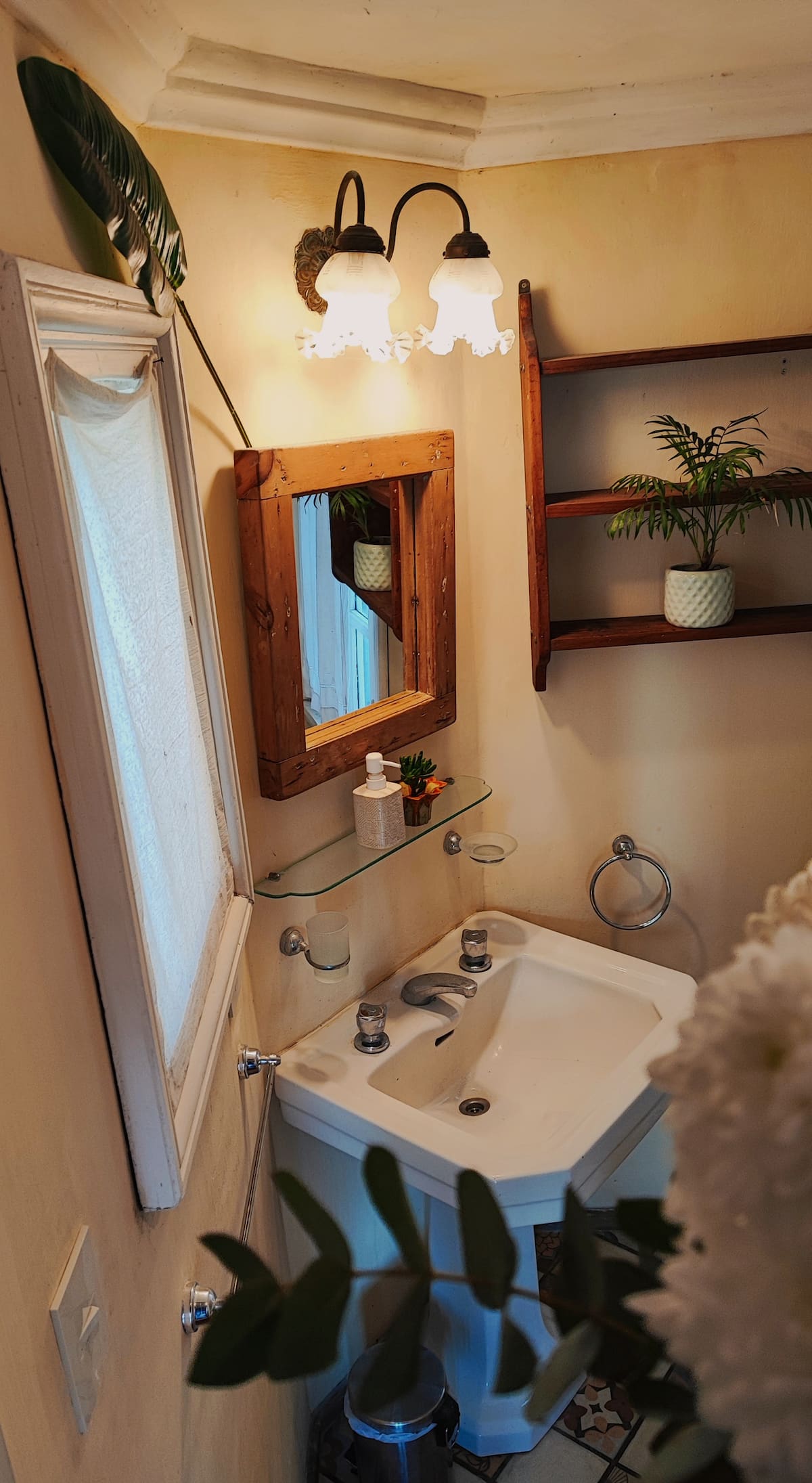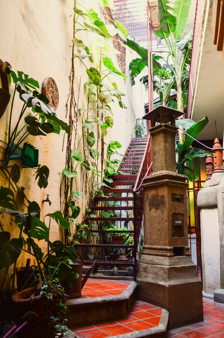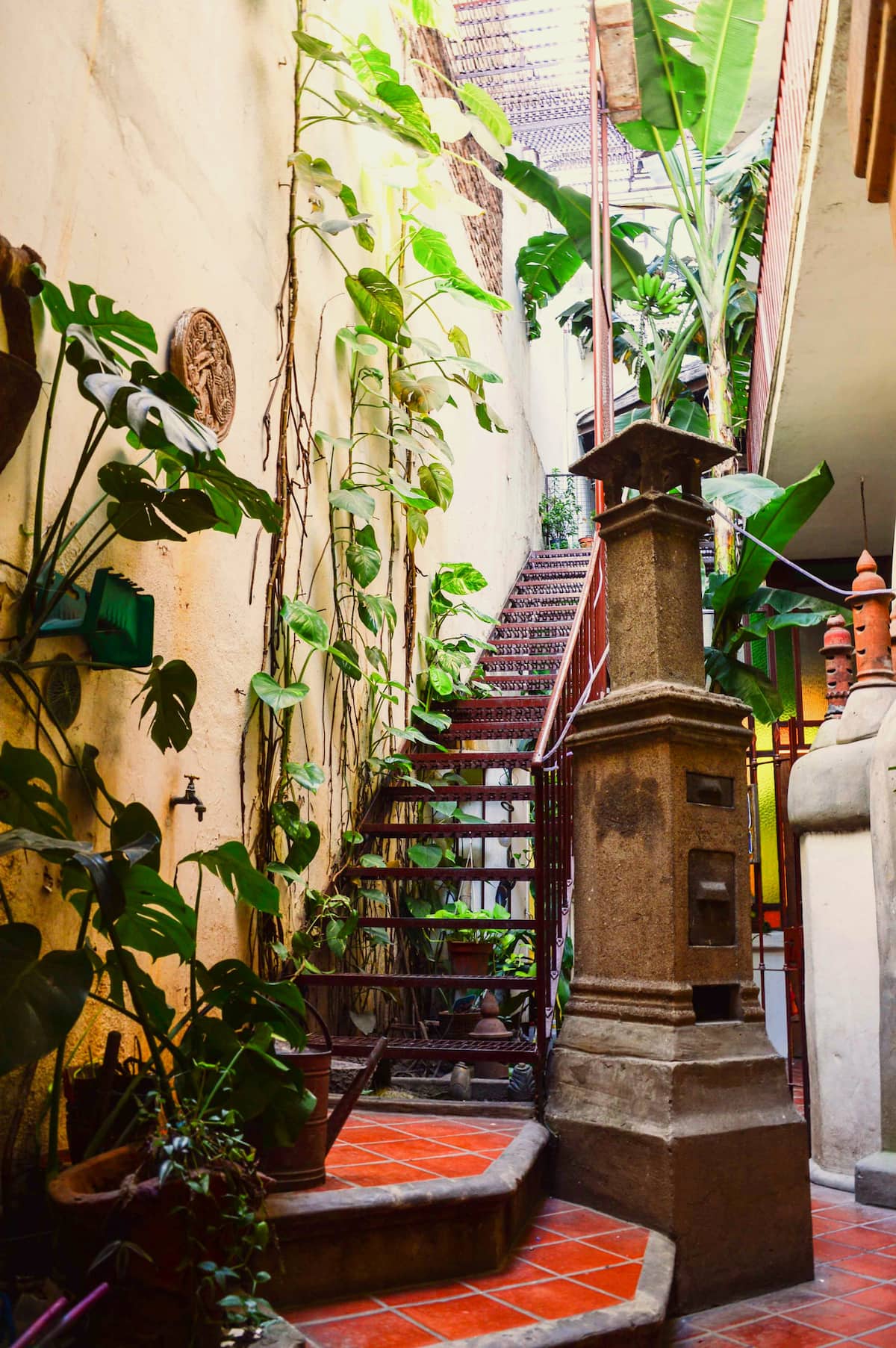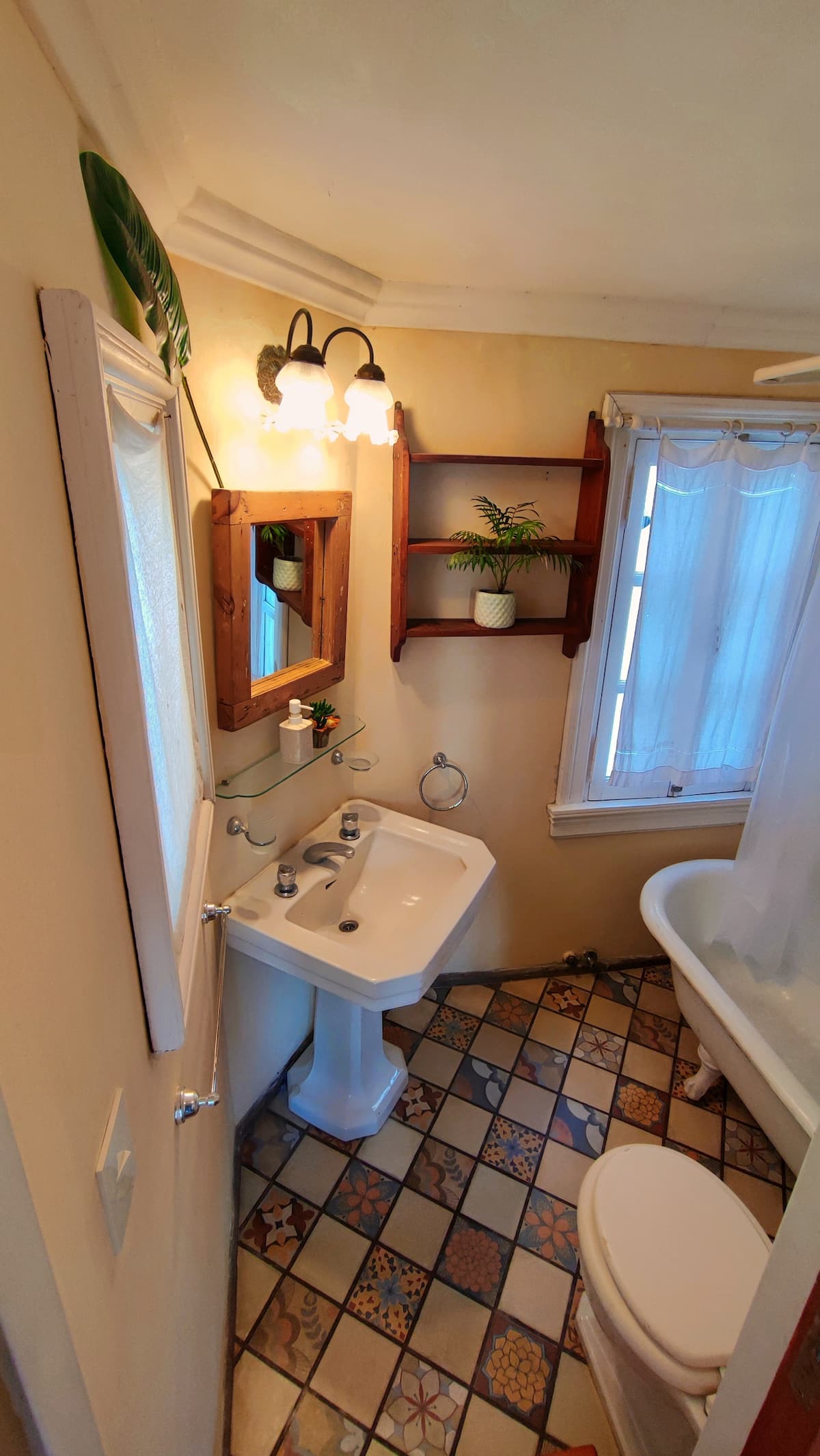 Studio apartment with north-facing orientation. Includes a wooden deck/balcony, air conditioning and 3500 cold/large-heat capacity unit, unlimited hot water, a recycled pine-wood floor and a vault-style ceiling. The building has 11 furnished, fully equipped apartments and an internal courtyard shared by residents; ground-floor space has been used for a free movement internship since 1989.