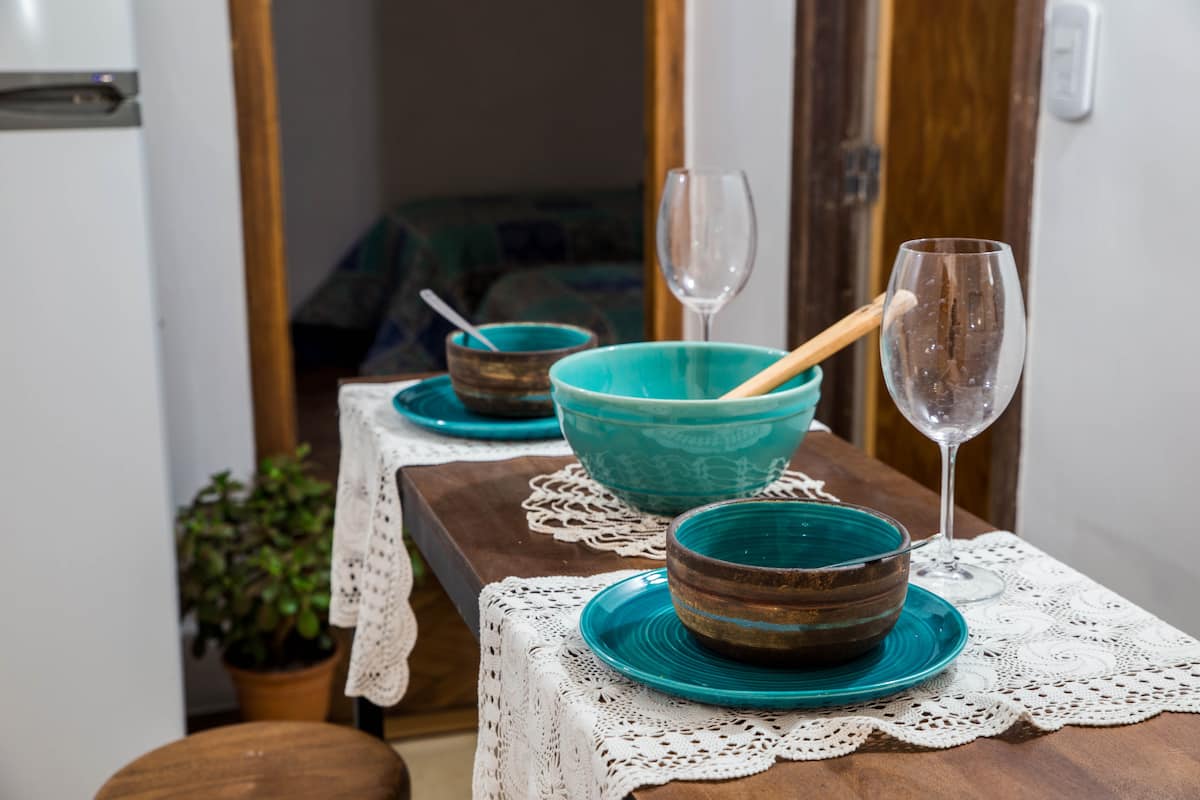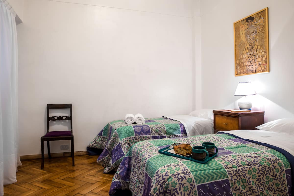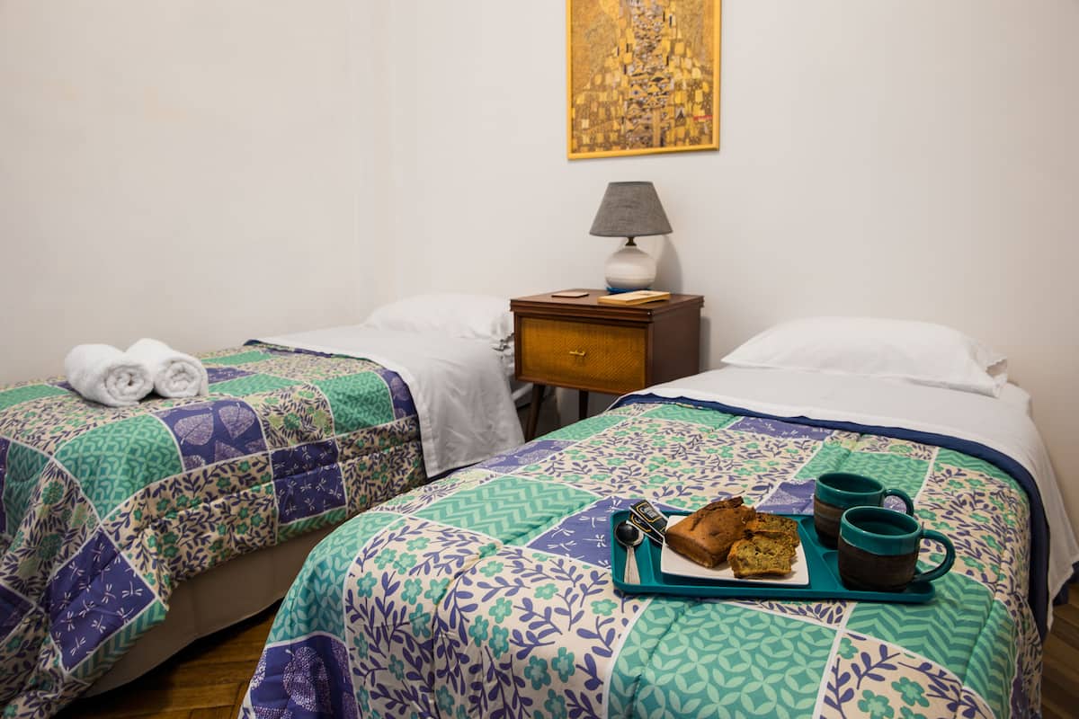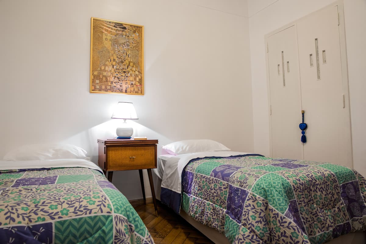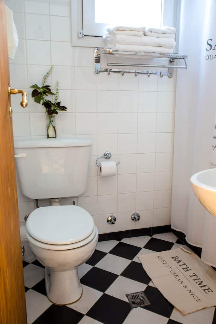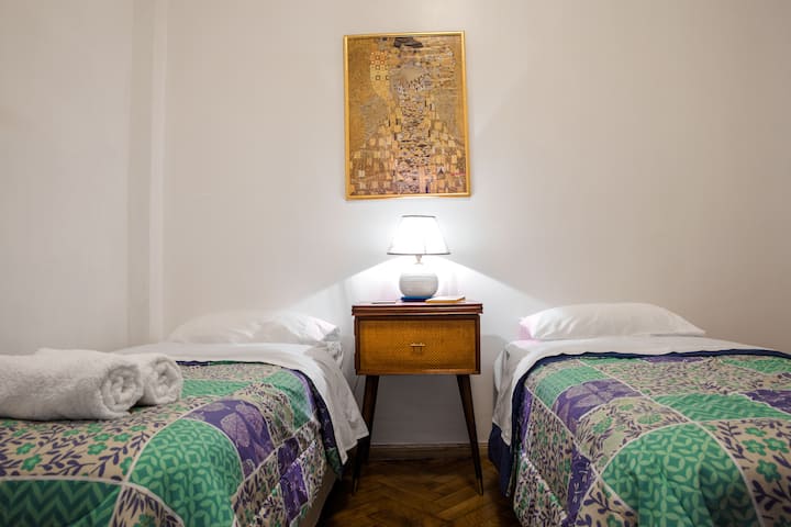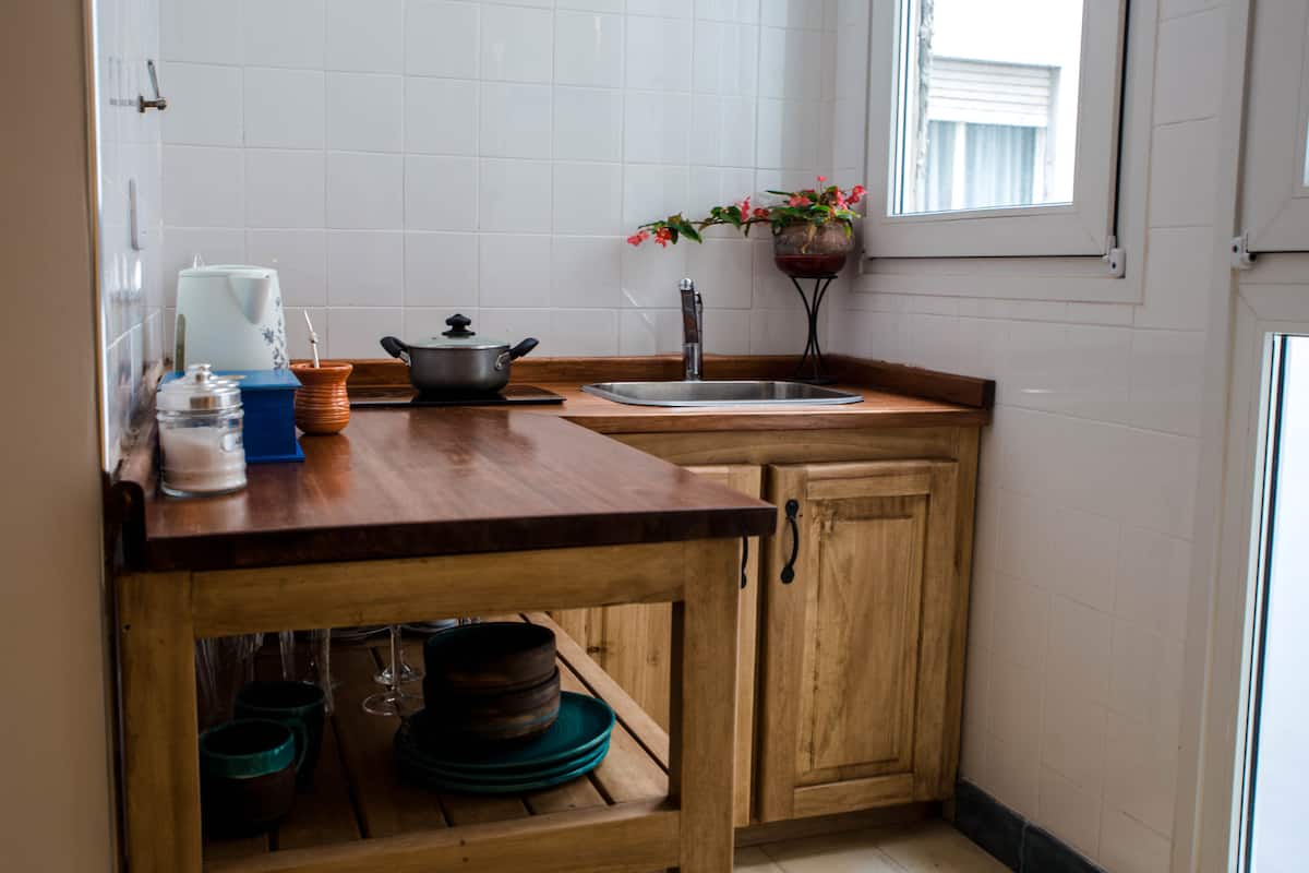 Quiet apartment with a living room and a single bed in the bedroom. The living area has a chaise longue that can be used as a bed, a smart TV, and air conditioning for heating and cooling, plus a heater in the bedroom. The kitchen is fully equipped with a microwave, fridge and freezer, and includes a large window; the bathroom has a shower and a bathtub. Guests have full access to the apartment and receive keys on arrival.