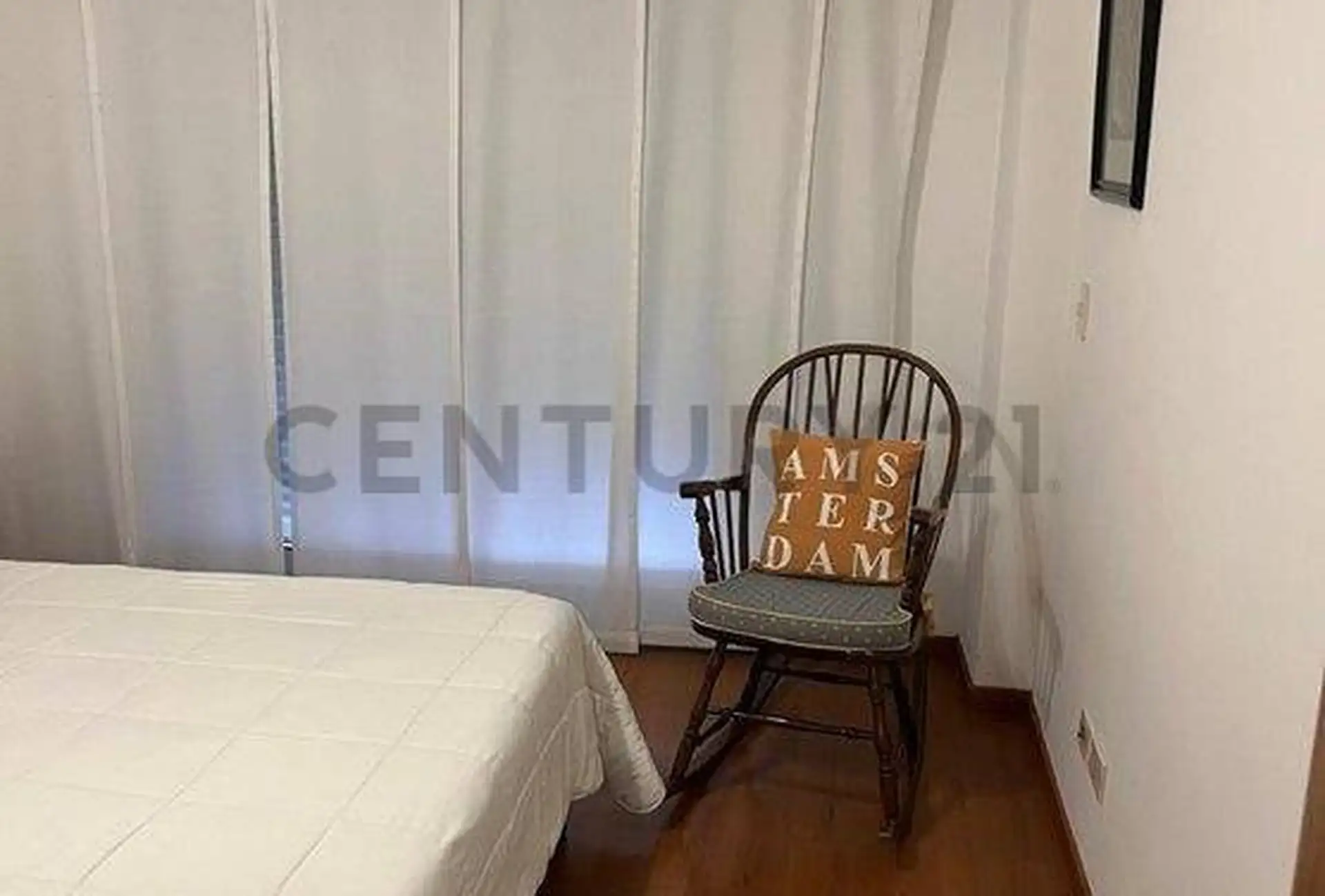 One-bedroom apartment with complete furniture and equipment. Located street-facing on the first floor (stairs only), with a long balcony accessed from the living-dining room and the bedroom. The unit has a living-dining room, separate kitchen, bedroom and full bathroom, plus air conditioning. Rent excludes building fees (expensas), ABL and utilities; private security is listed as 8:00 to 15:00 and 24 hours by totem.