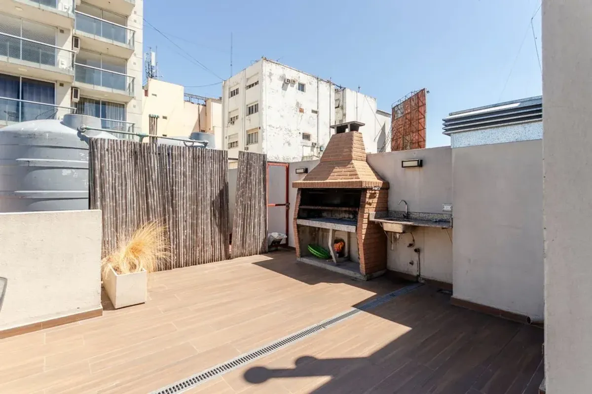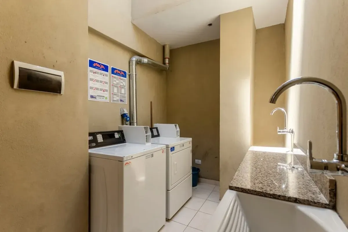 Furnished studio apartment in Monserrat. Layout separates the kitchen (with space for 4 at a table), a TV area with a sofa-bed, and the sleeping area. Kitchenette includes an oven and a gas cooktop with 4 burners; heating and cooling are available. The modern building has a pool with solarium, a grill area with a quincho, a large residents’ communal room for events (SUM), a gym, and a laundry room. There is a speciality coffee café at the building entrance and an on-site caretaker.