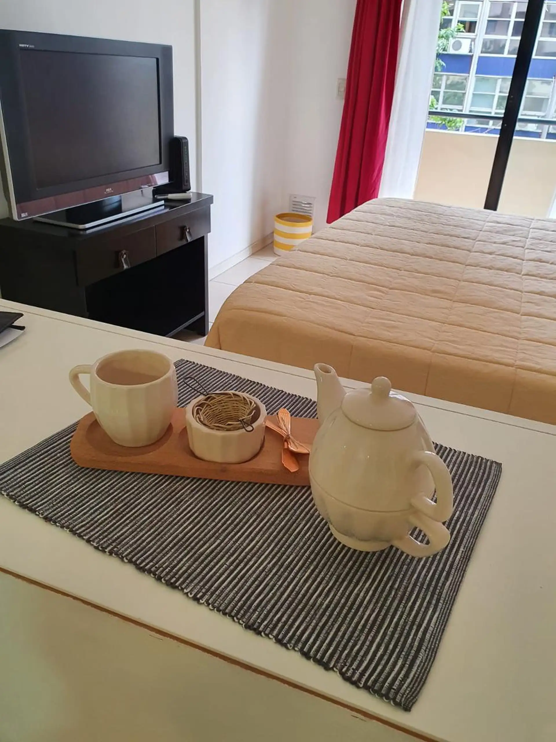 Temporary rental (non-tourism) in Monserrat. Street-facing studio with a broad balcony; fully equipped kitchen with lower cabinets and overhead cupboards. Full bathroom, building laundry facilities, and a communal room (SUM). Located on Av. Belgrano, a short walk from UADE, Fundación Favaloro, Universidad del Cine, and two blocks from Subte Línea C, station area.