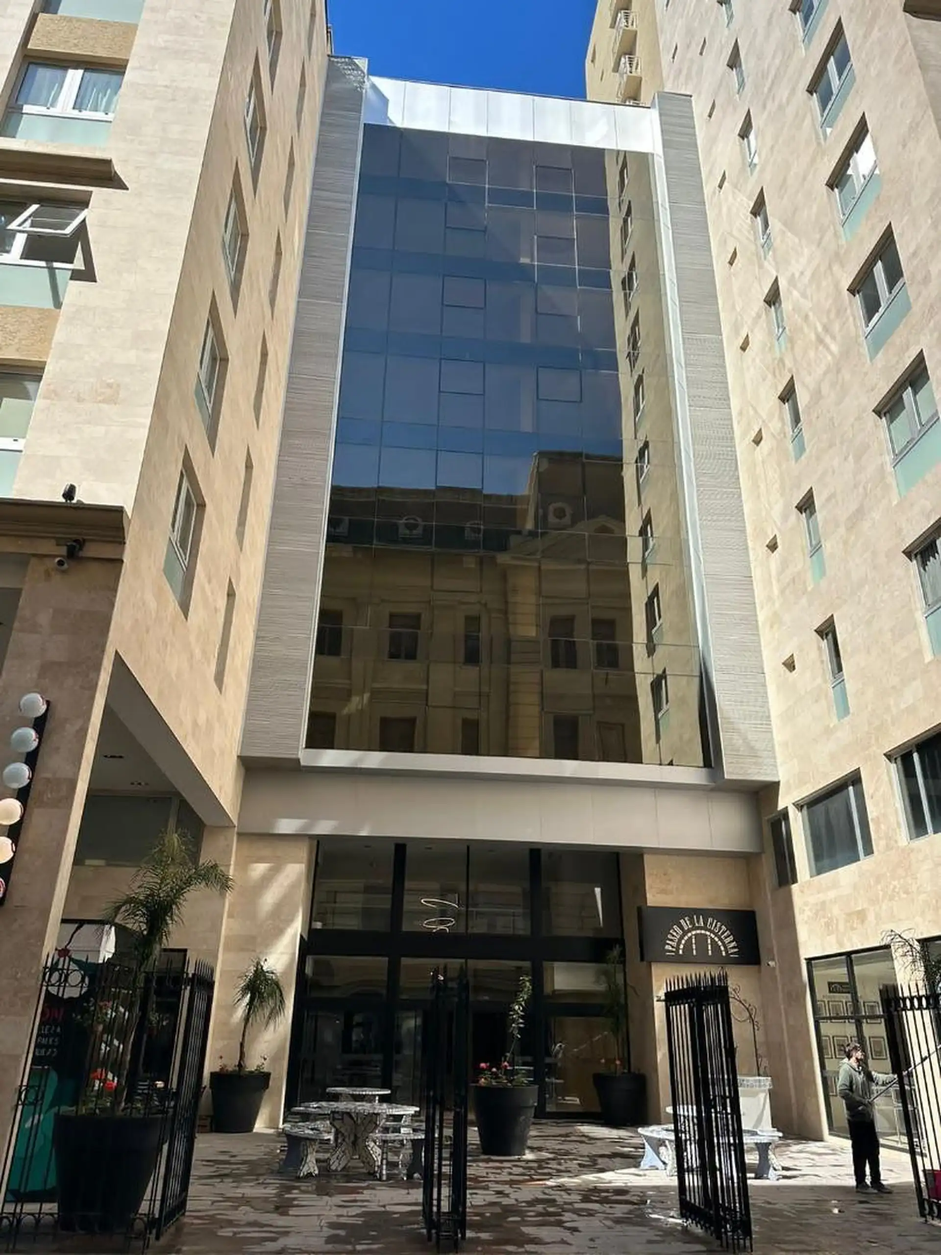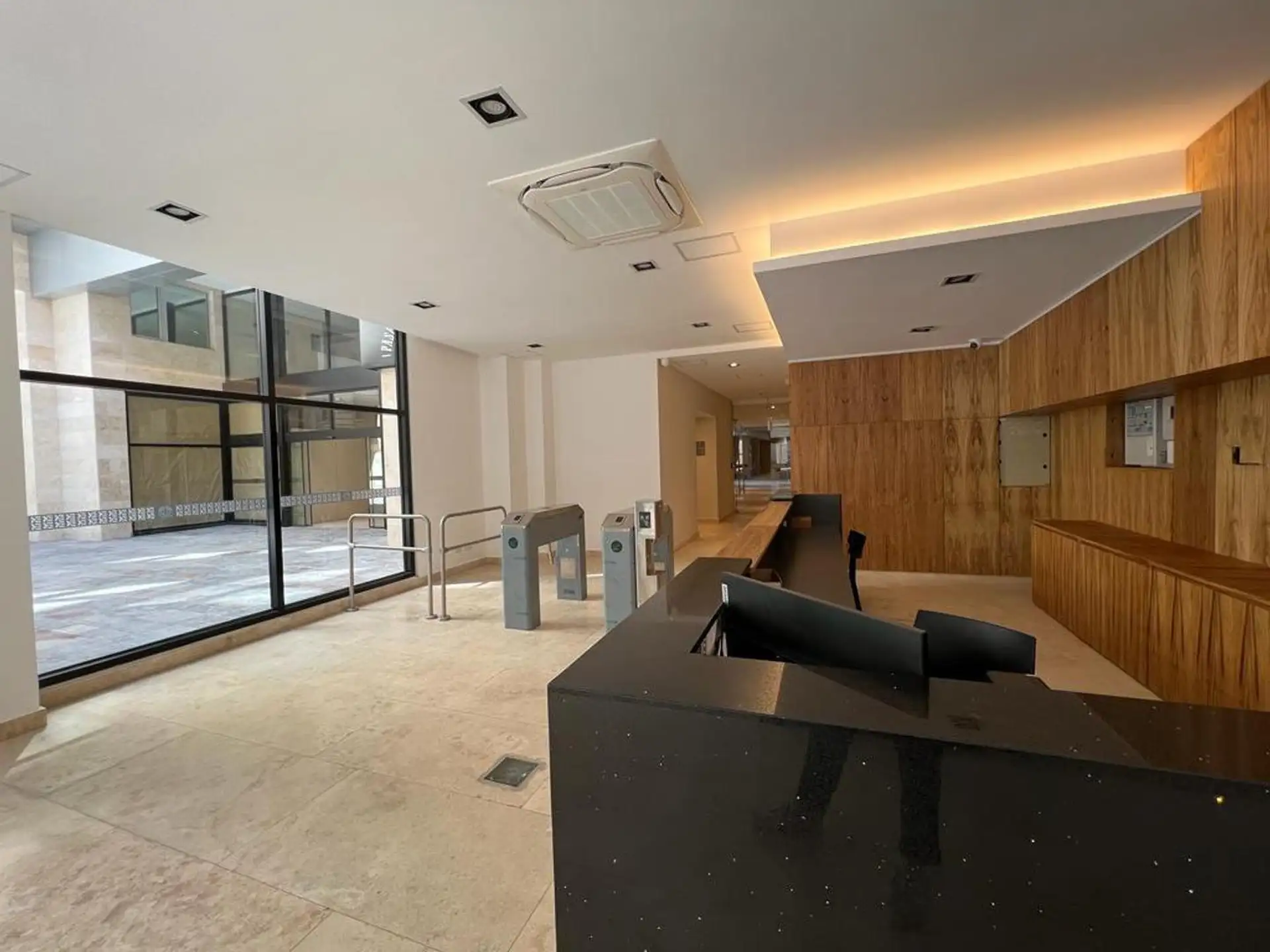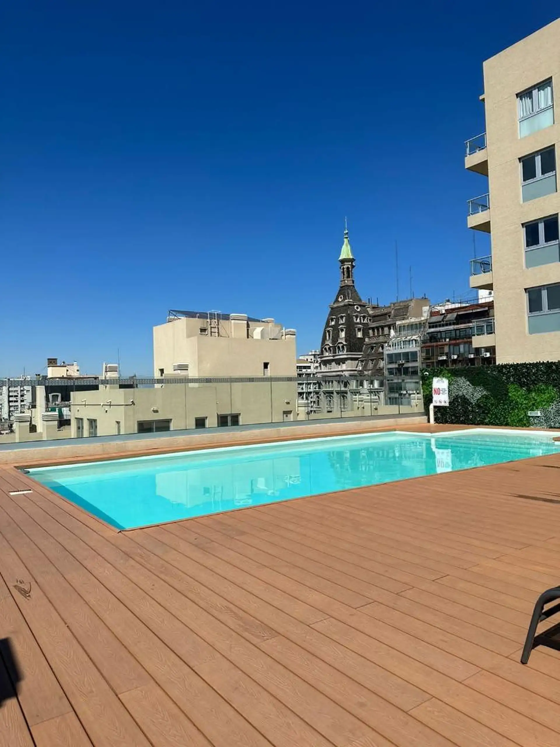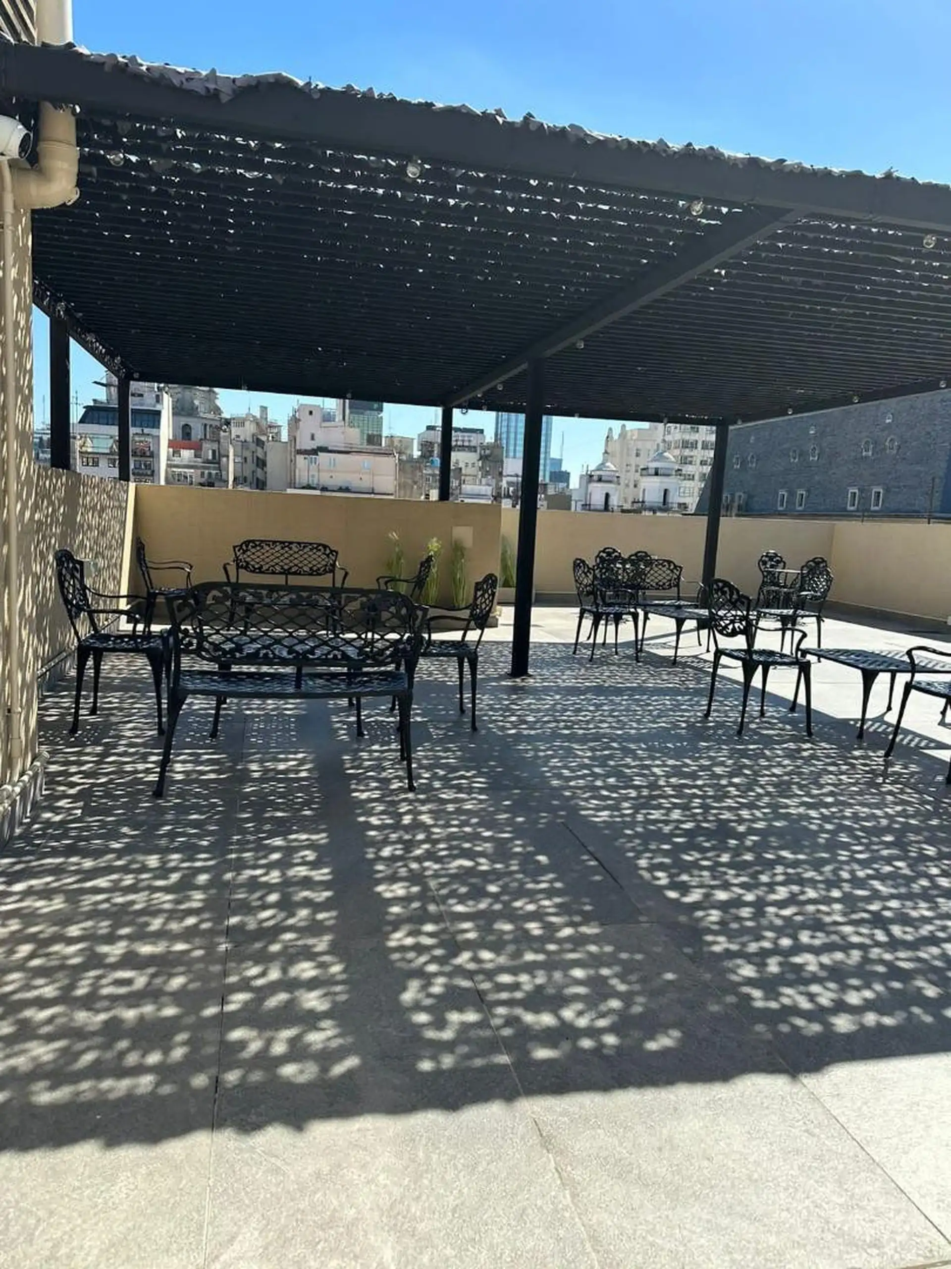 Temporary rental studio in Monserrat, 30 m² covered and 34 m² total, with a courtyard-facing (contrafrente) balcony. Living-dining area with electric hotplate, full bathroom, and air conditioning with hot/cold split, plus a fridge and furnished bedding and appliances. WiFi is included. The building includes laundry, communal room and co-working space (SUM CoWork), pool, a backup generator, intelligent elevators, security and security cameras, and accessibility for people with reduced mobility. R