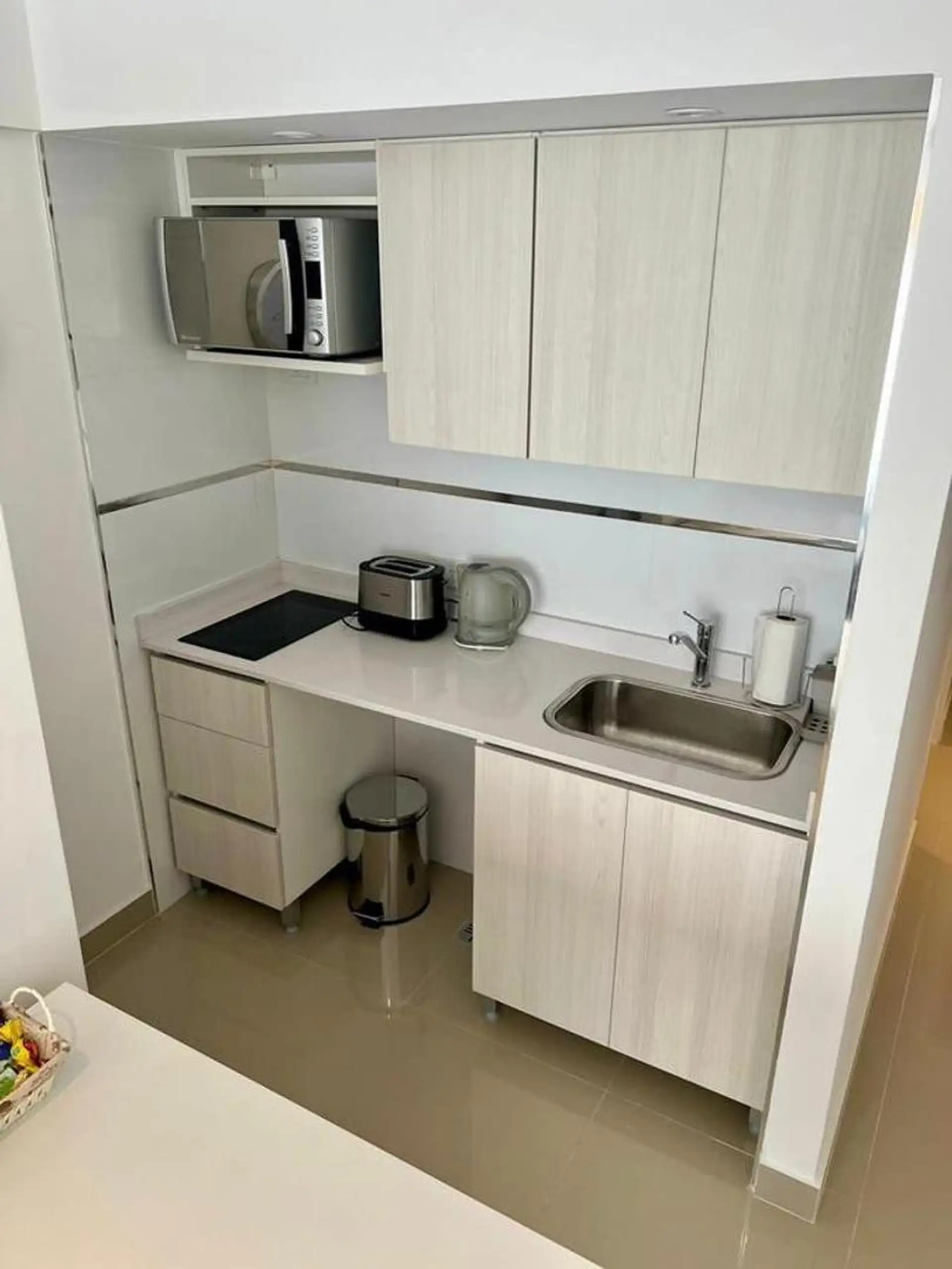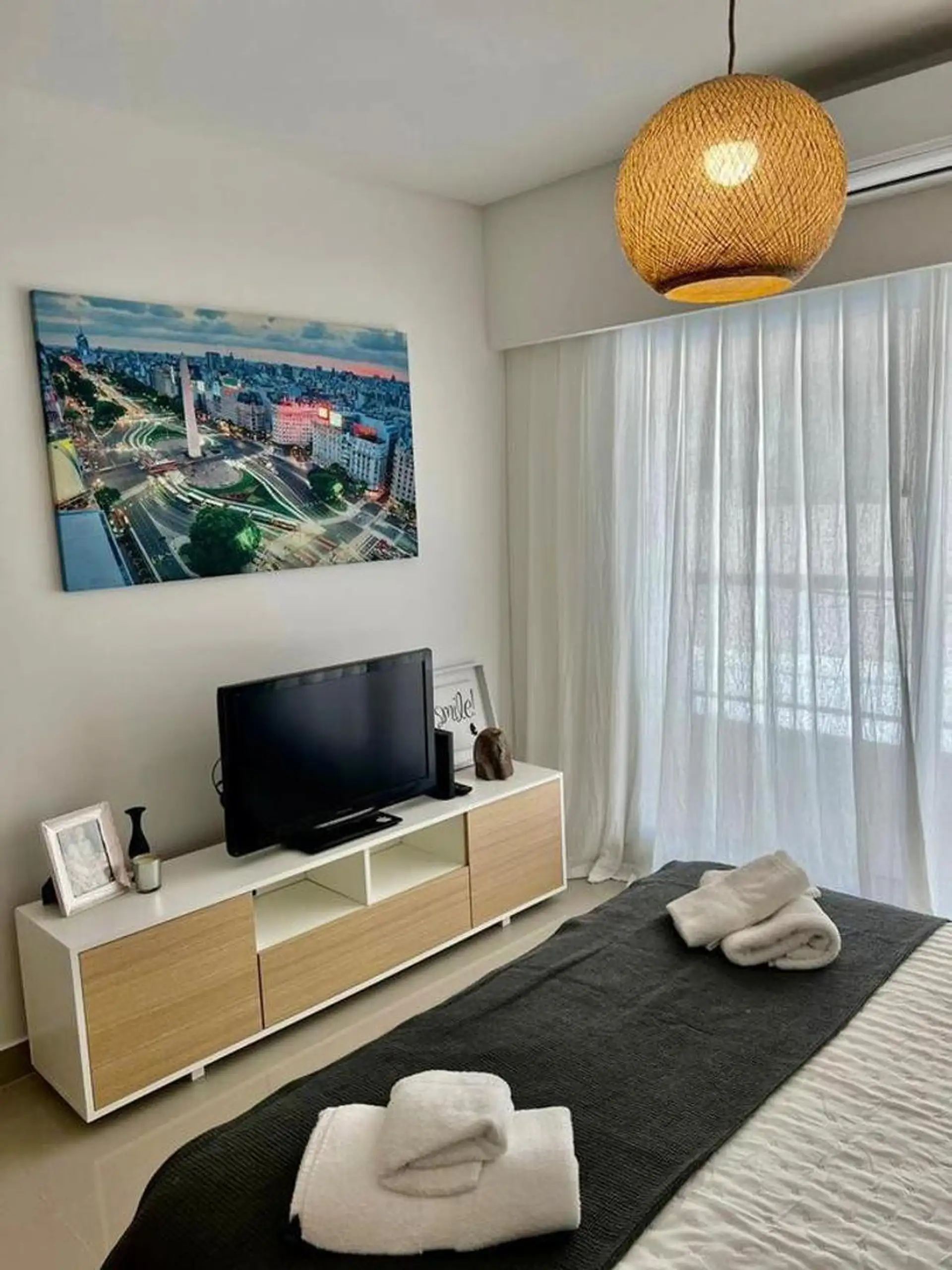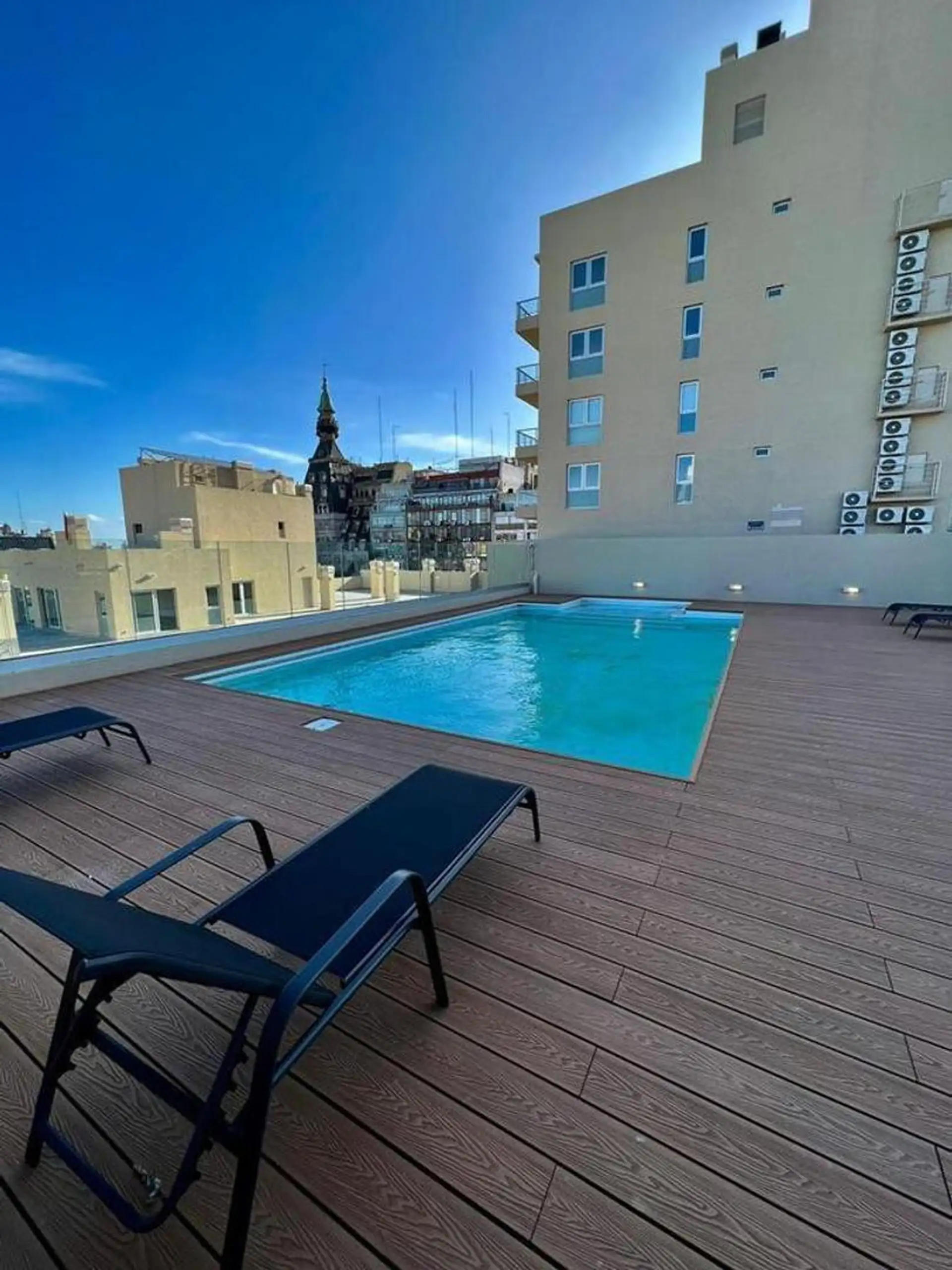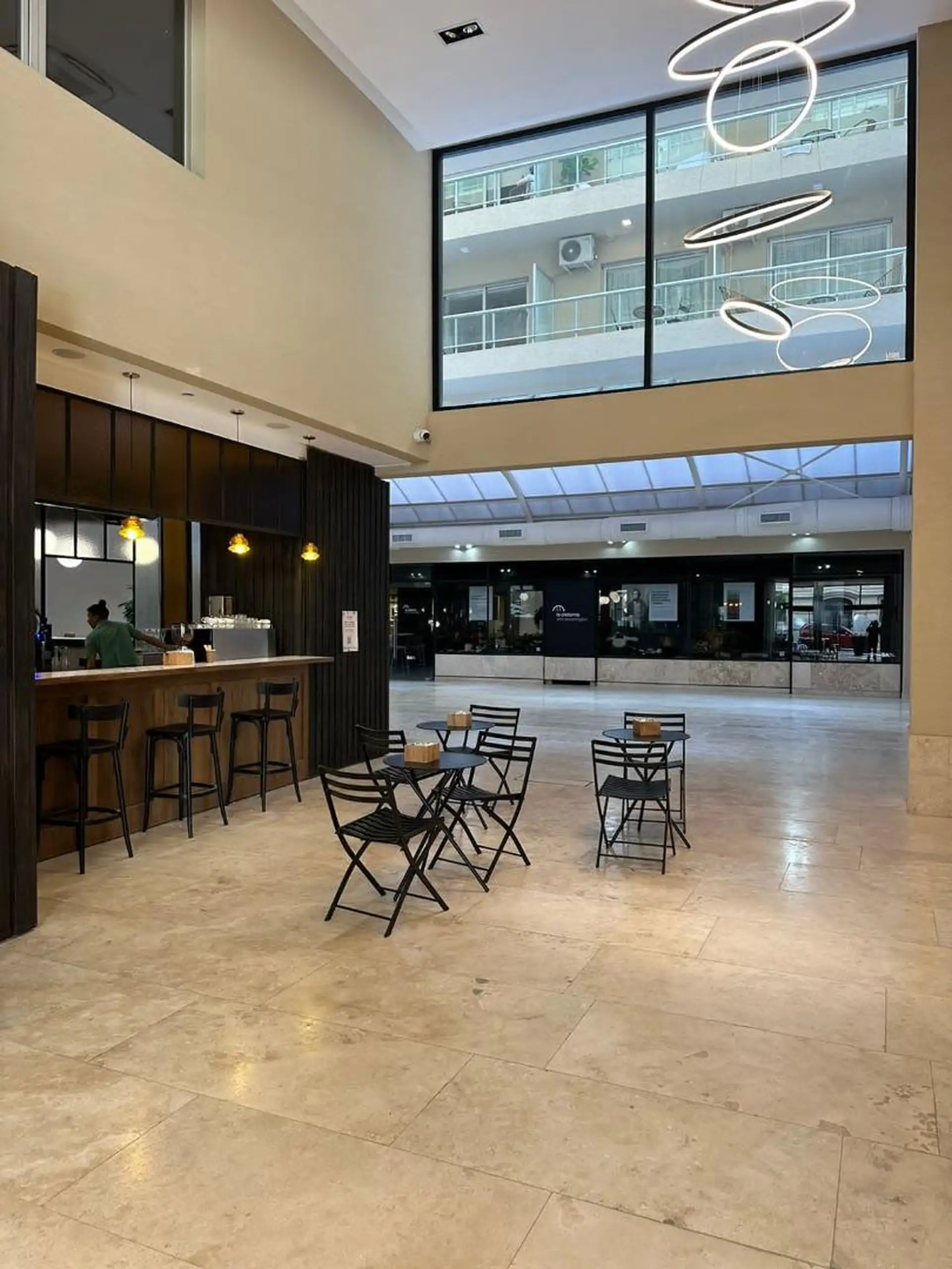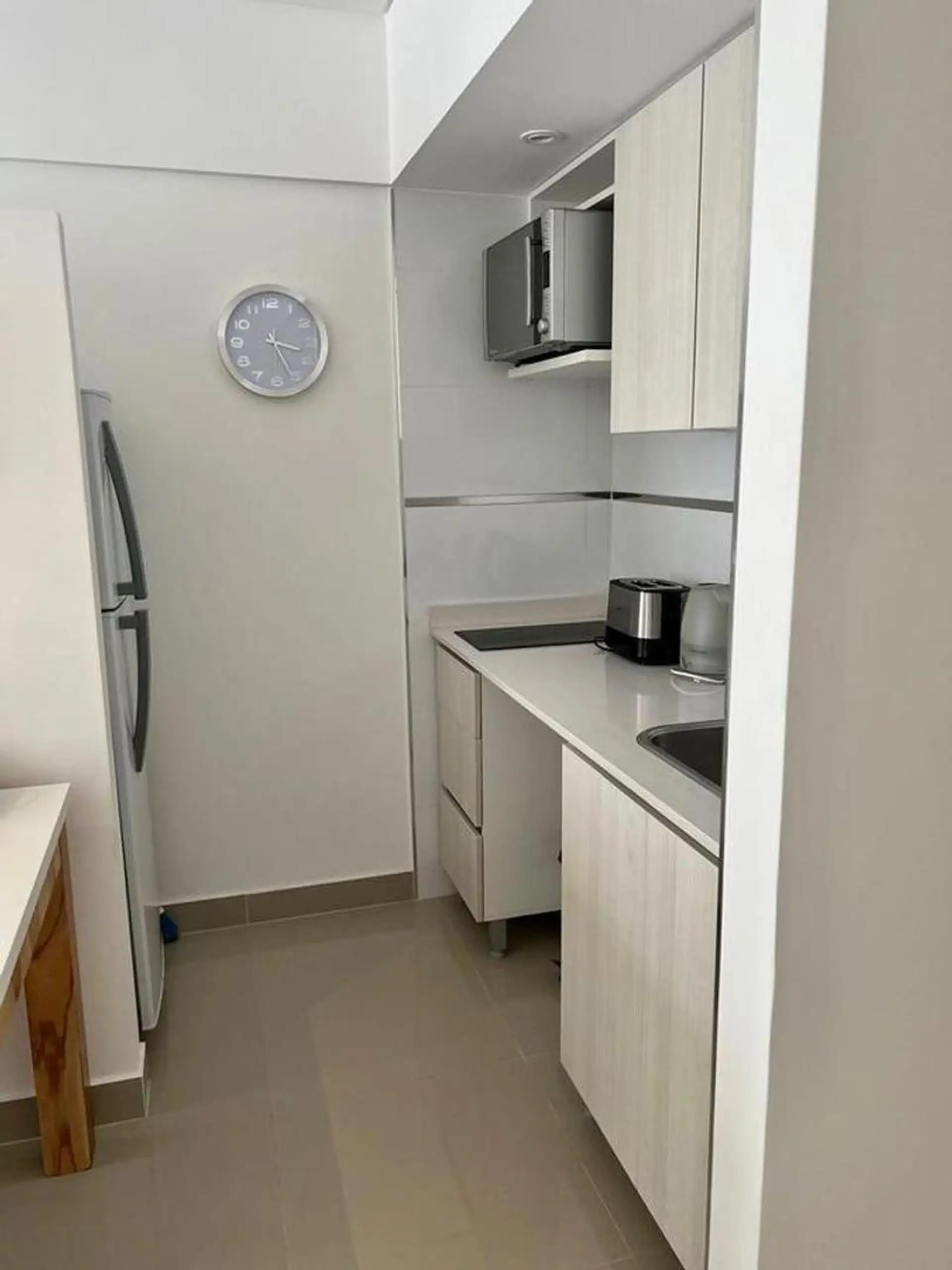 Temporary rental studio in Monserrat, 30 m² covered and 34 m² total, with a courtyard-facing (contrafrente) balcony. Living-dining area with electric hotplate, full bathroom, and air conditioning with hot/cold split, plus a fridge and furnished bedding and appliances. WiFi is included. The building includes laundry, communal room and co-working space (SUM CoWork), pool, a backup generator, intelligent elevators, security and security cameras, and accessibility for people with reduced mobility. R