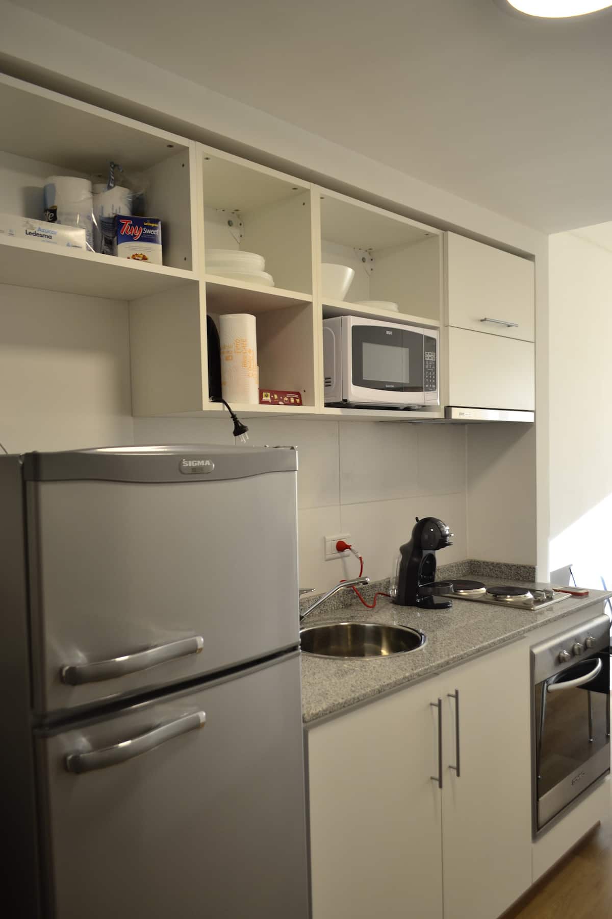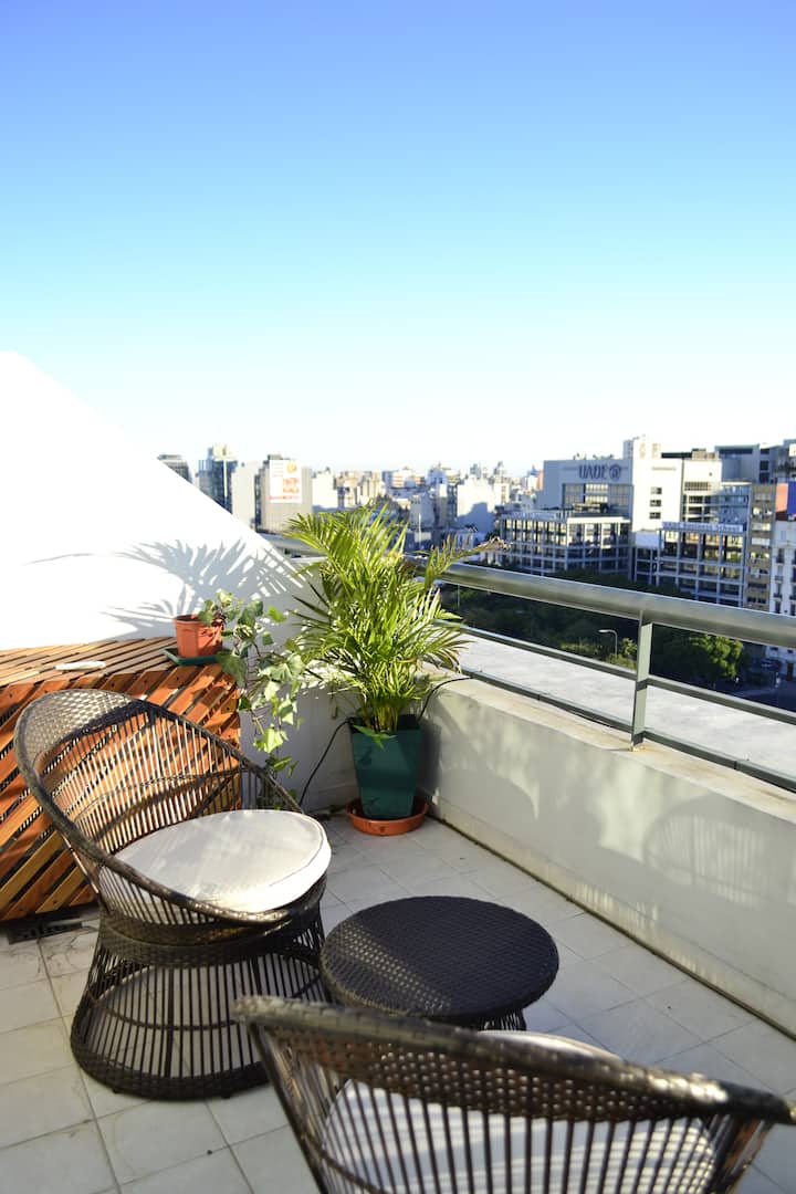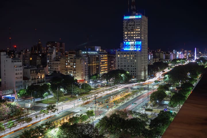 Modern one-bedroom apartment on Av. 9 de Julio, with a balcony street-facing to the Obelisco and views over a wide, tree-lined avenue. The unit is furnished and includes a living room with a 32-inch LED TV with Chromecast, Wi‑Fi access (12MB), and a mirrored-door closet. The kitchen has a stove with oven, two electric burners, microwave, refrigerator, expresso machine, electric kettle, juicer, and toaster. The balcony has a seating set, plants with an automatic watering system, and remote-contro