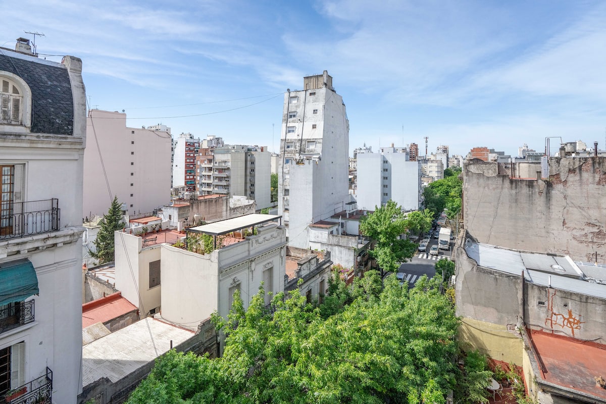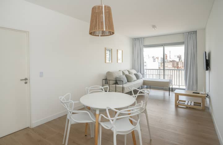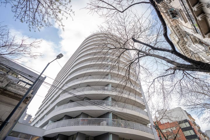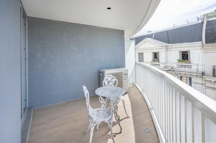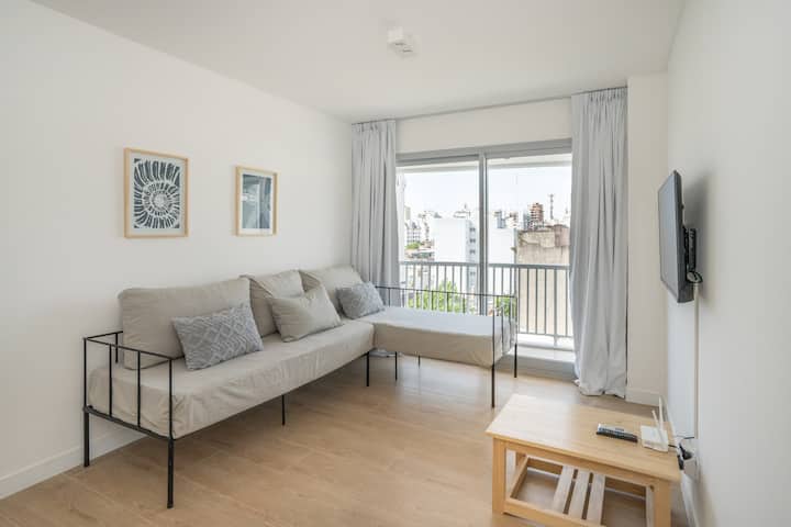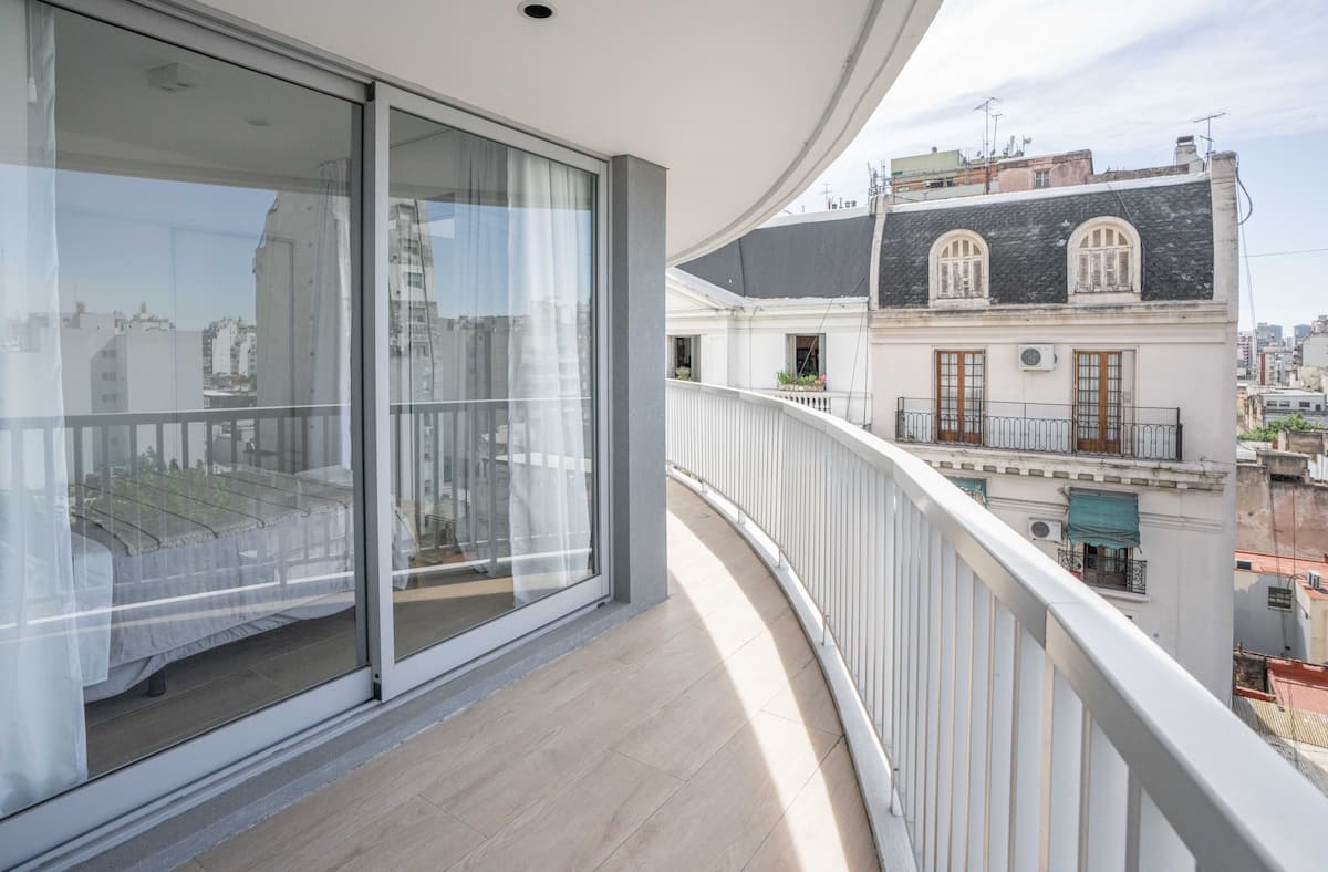 One-bedroom apartment in Monserrat, Buenos Aires, on the 7th floor with lift access. Street-facing with a balcony and a private bathroom. Living room with air conditioning, high-speed Wi‑Fi and Smart TV. Kitchen includes an oven, microwave, fridge, coffee maker and toaster.