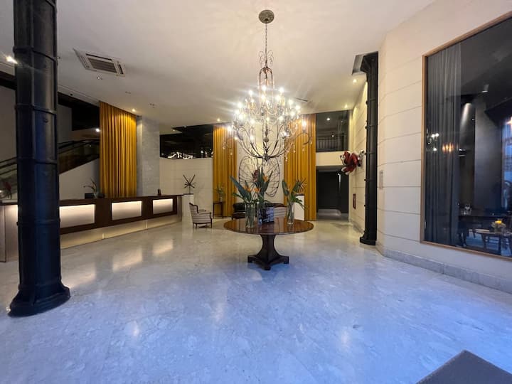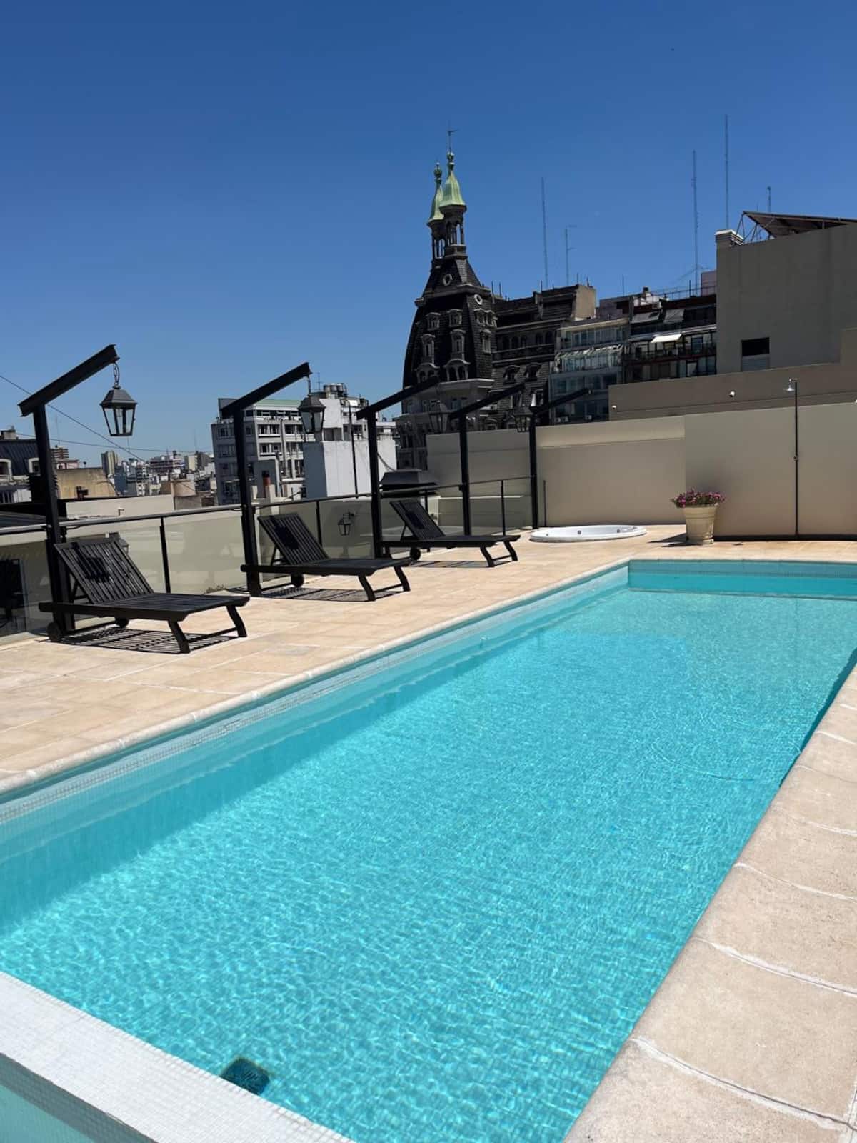 Apartment in Monserrat. The listing describes centrally located accommodation with hotel-style services in the building and mentions Plaza de Mayo within walking distance, along with nearby areas including San Telmo, Puerto Madero and the theatre district.