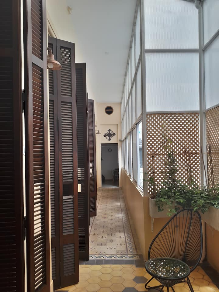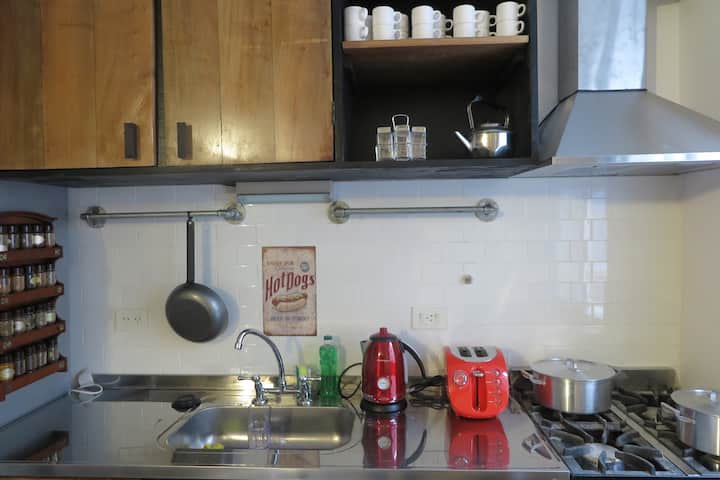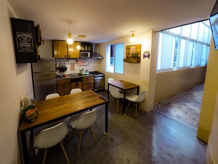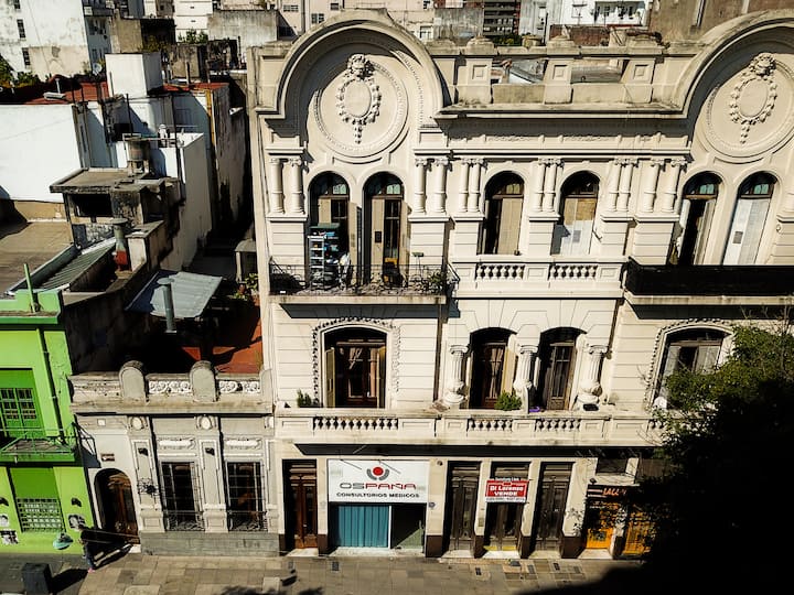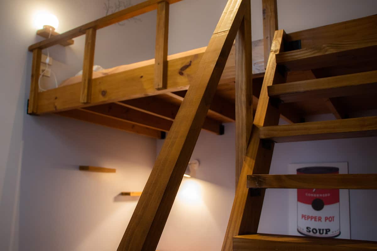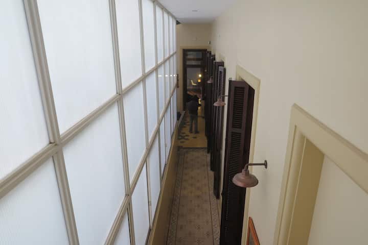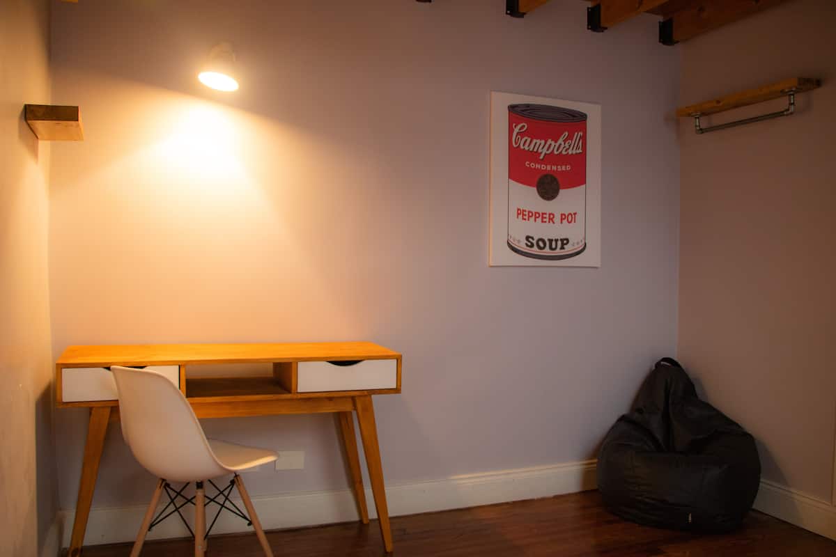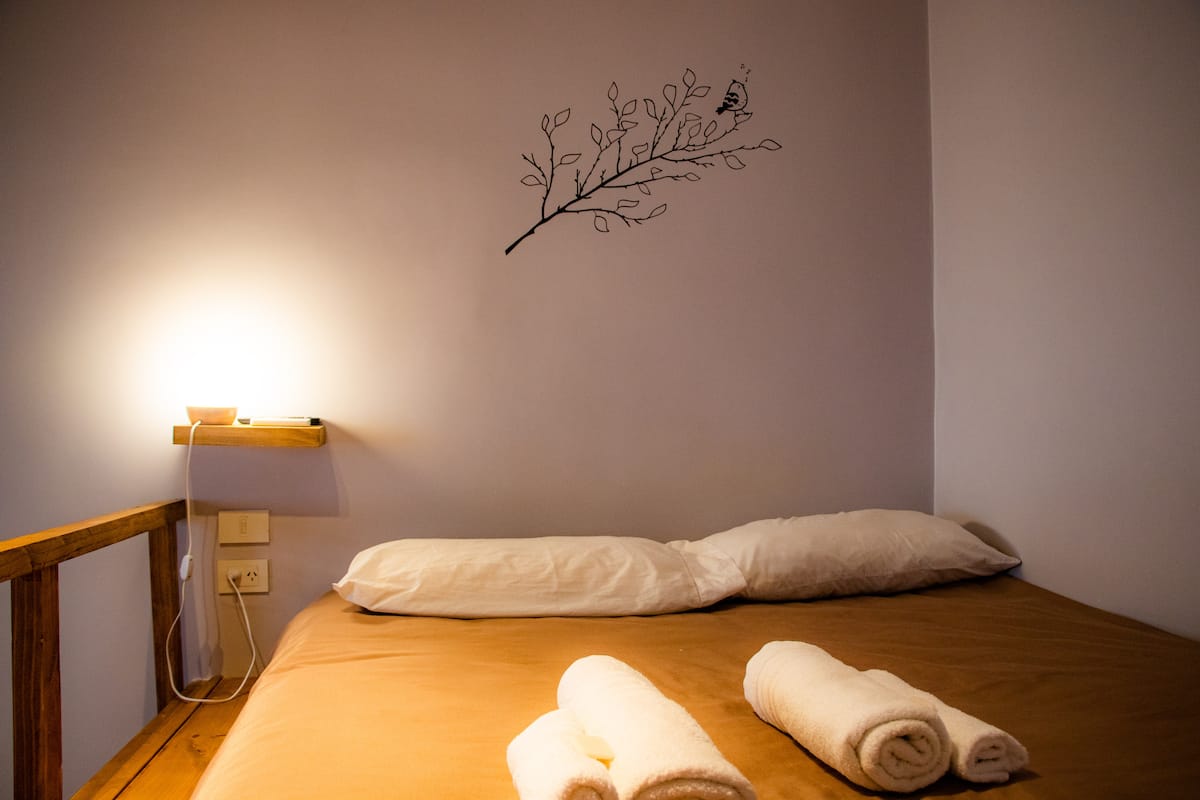 One-bedroom apartment with a double room, private bathroom and mezzanine, 18 m². The room includes a double bed, bedside table, work table with lamp, closet, air conditioning, cable TV and heating, plus an en-suite bathroom. The property is a renovated early-20th-century house with weekly cleaning and fast Wi-Fi; it also has independent heating and cable TV.