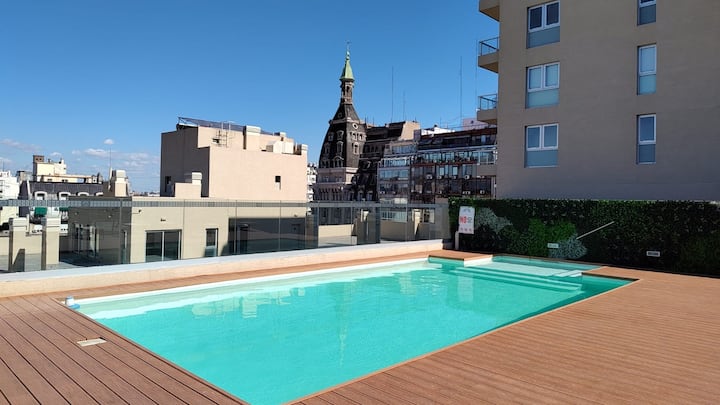 Apartment in Monserrat. The building has a heated swimming pool in winter, changing rooms, a solarium, a garden terrace, a coworking space, and a laundry room. It also offers a 24-hour front desk and security, with paid parking available.