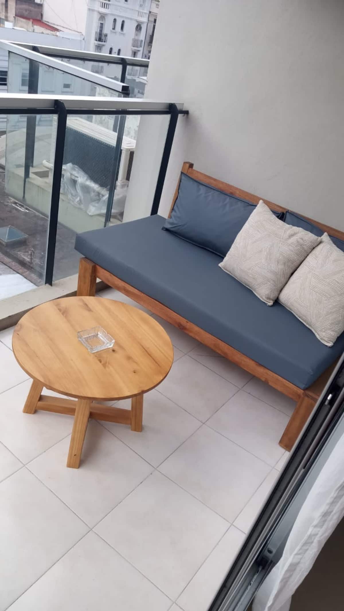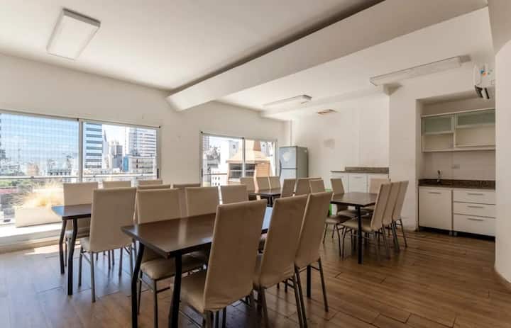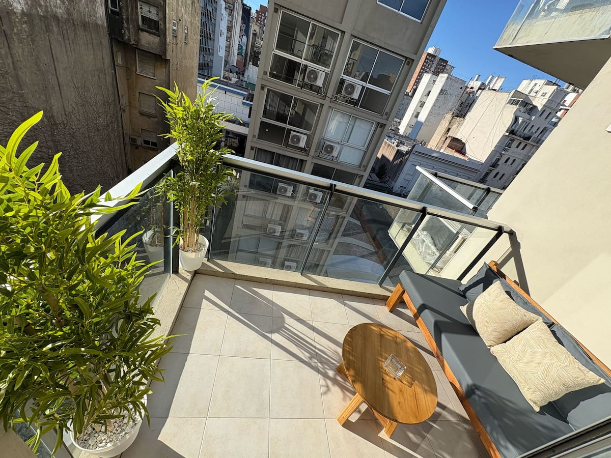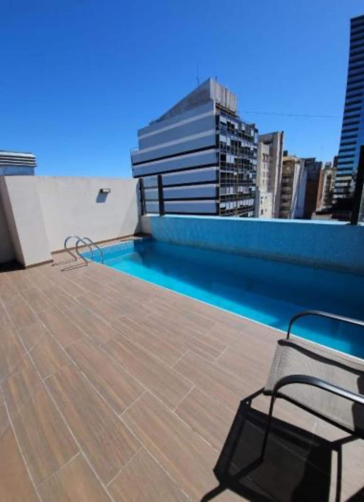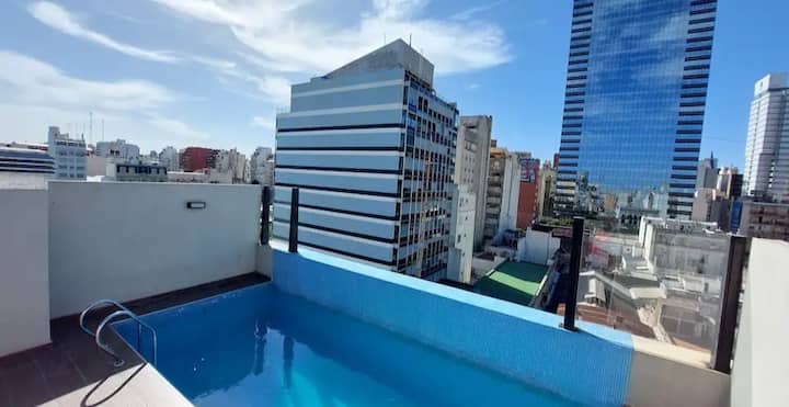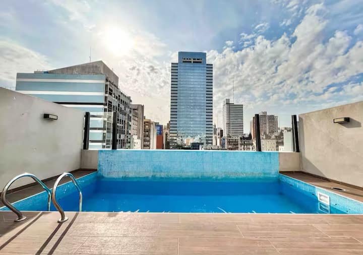 Studio apartment in Monserrat, 20 metres from Av. 9 de Julio. It is set on the seventh floor and includes a Queen XL bed (2 x 1.60 m), a kitchen for cooking, and a TV. The building has an outdoor area with tables and chairs, a grill, a pool, and a small gym, plus laundry with paid use.
