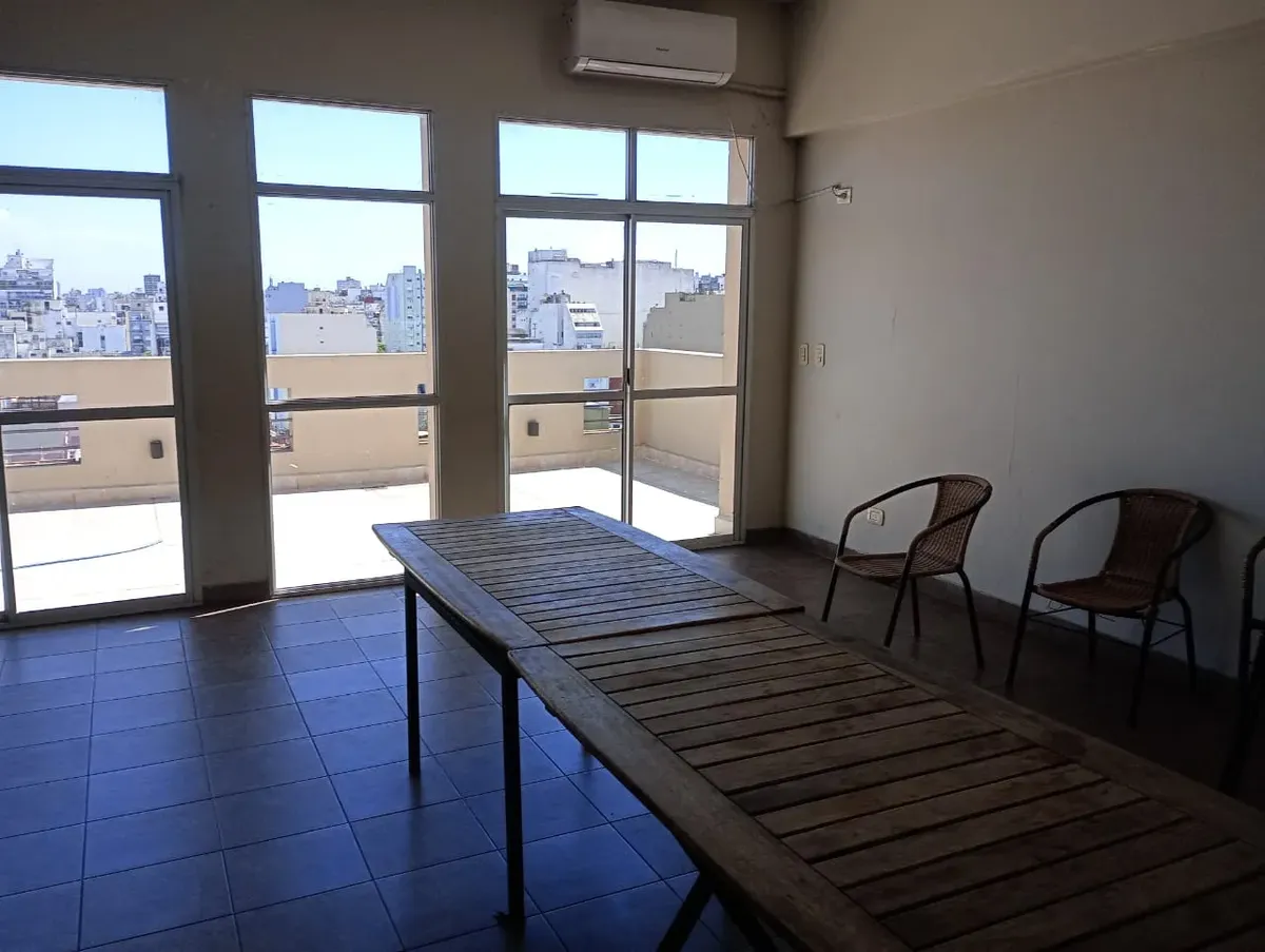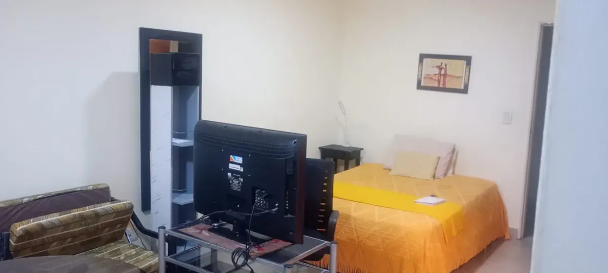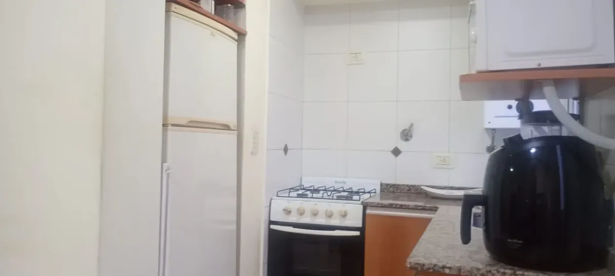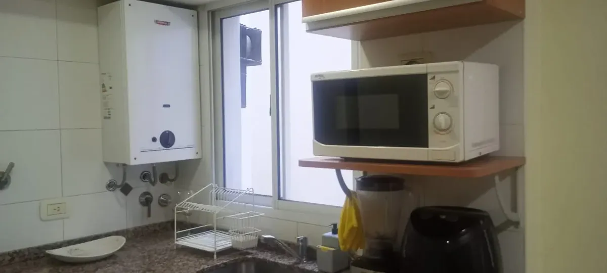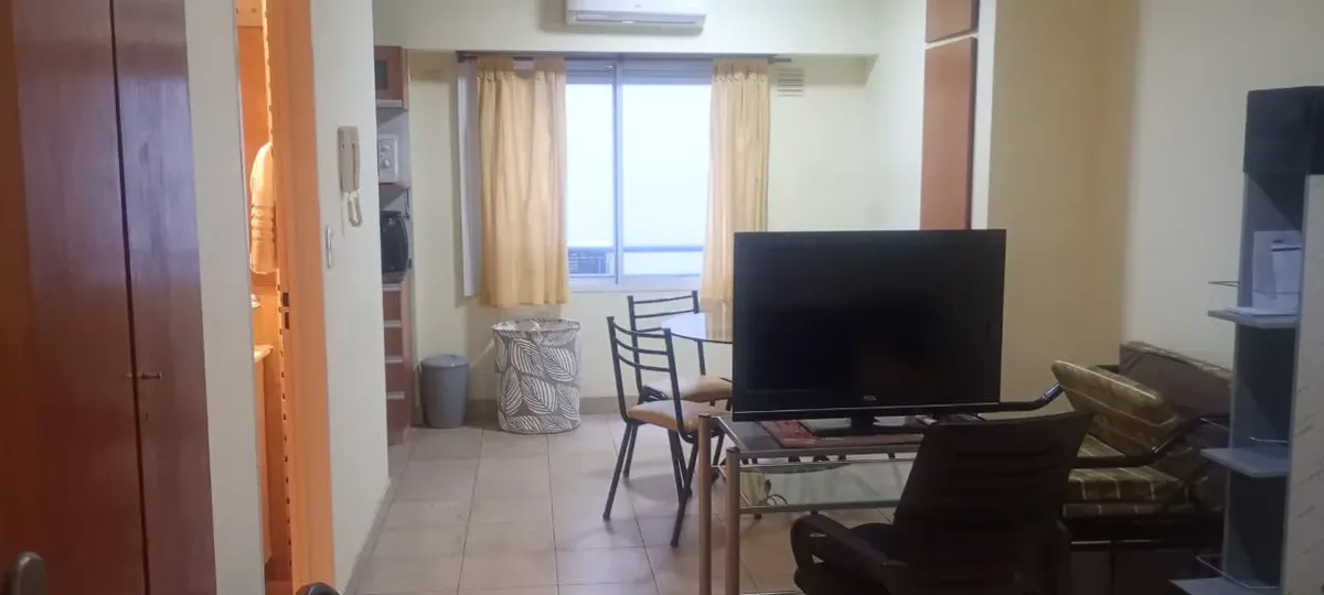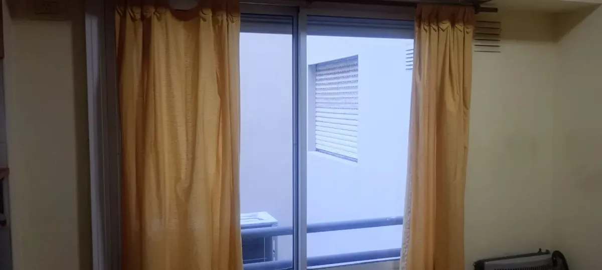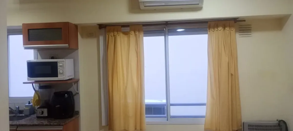 Studio apartment in Monserrat in a building with amenities. The main space combines the living, dining and sleeping area, with windows fitted with curtains. Separate kitchen equipped with an oven, microwave, storage cabinets and a hot-water tank; full bathroom and built-in closet. Building facilities include a residents’ lounge (SUM) with a covered grill area, a laundry area with a washing machine and dryer, and an uncovered pool with a solarium on the terrace.