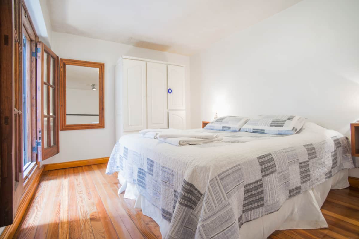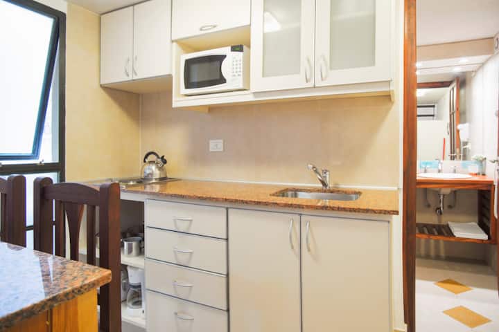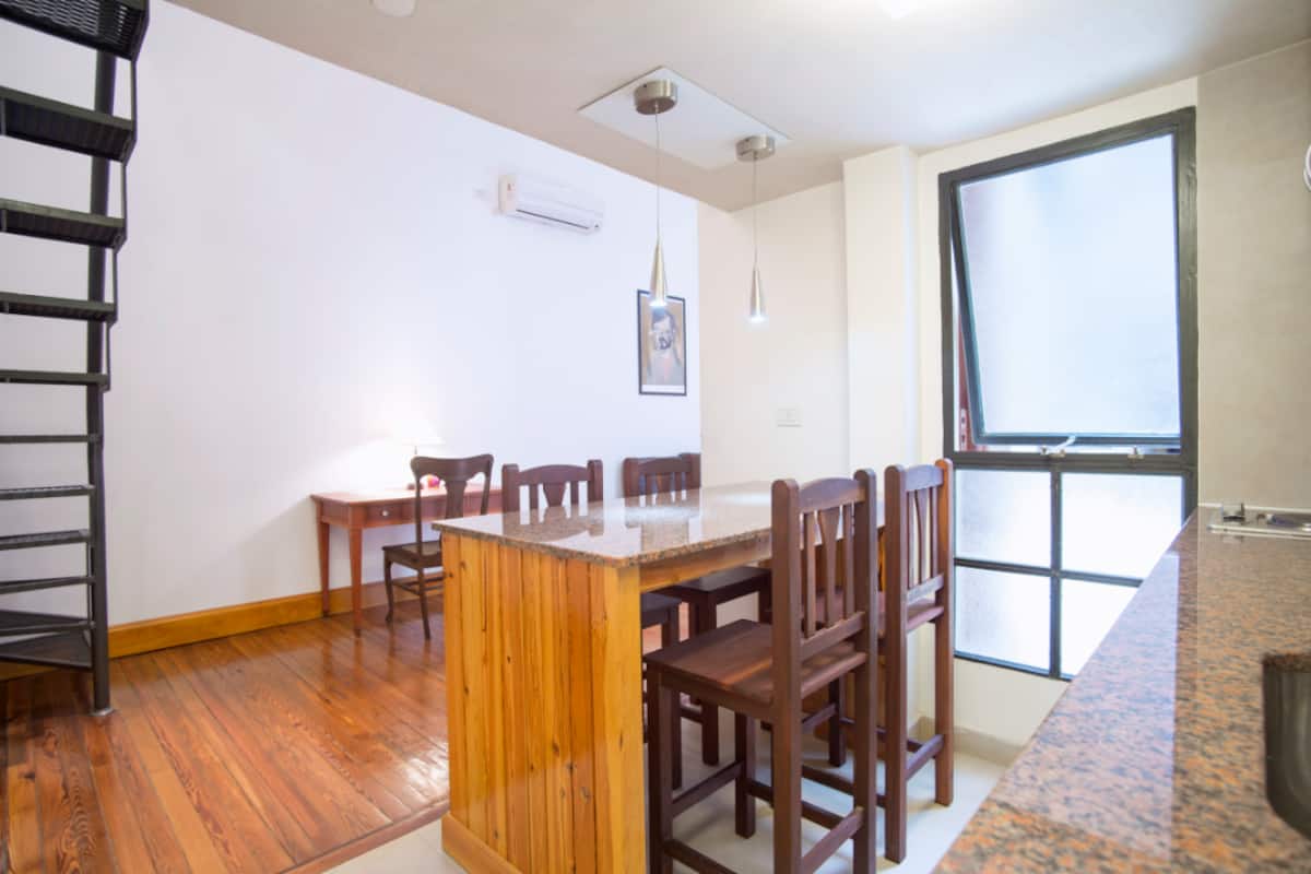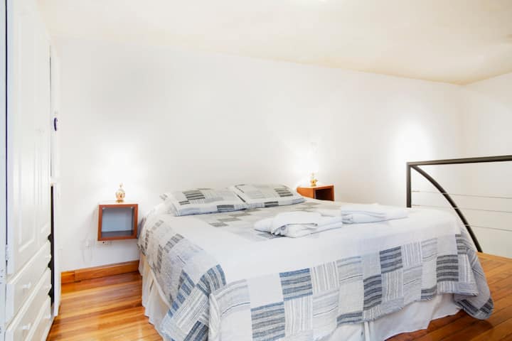 Apartment loft on the 2nd floor with elevator. It has a double bed, kitchenette and a full bathroom, plus access to a shared terrace. Check-in is from 1 PM and check-out is at 10 AM. Outdoor spaces are available until 10 PM, and shared facilities are for registered persons only.