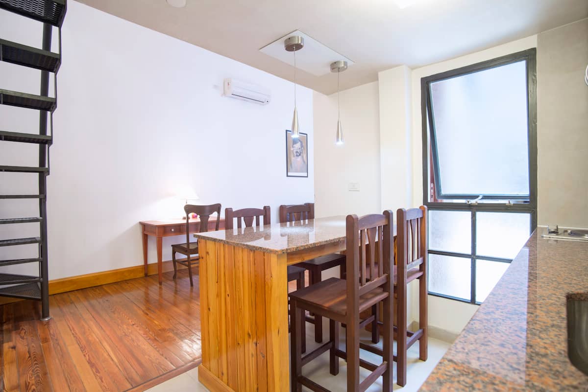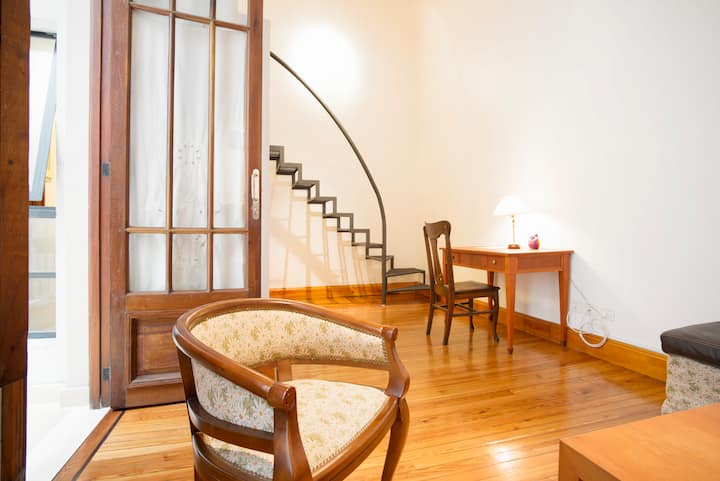 Studio apartment in an old building, fully refurbished, on the first floor with elevator access. Double-height ceiling. Ground-floor layout includes a living room, desk, fully equipped kitchen and bathroom; the upper level has a bedroom with a balcony. Terrace and solarium; slash pine floors and original wood openings.