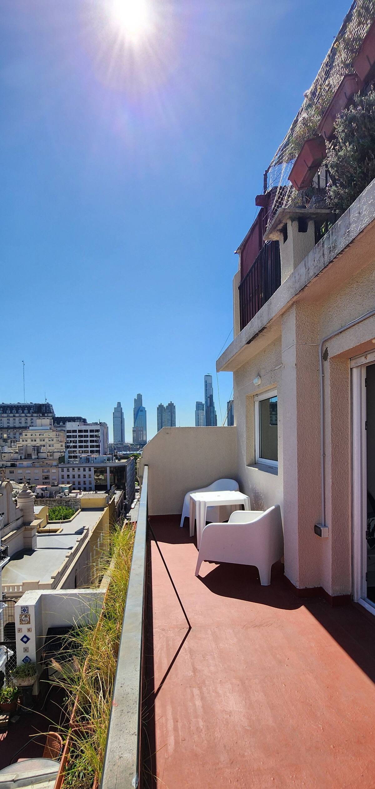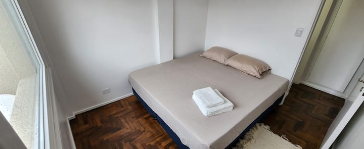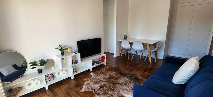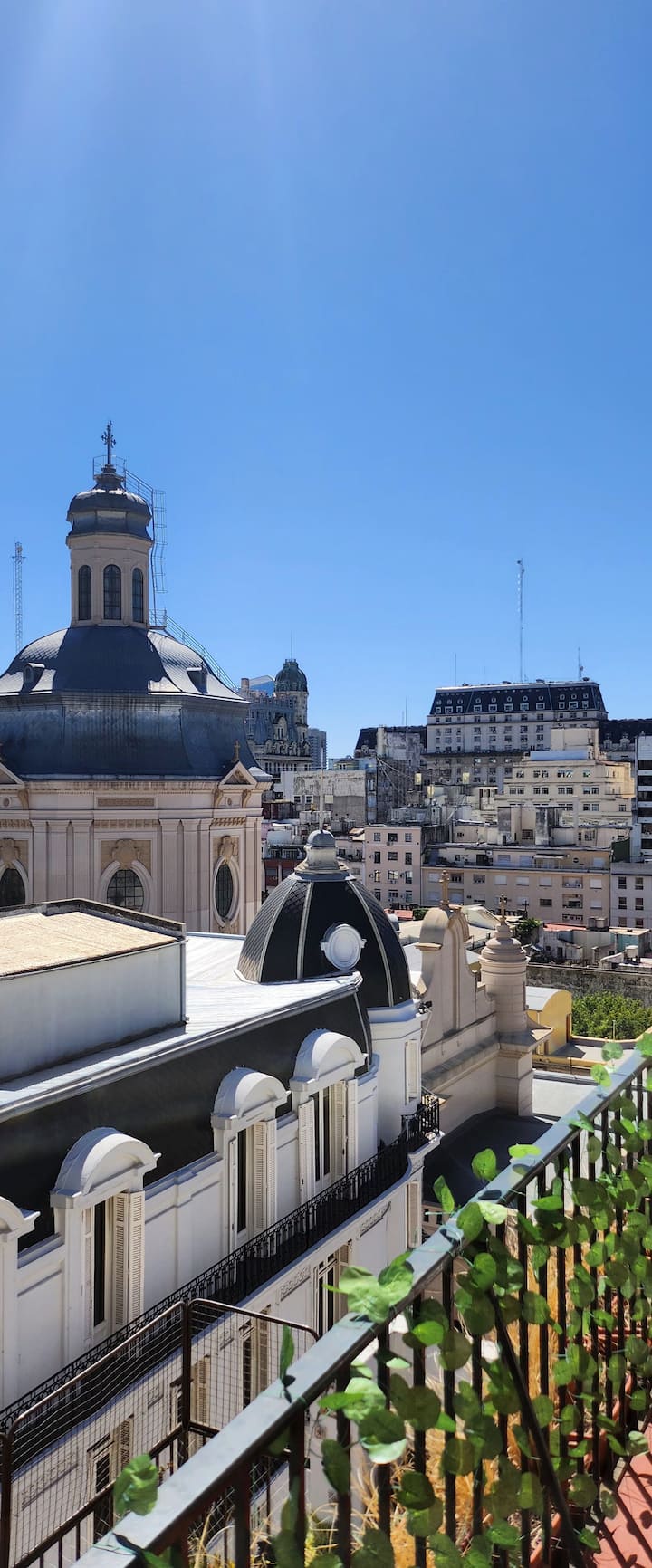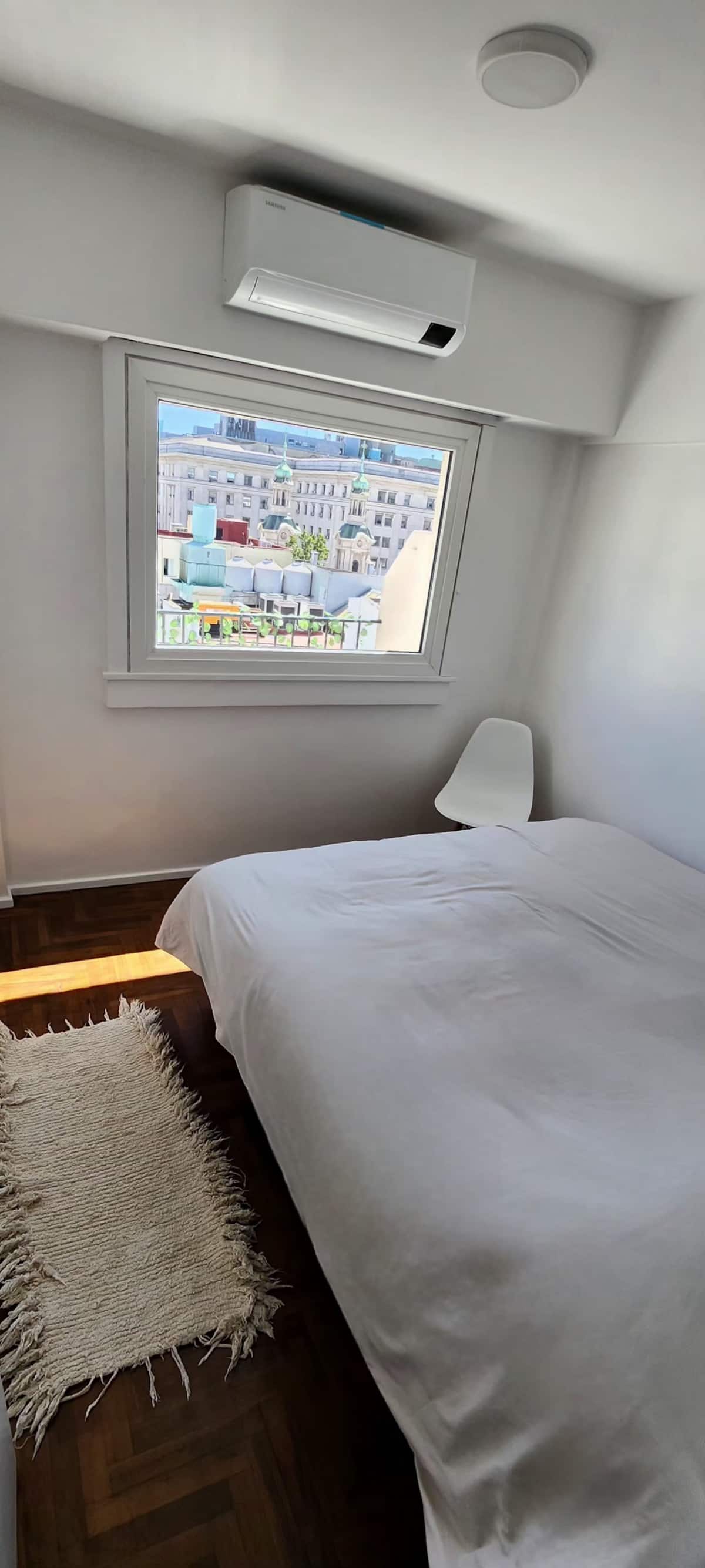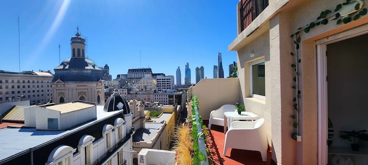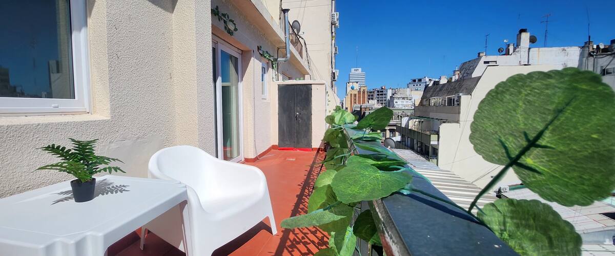 One-bedroom apartment with a living room and kitchen, with a spacious terrace. Located on the 10th floor, it is quiet and has PVC windows. Includes a fridge, microwave, toaster, kettle, Smart TV and WiFi, plus new Samsung air conditioning with heating and cooling. Two blocks from Plaza de Mayo in Monserrat.