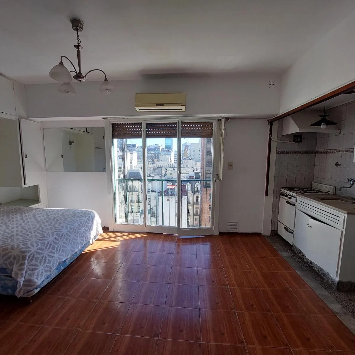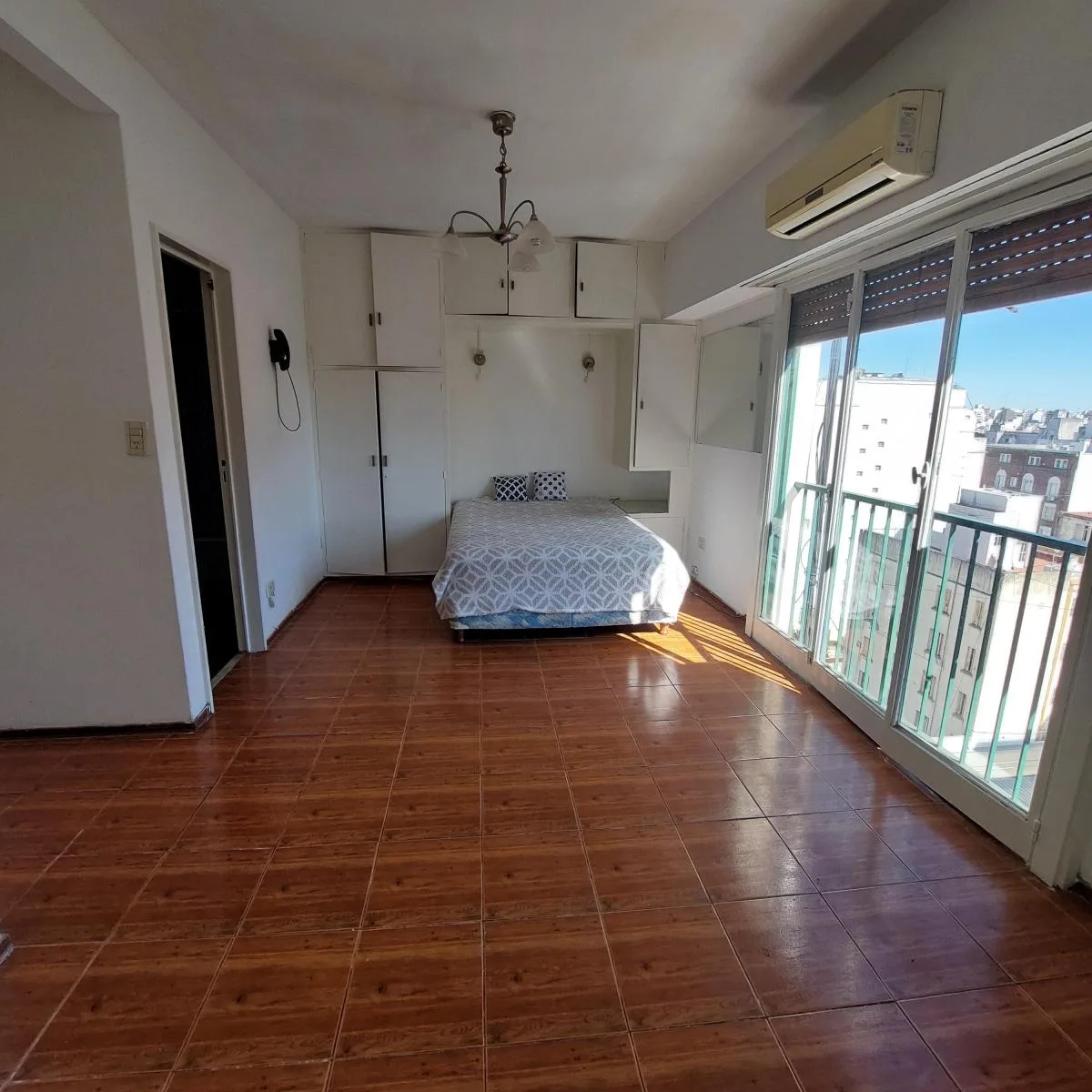 Studio apartment on the 12th floor, courtyard-facing (contrafrente) with a clear view. Includes a separate fitted kitchen with ventilation and a built-in laundry space (Spar), a large full bathroom, and a built-in wardrobe. Air conditioning and a TV wall fitting (aplique) are included. The building has private security, a permanent caretaker and a bright shared terrace. Rental guarantee bond is required, either through a backed surety or Finaer.