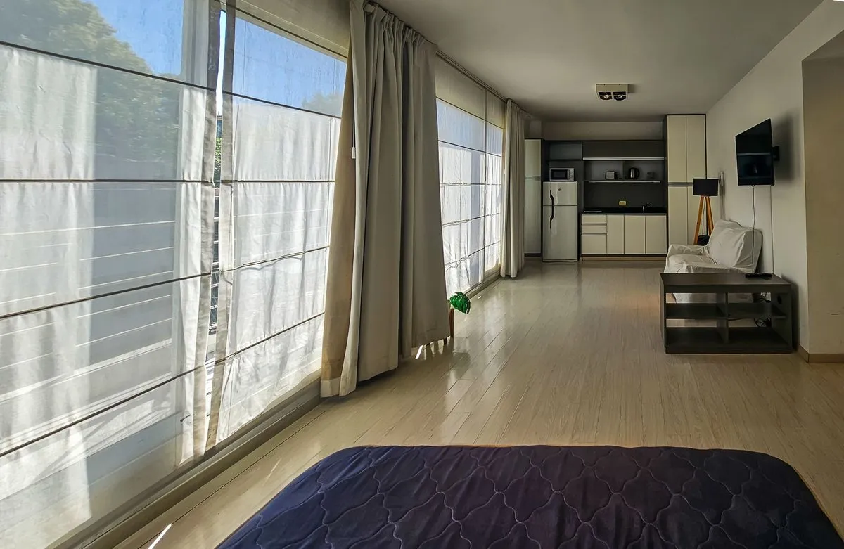Studio apartment for rent in Núñez. 37 m² total, street-facing, with air conditioning. Furnished and equipped with a kitchenette integrated into the living-dining area, full bathroom, built-in wardrobe, and a balcony facing northwest with large windows. Includes a toaster, electric kettle, microwave, fridge, and basic tableware and utensils. Rental terms: deposit of USD 1200 and first month paid in advance; requires a CABA property guarantee or a rental insurance bond, with proof of income; rent