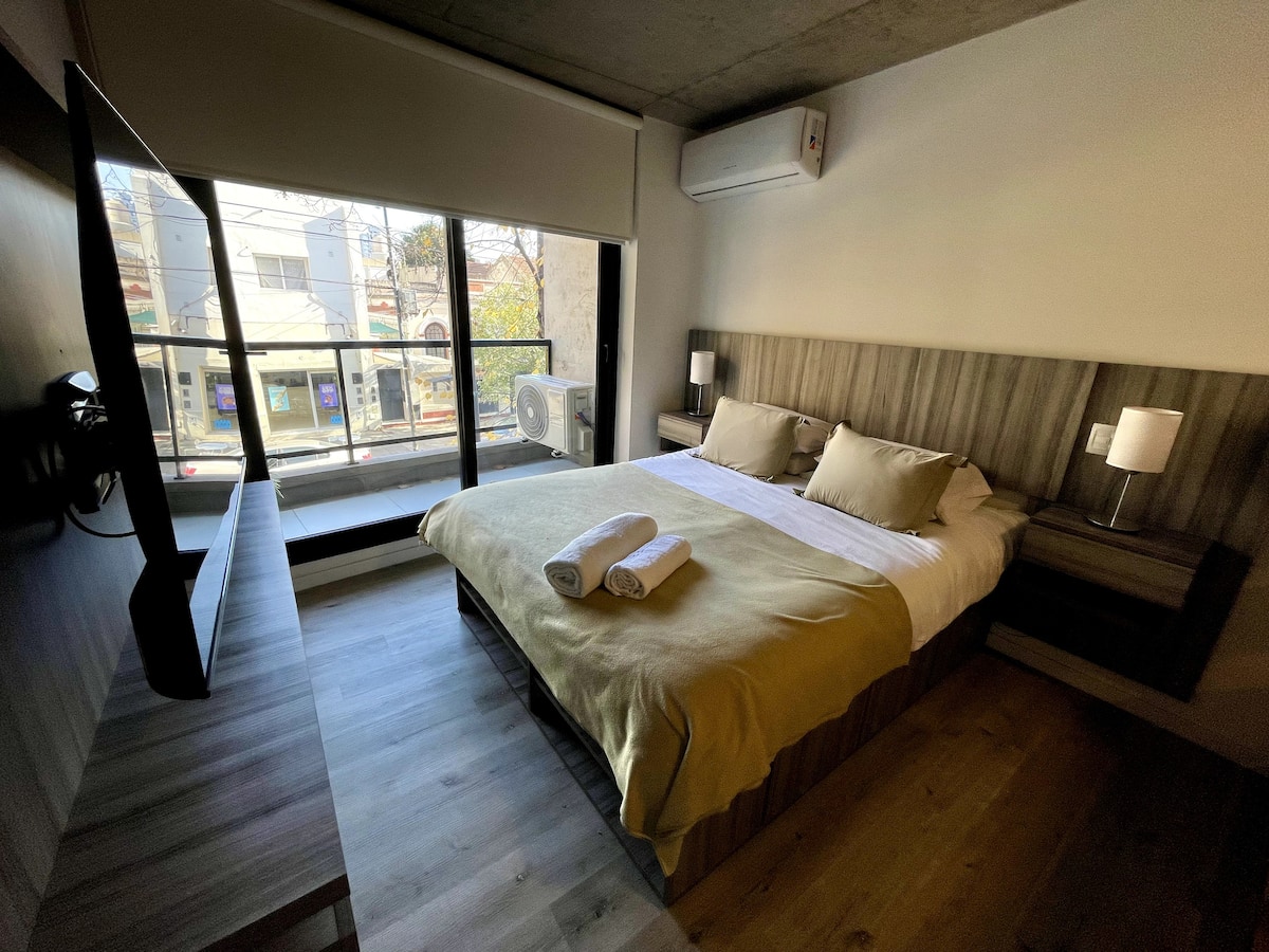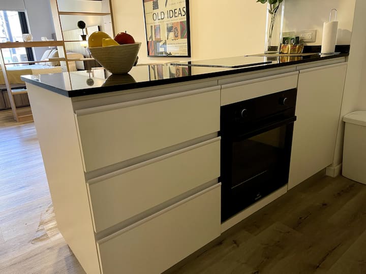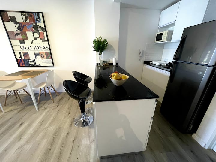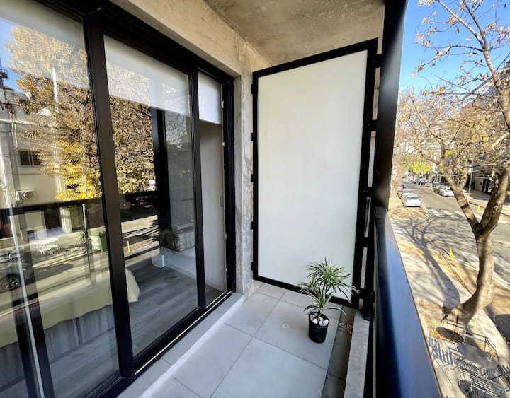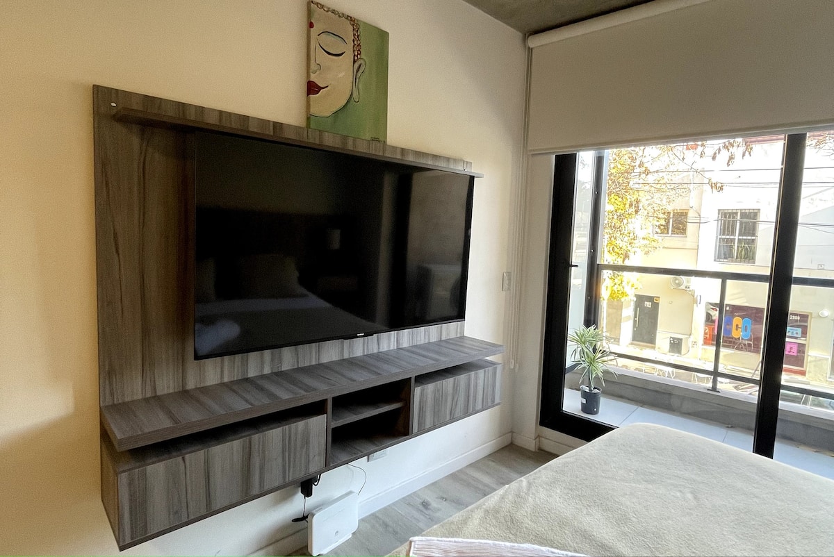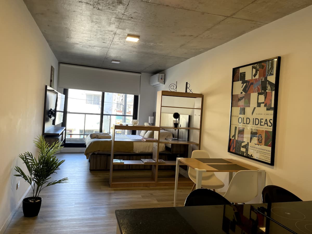Studio apartment with a balcony in Núñez, with 1 full bathroom and a divider that separates sleeping and living areas. The kitchen includes a breakfast bar and a daily dining area for 4 with modern appliances. Amenities include a smart TV, heating and cooling air conditioning, and roller curtains with black-out and screen options. Laundry is available in the building’s first basement.
