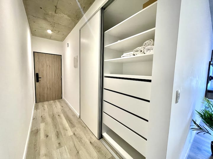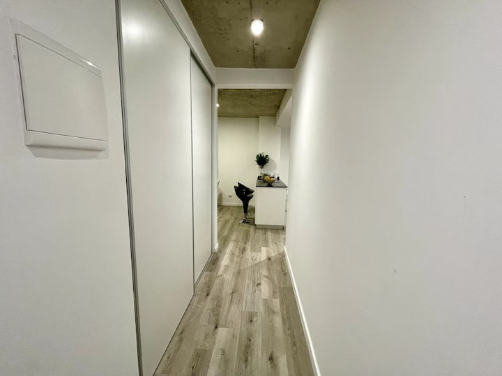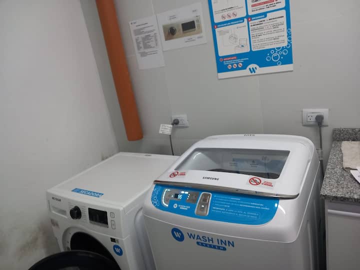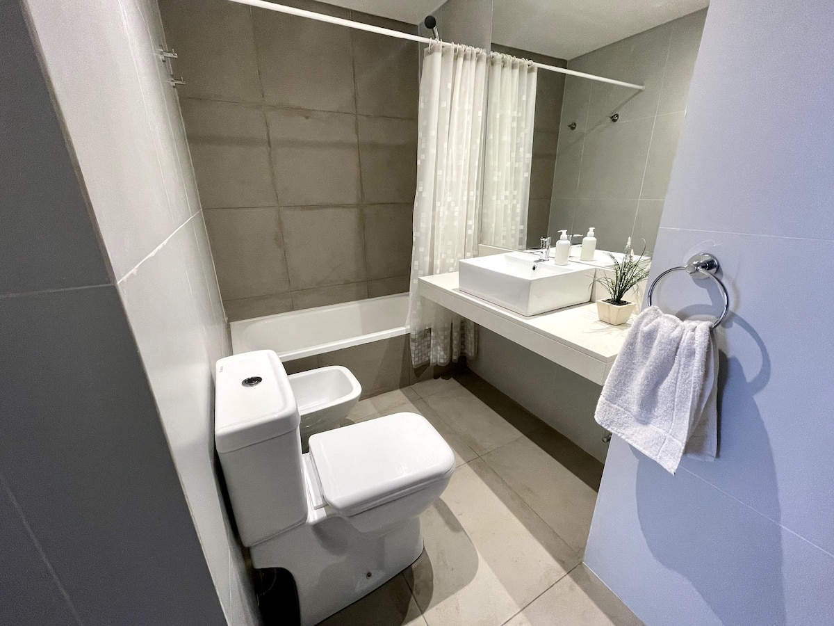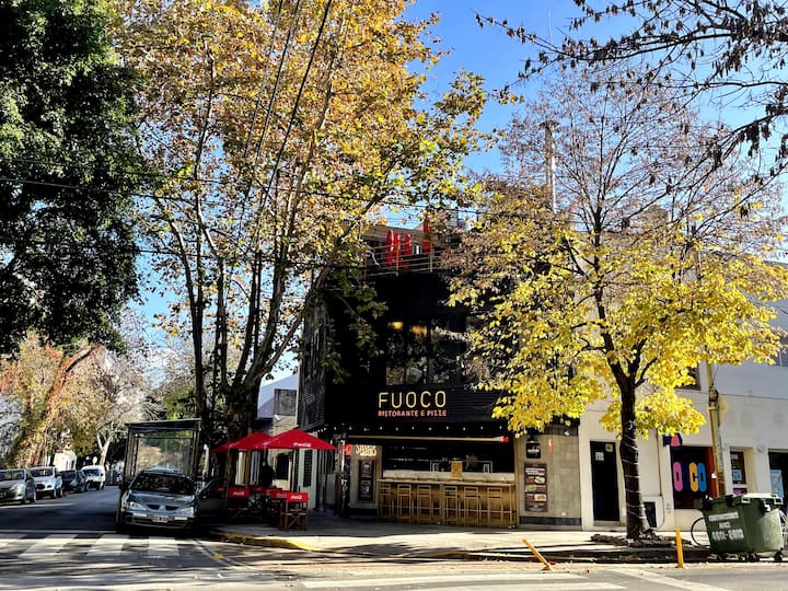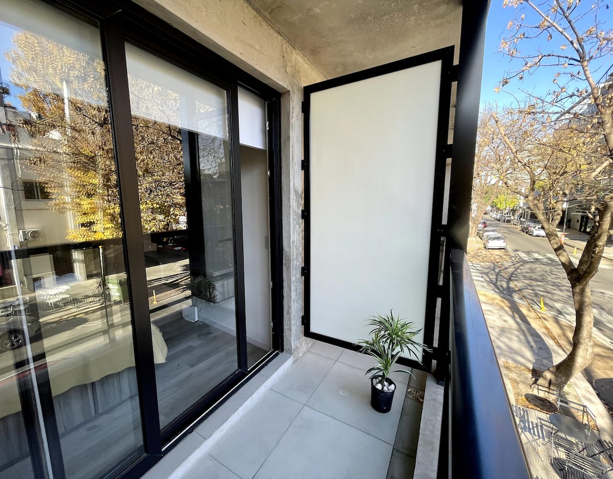 Studio apartment with a balcony in Núñez, with 1 full bathroom and a divider that separates sleeping and living areas. The kitchen includes a breakfast bar and a daily dining area for 4 with modern appliances. Amenities include a smart TV, heating and cooling air conditioning, and roller curtains with black-out and screen options. Laundry is available in the building’s first basement.