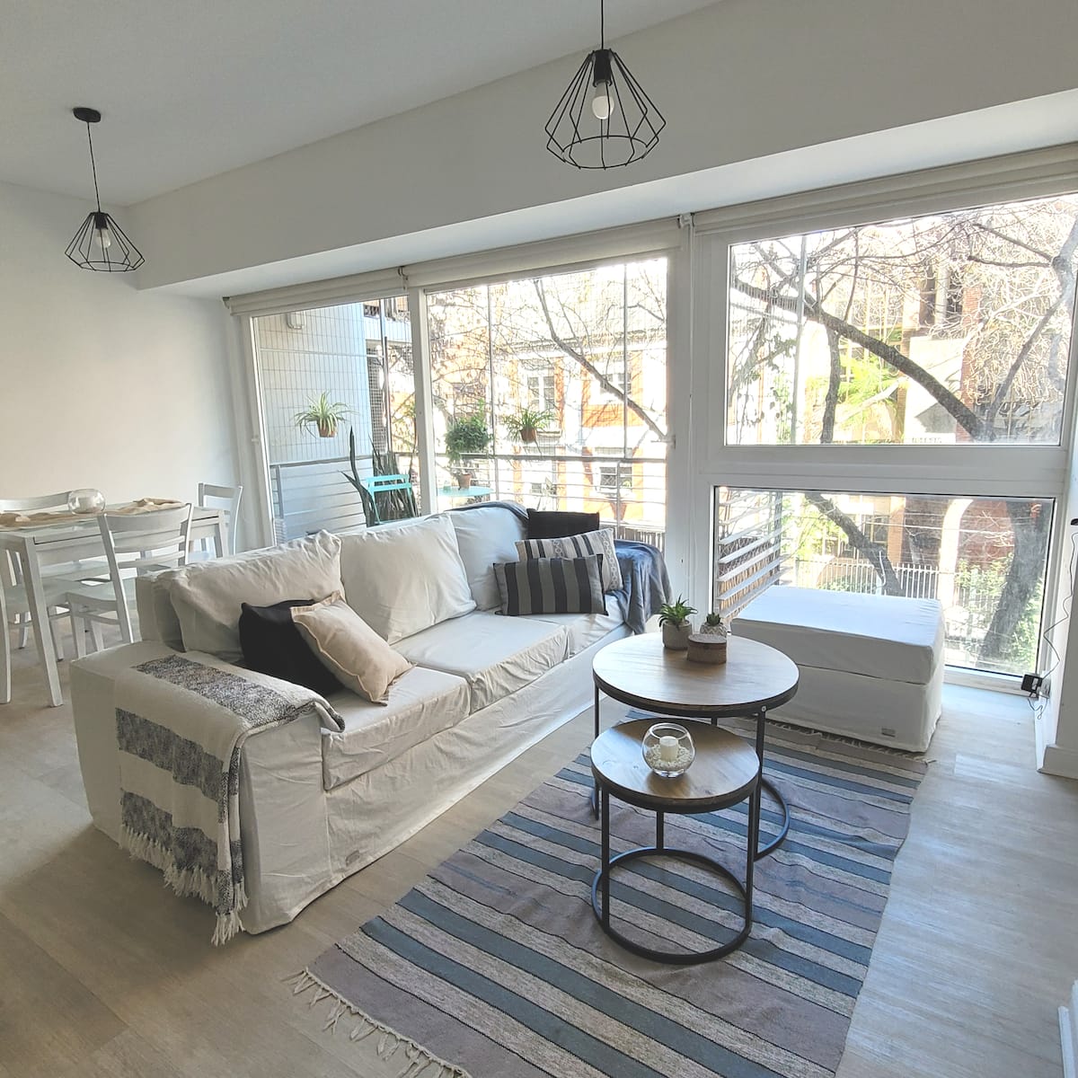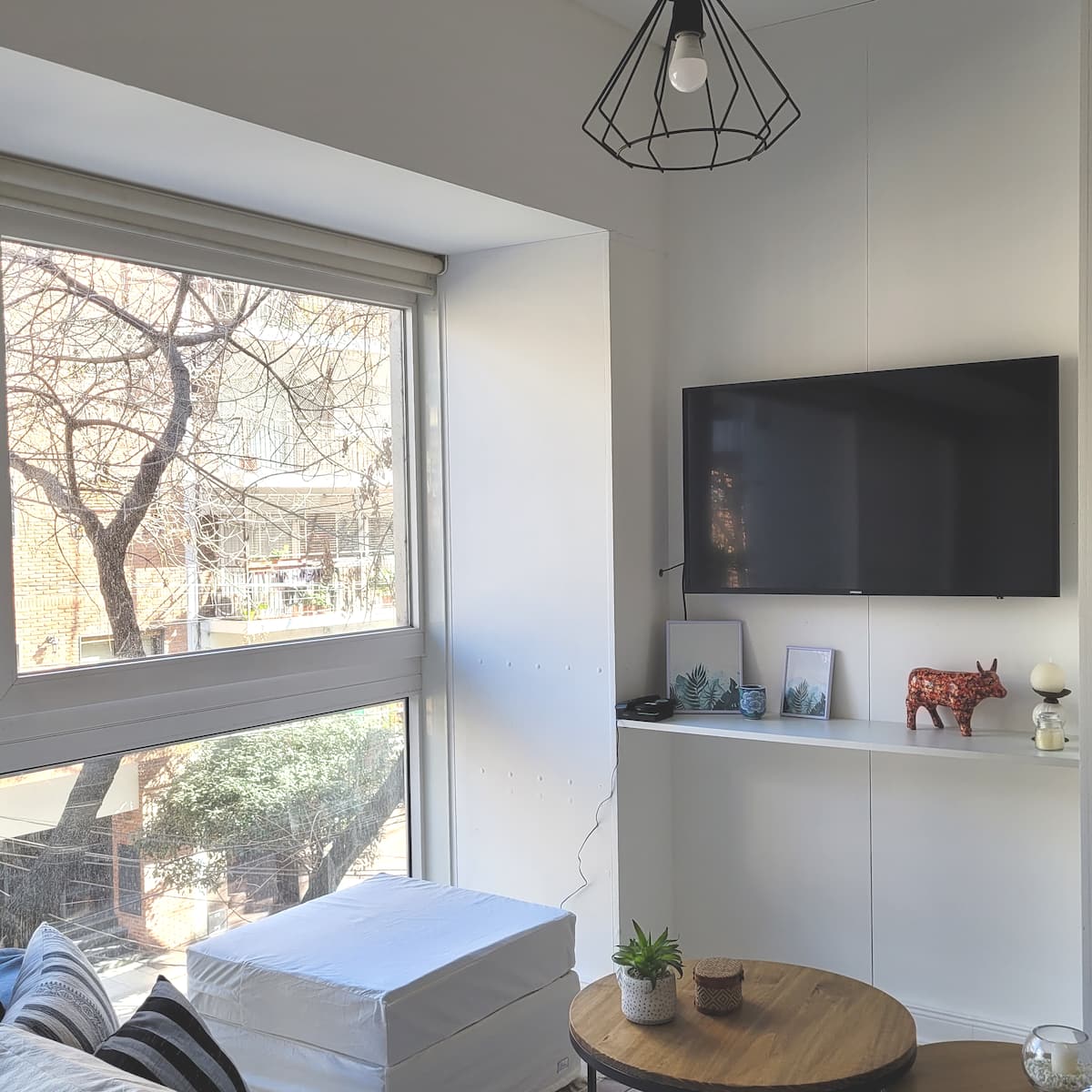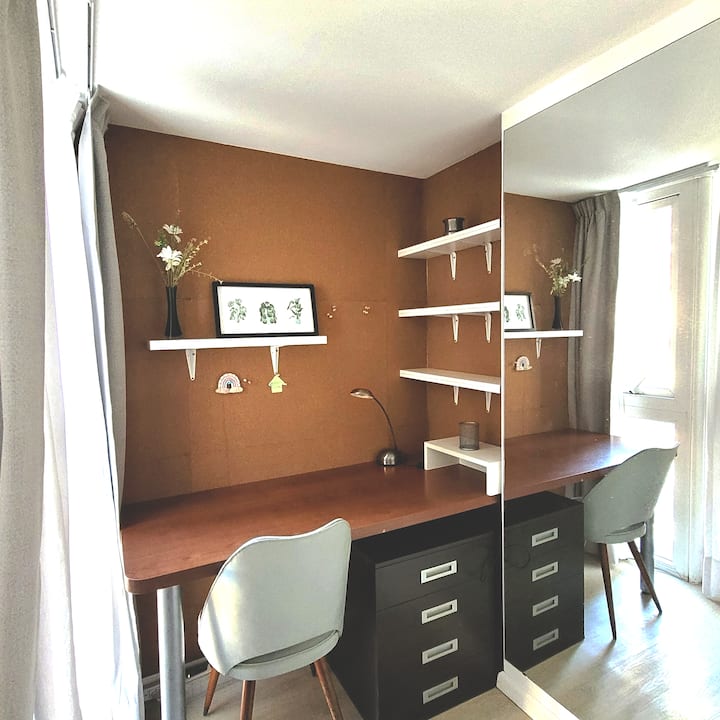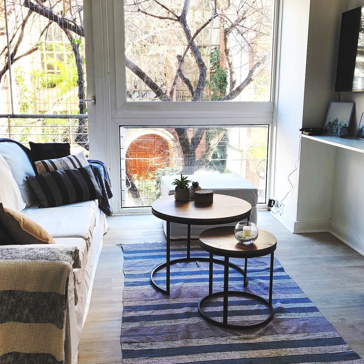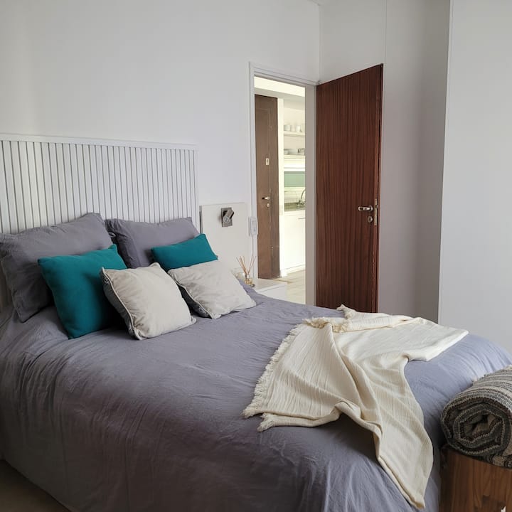 Two-room apartment in Núñez with 1 bedroom. It has a double bed and a desk, plus a living-dining room and a balcony. The apartment is bright and includes air conditioning, a TV and WiFi. The listing mentions that it is on a busy street, a few metres from cafes and parks, and about 5 blocks from the D-line subway.