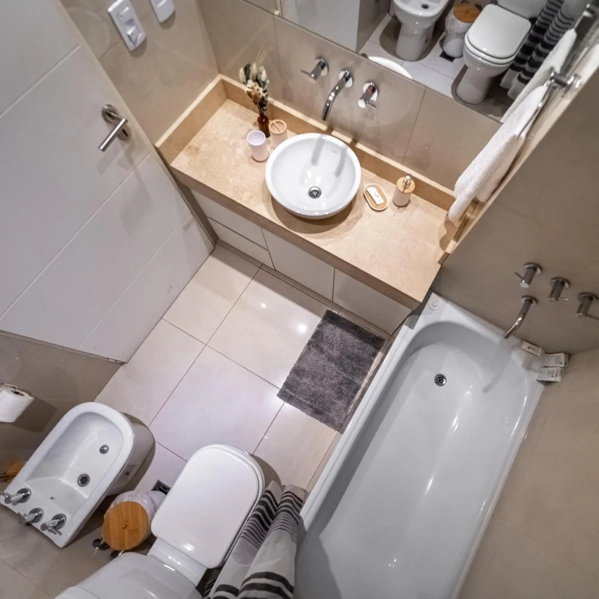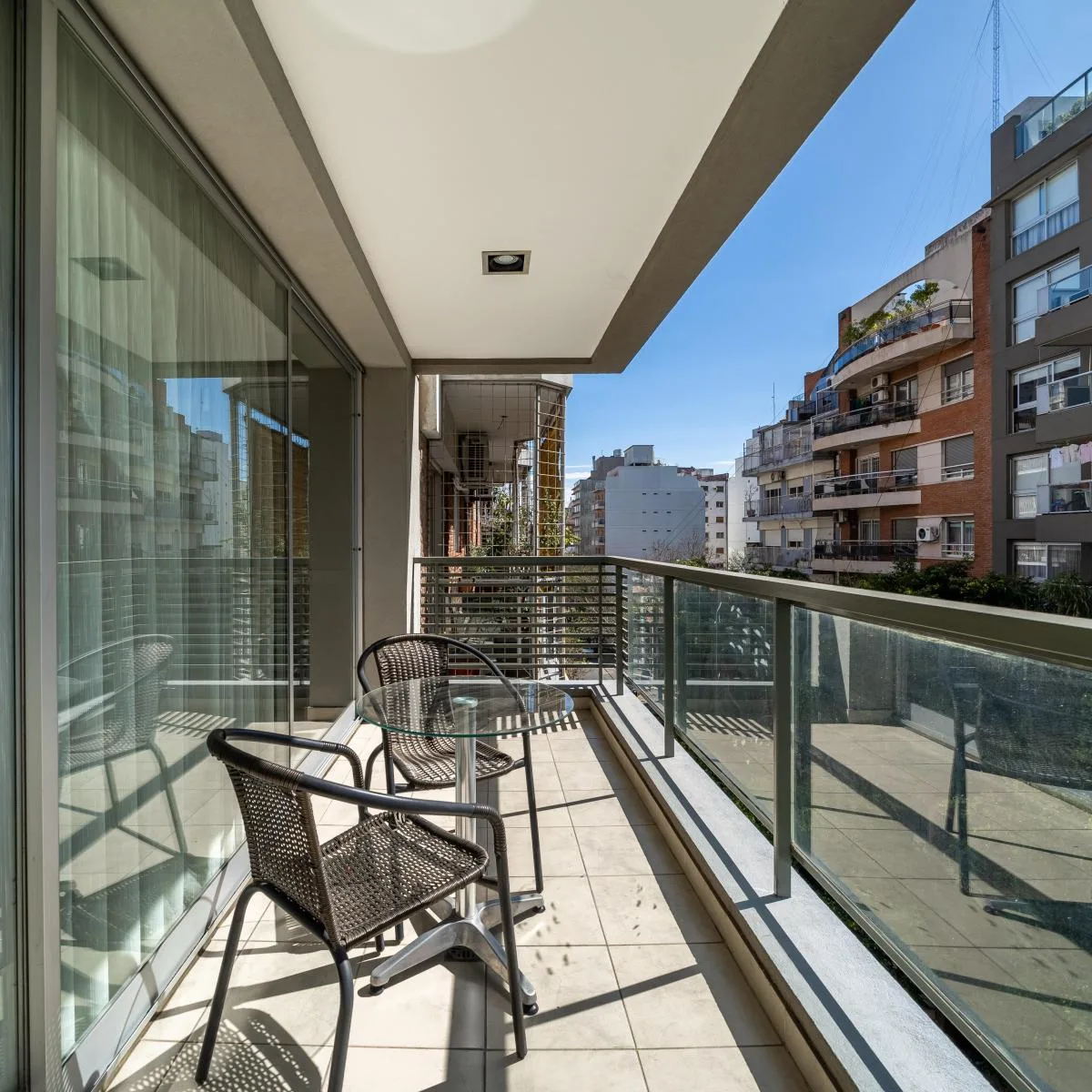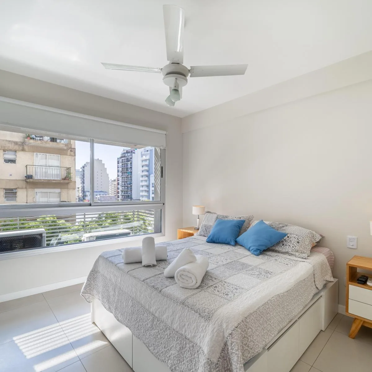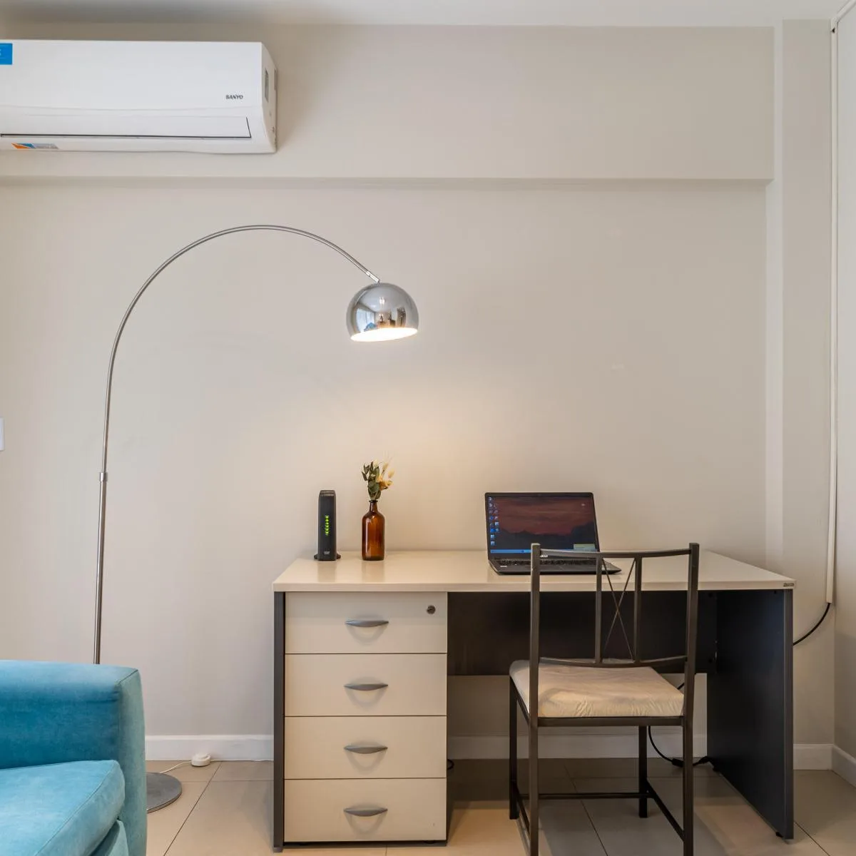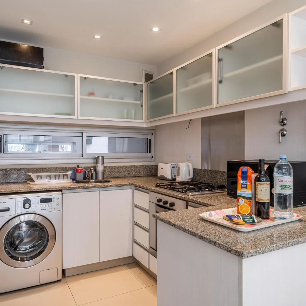 Two-room apartment with a balcony in Núñez. It has 1 bedroom with a Queen-size bed and drawers, a full bathroom with shower or bathtub and a bidet, and a separate guest bathroom. The living and dining area includes a desk for working, and the kitchen is fully equipped with a washing machine. Amenities include cable TV, Wi-Fi internet, air conditioning, heating, hot water, linens, cooking utensils, dishes and cutlery, a hair dryer, an iron and blackout blinds or curtains, a coffee maker, and a re