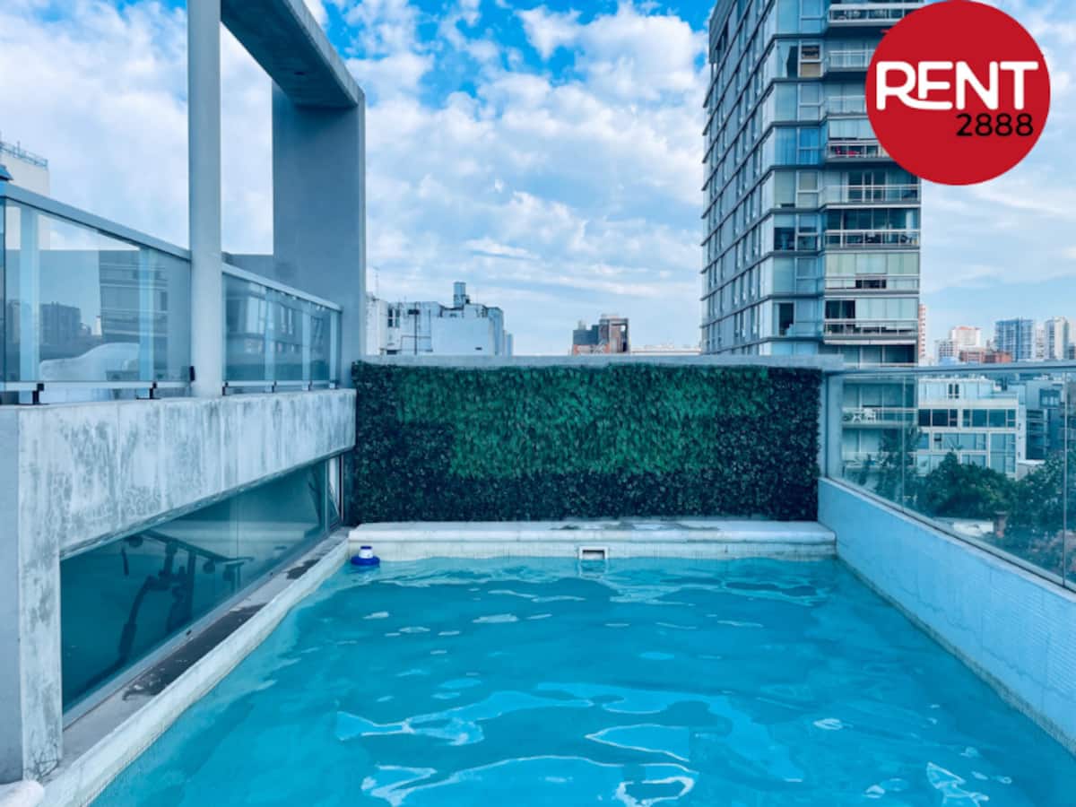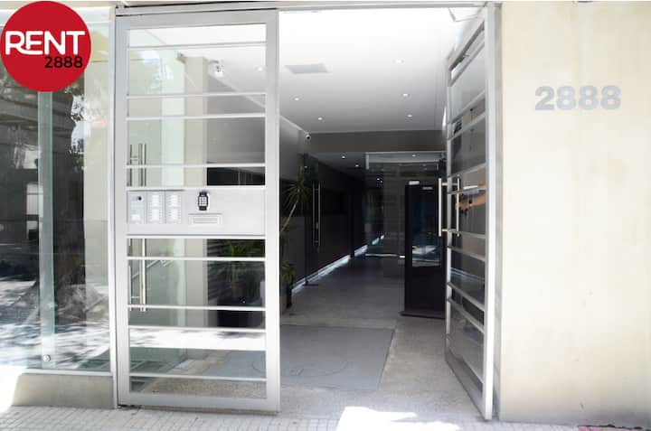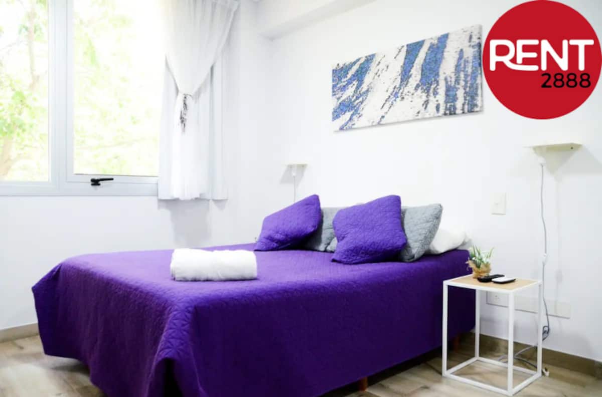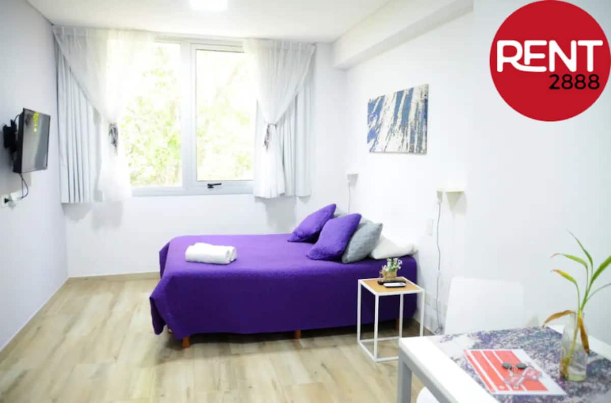 Studio apartment with a street-facing view, located in Núñez. The unit includes a double bed, a private bathroom, and a kitchen equipped for cooking. Building services include WiFi, a Smart TV, and air conditioning for heating and cooling, plus on-site security. Guests have access to the laundry room on the 10th floor, where washing and drying require Lava Ya tokens; the pool is on the 7th floor of the twin building on the same block and is accessible via a digital key.