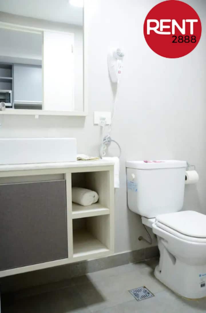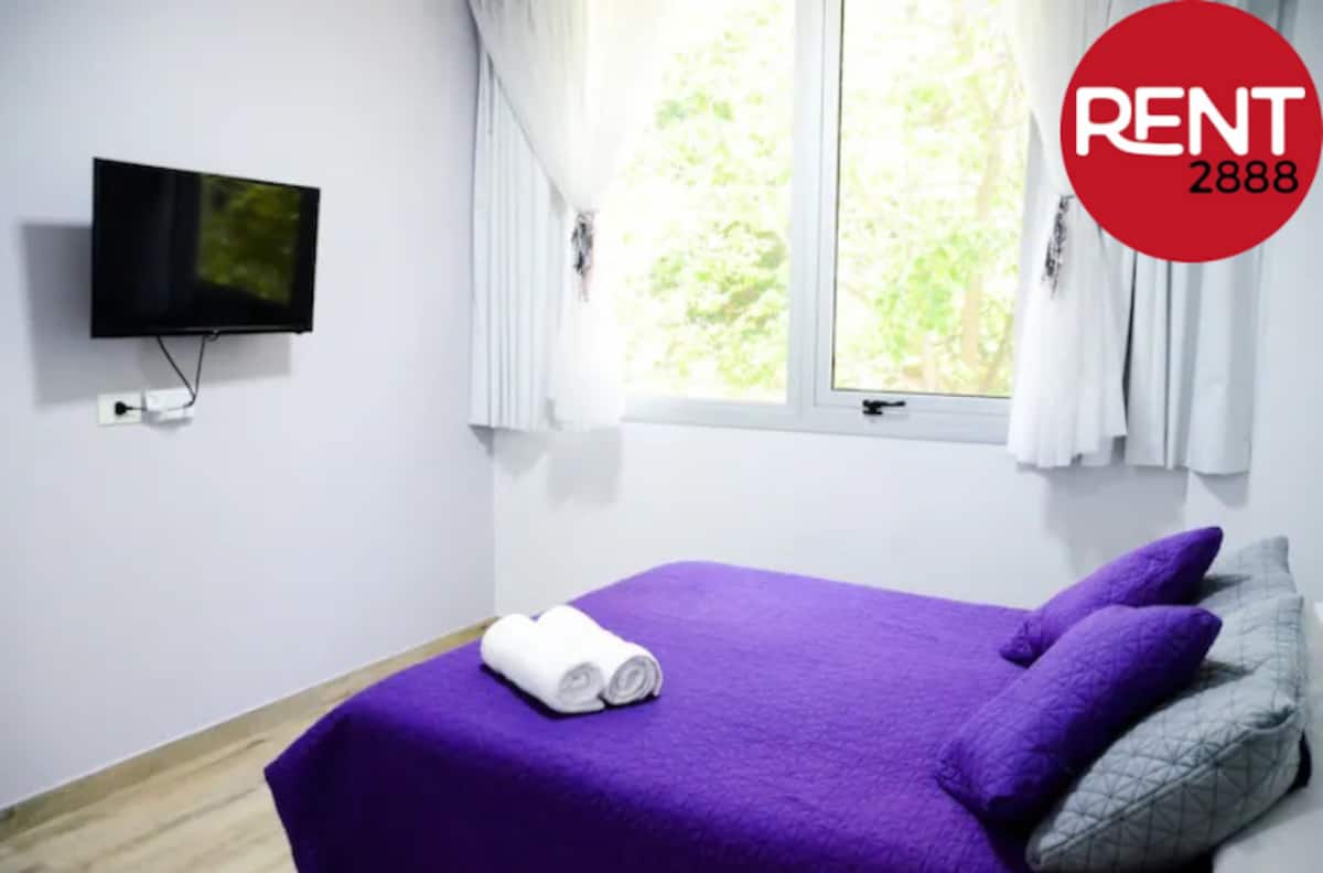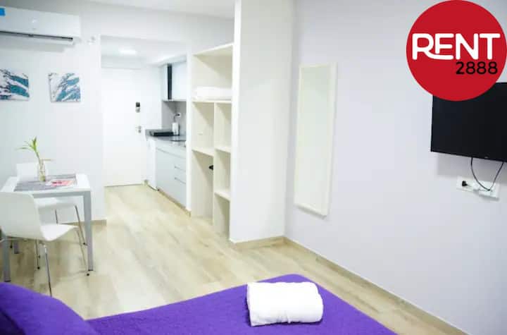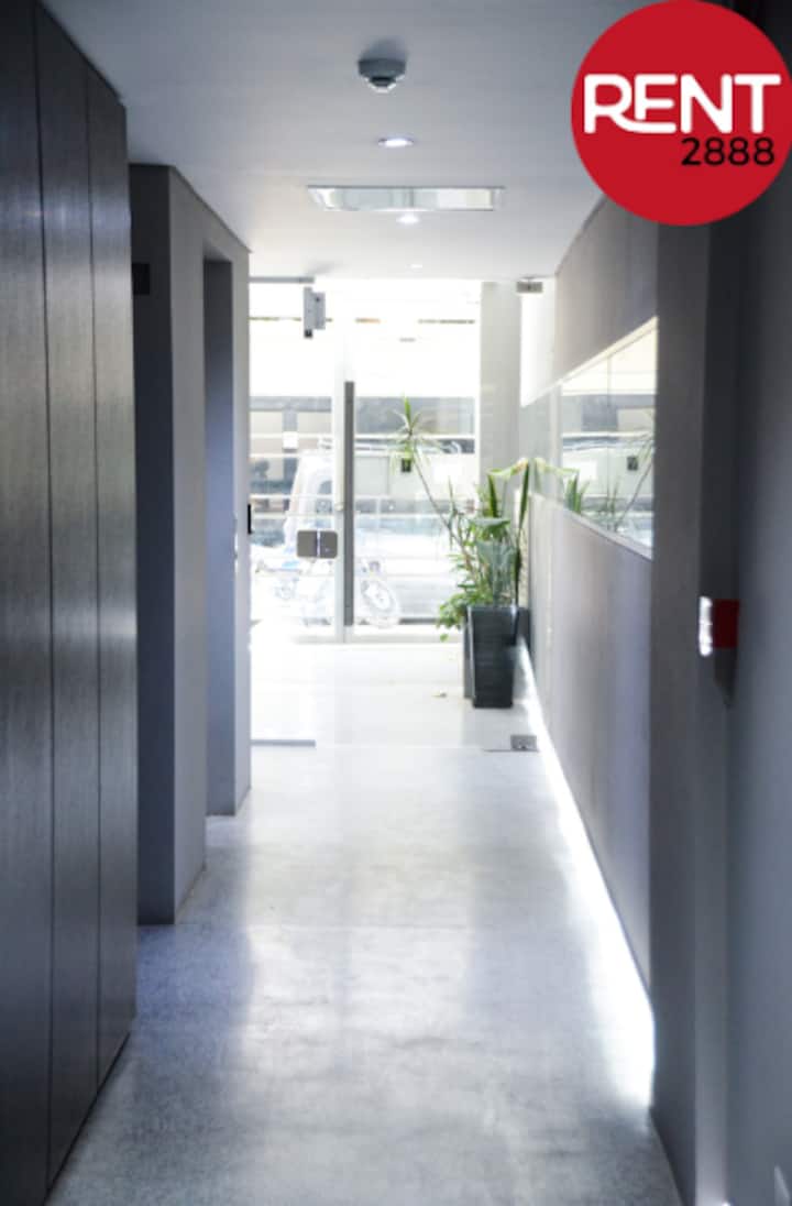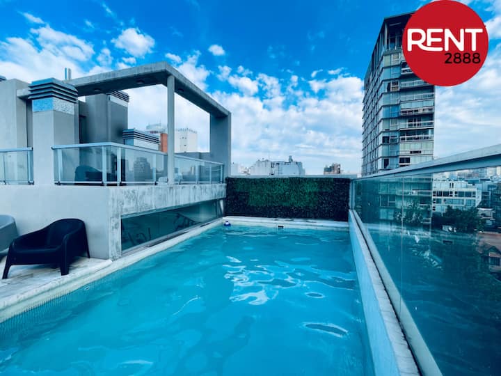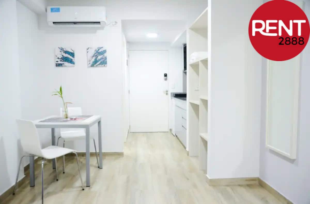 Studio apartment with a street-facing view, located in Núñez. The unit includes a double bed, a private bathroom, and a kitchen equipped for cooking. Building services include WiFi, a Smart TV, and air conditioning for heating and cooling, plus on-site security. Guests have access to the laundry room on the 10th floor, where washing and drying require Lava Ya tokens; the pool is on the 7th floor of the twin building on the same block and is accessible via a digital key.