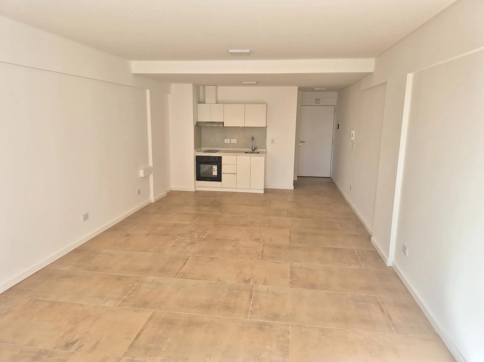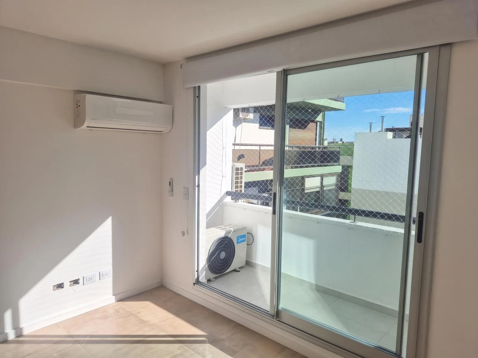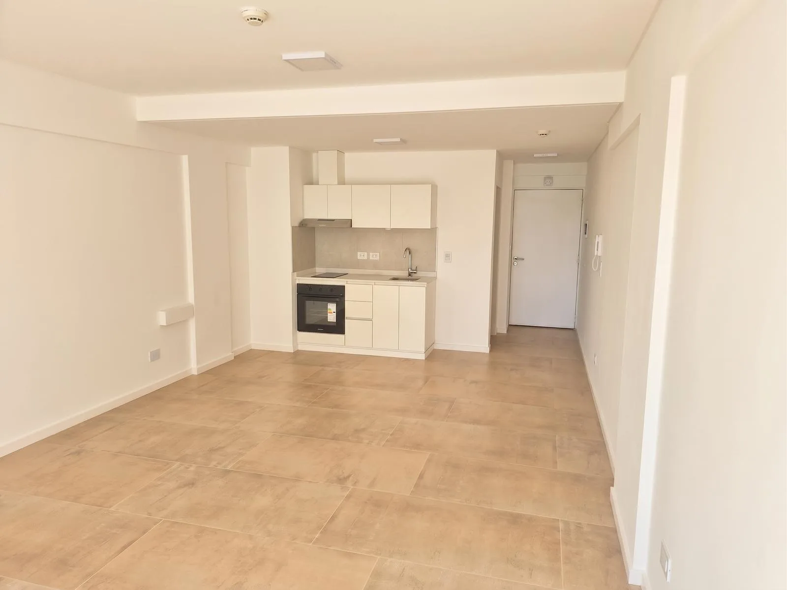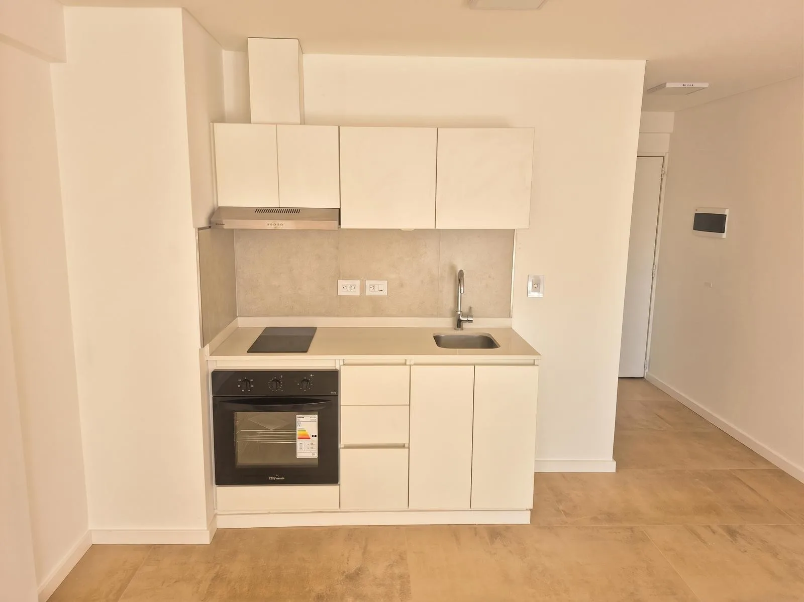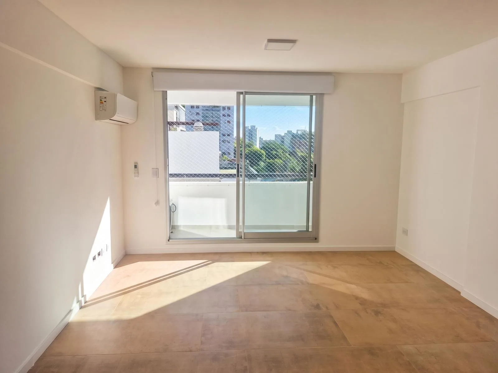Studio apartment that can be divided, 42 m² total (35 m² covered) on the 5th floor, courtyard-facing with a balcony. Unfurnished and brand new. Includes an integrated kitchen, a full bathroom, and a main area divided for a living room and sleeping space, plus a balcony with safety netting. Building has central hot water, DVH double-glazed windows, multi-split hot/cold air conditioning, and facilities including an infinity pool with sun deck and grill, residents' lounge with co-working and garden
