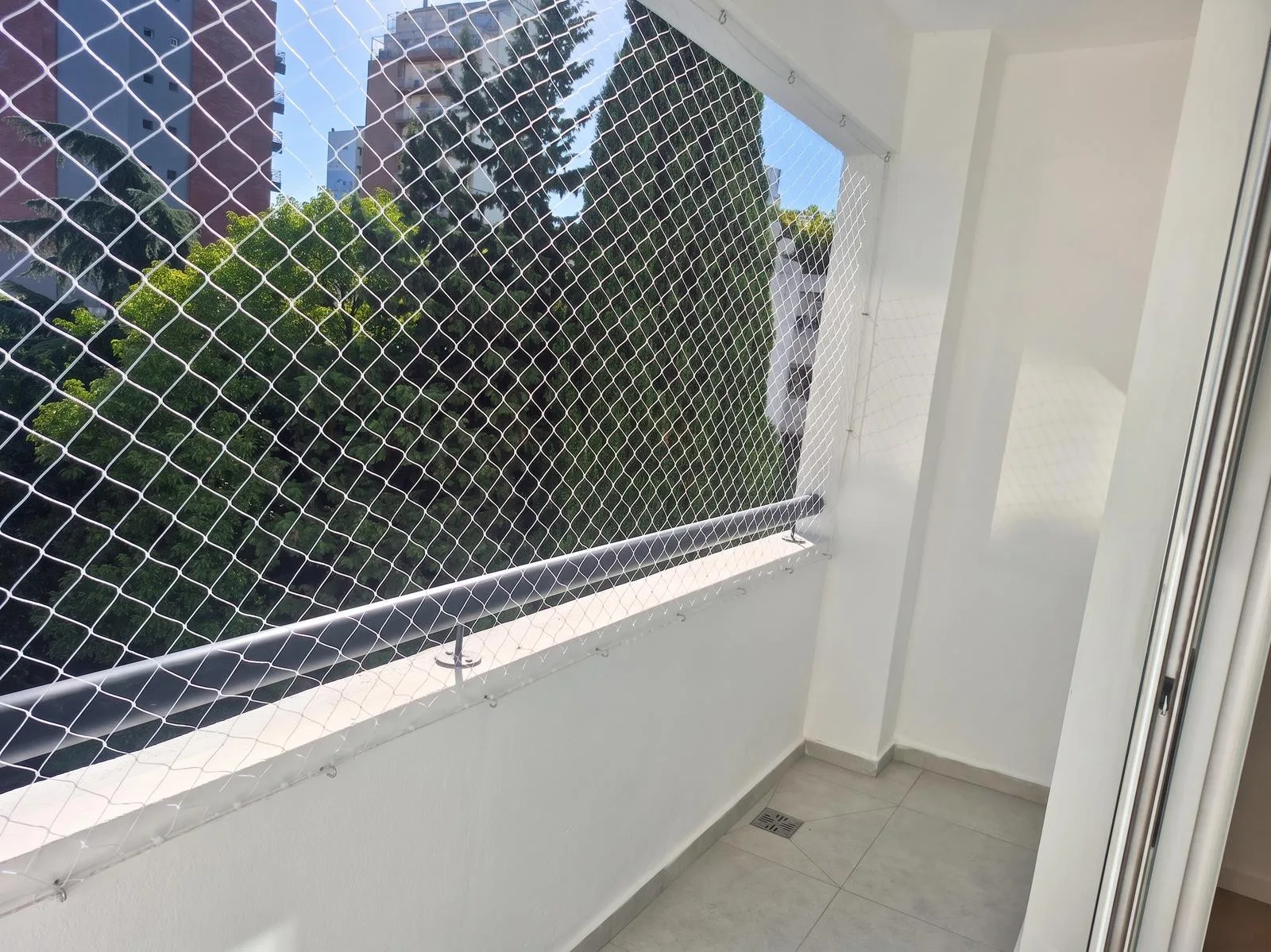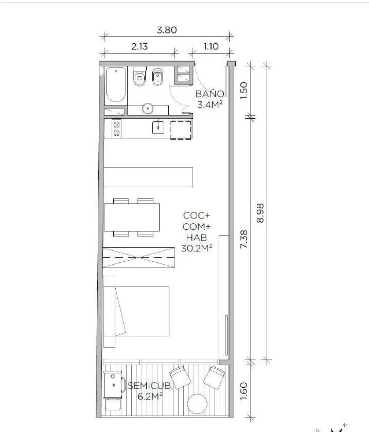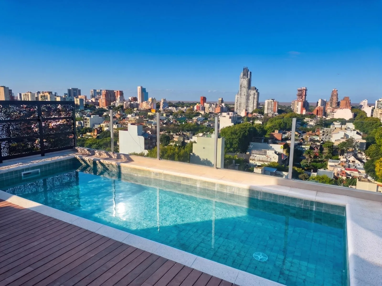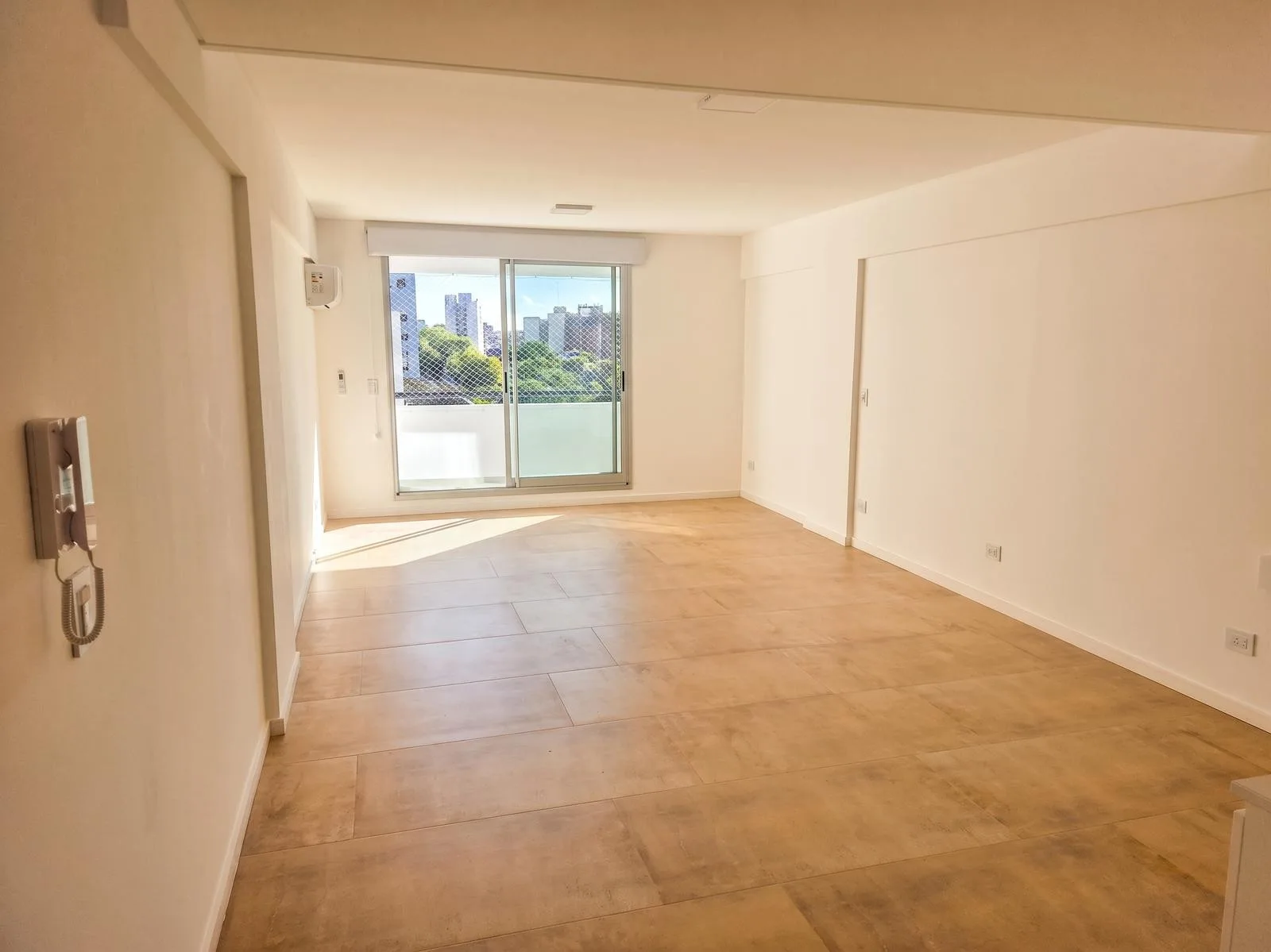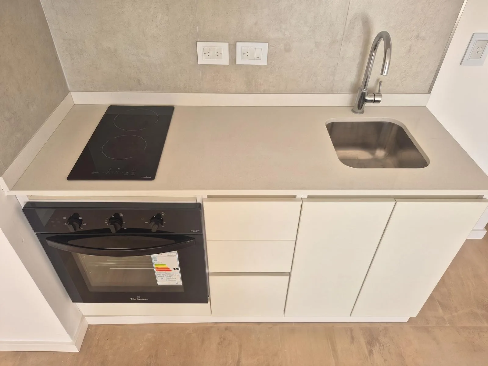 Studio apartment that can be divided, 42 m² total (35 m² covered) on the 5th floor, courtyard-facing with a balcony. Unfurnished and brand new. Includes an integrated kitchen, a full bathroom, and a main area divided for a living room and sleeping space, plus a balcony with safety netting. Building has central hot water, DVH double-glazed windows, multi-split hot/cold air conditioning, and facilities including an infinity pool with sun deck and grill, residents' lounge with co-working and garden