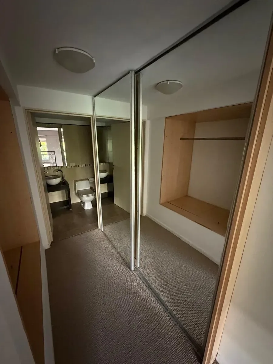 Duplex two-room apartment with 1 bedroom and en-suite bathroom. It has a living and integrated kitchen, a street-facing balcony, and the bedroom includes double built-in wardrobes. Air conditioning (hot/cold), automated curtains, and building amenities including a pool, gym and laundry are listed. Located two blocks from Av. Cabildo in Núñez.