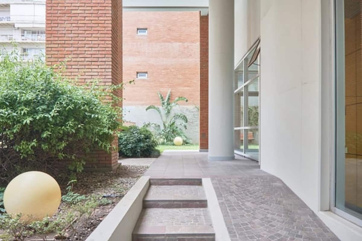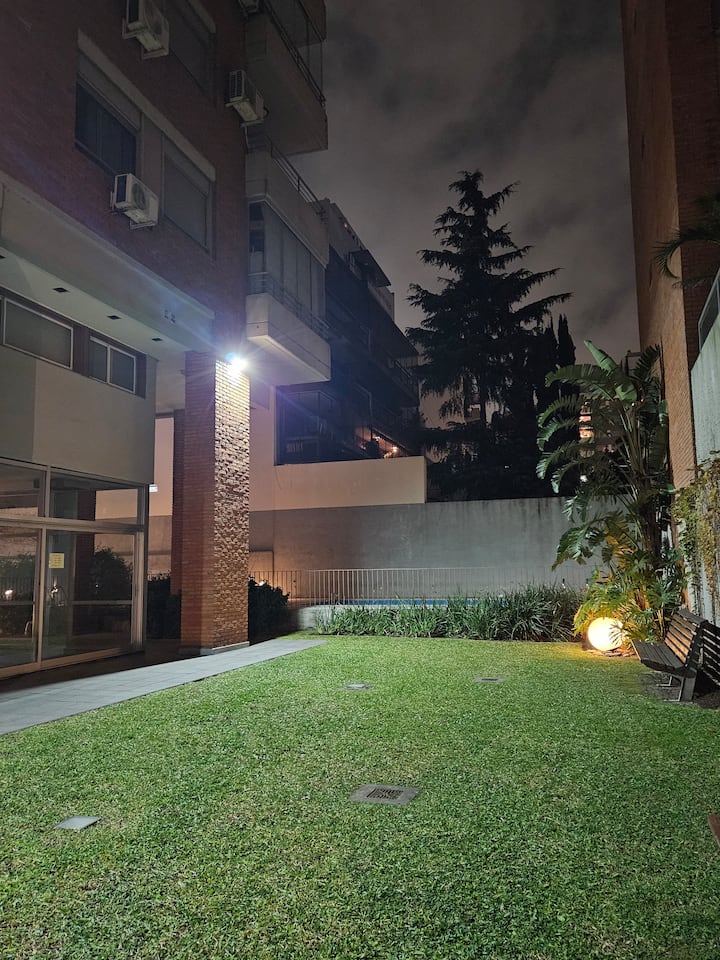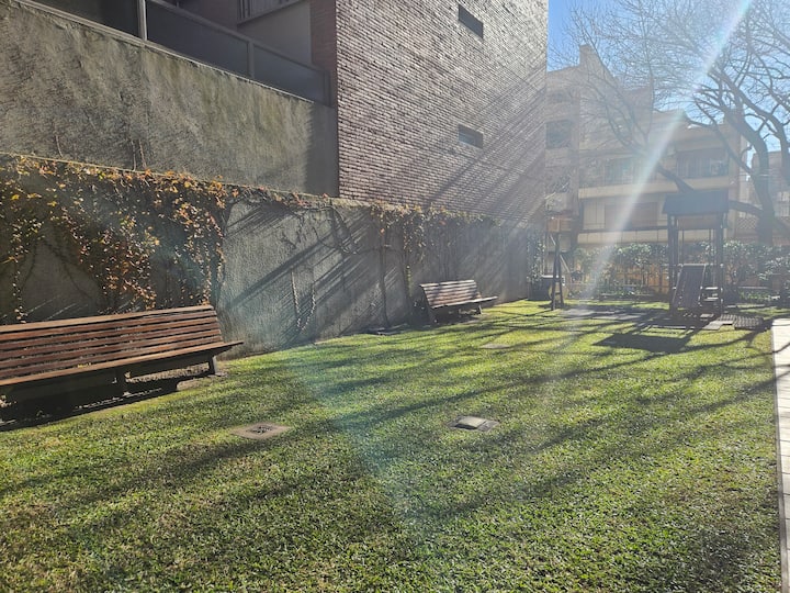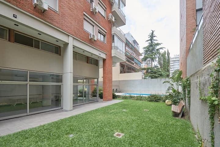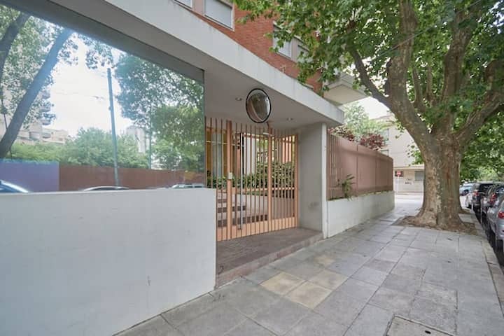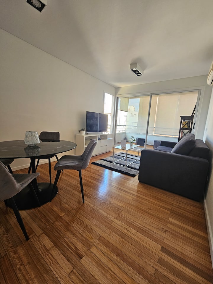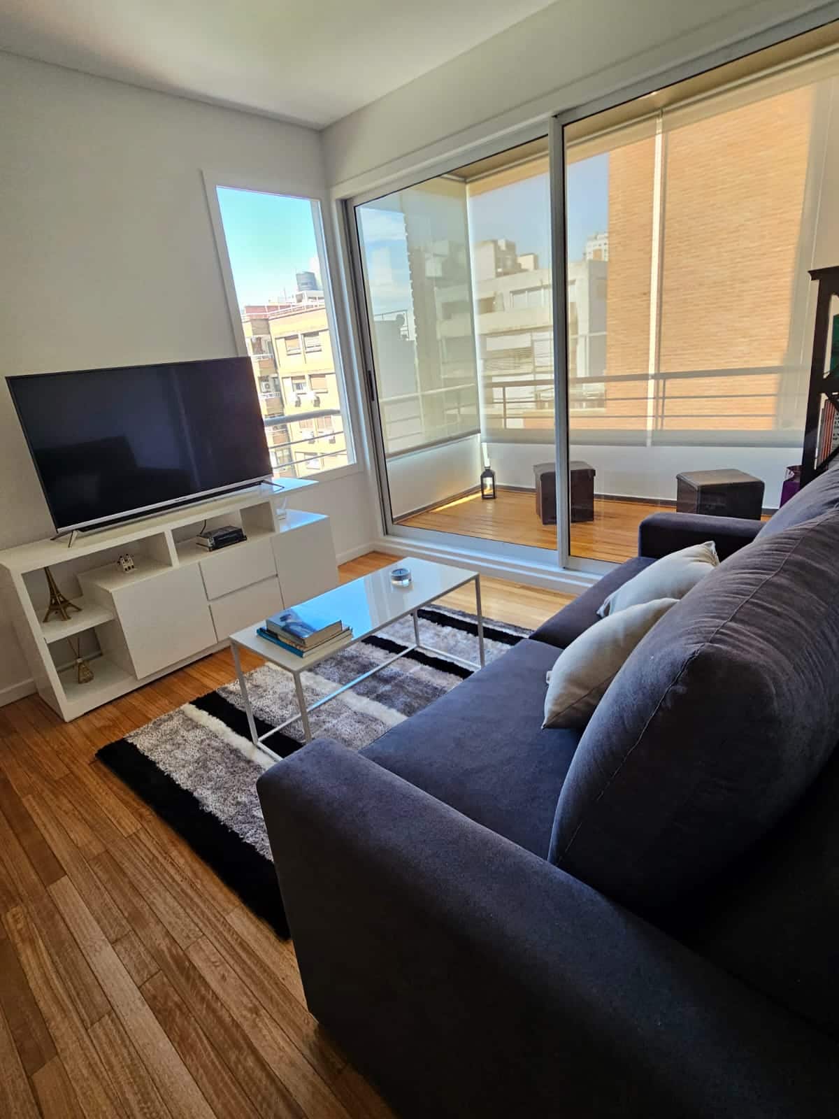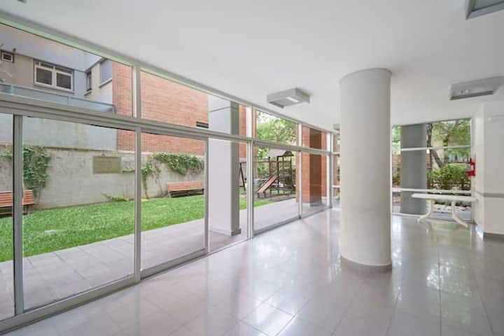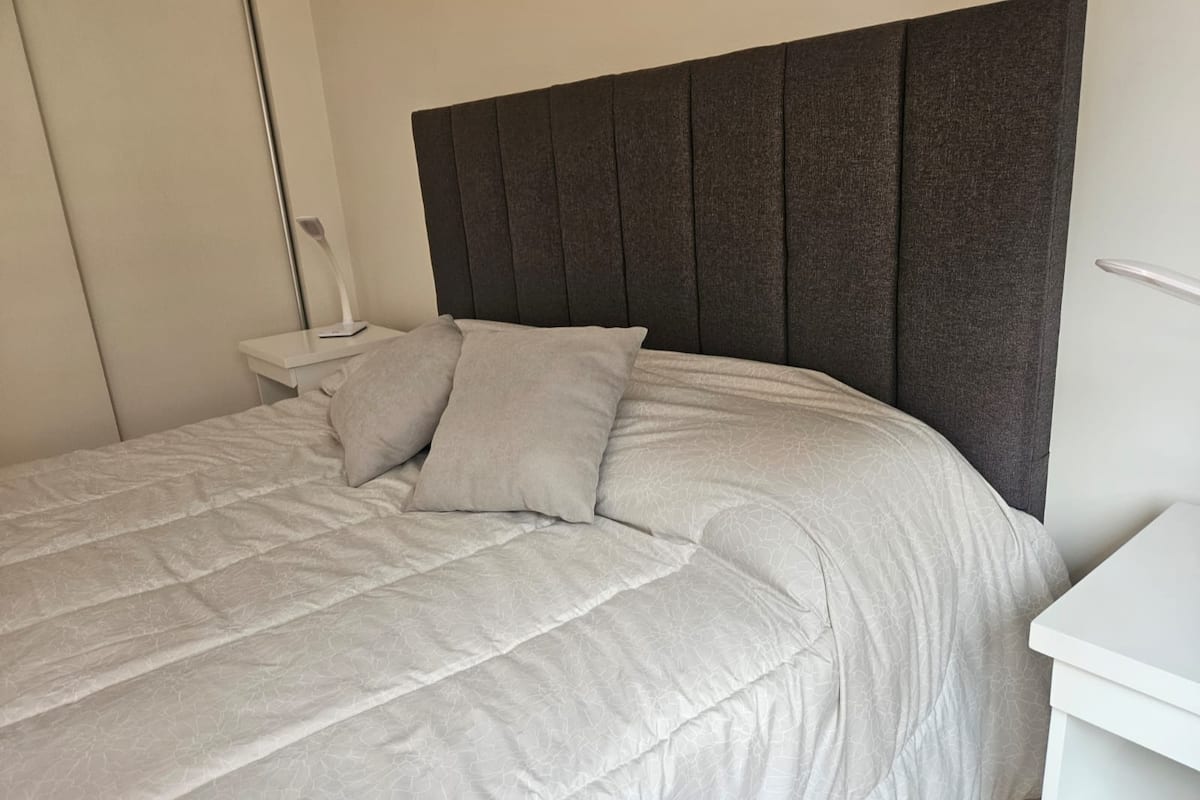 Two-room apartment in Núñez with 50 m². Furnished and fully equipped, with a balcony enclosed with decking and suitable for use as a workspace. The living room includes a sofa bed (1.30 x 1.90 m), and the bedroom has a queen-size bed. The kitchen is fully equipped, and the bathroom is complete with a bathtub. The building offers 24-hour security and a ground-floor pool and garden; a laundry room with washing machines and dryers is on the 1st floor for a fee.