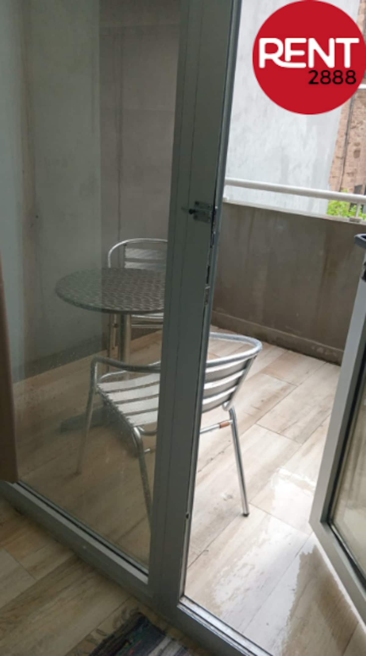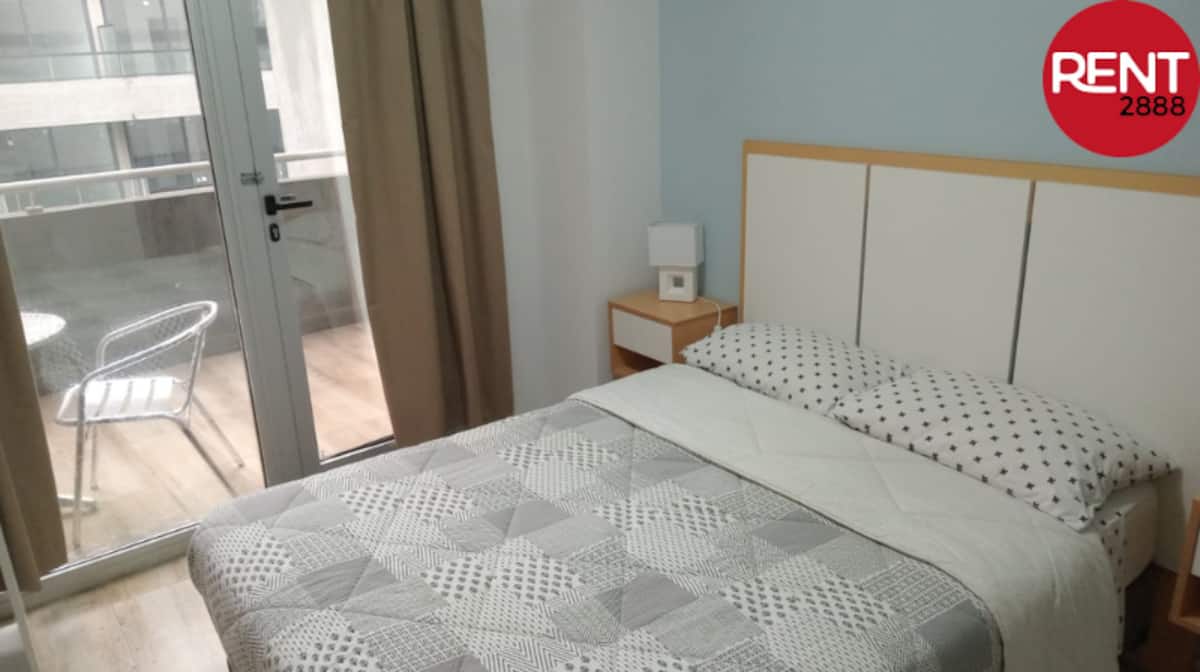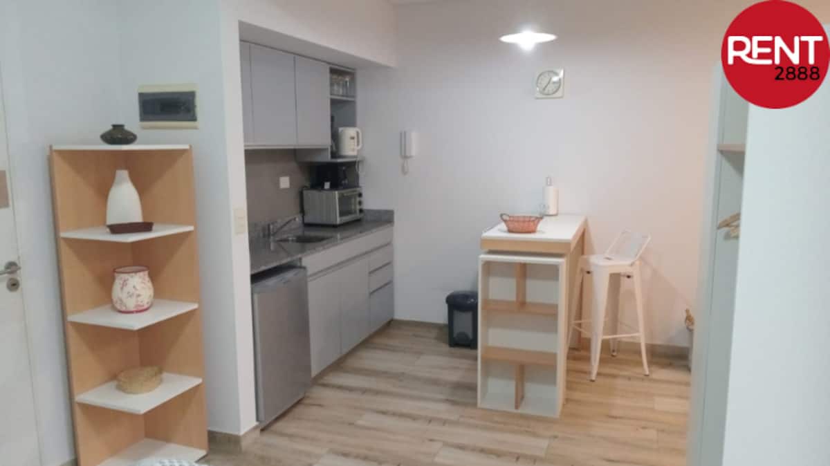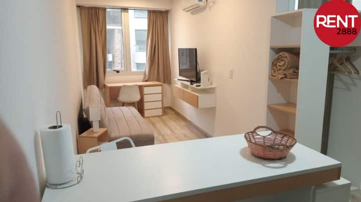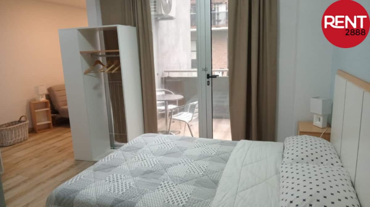Furnished studio apartment with a balcony, street-facing. The unit includes a fully equipped kitchen, a private bathroom with hot shower, hairdryer, smart TV, Wi-Fi and air conditioning (cold/heat), plus storage space.