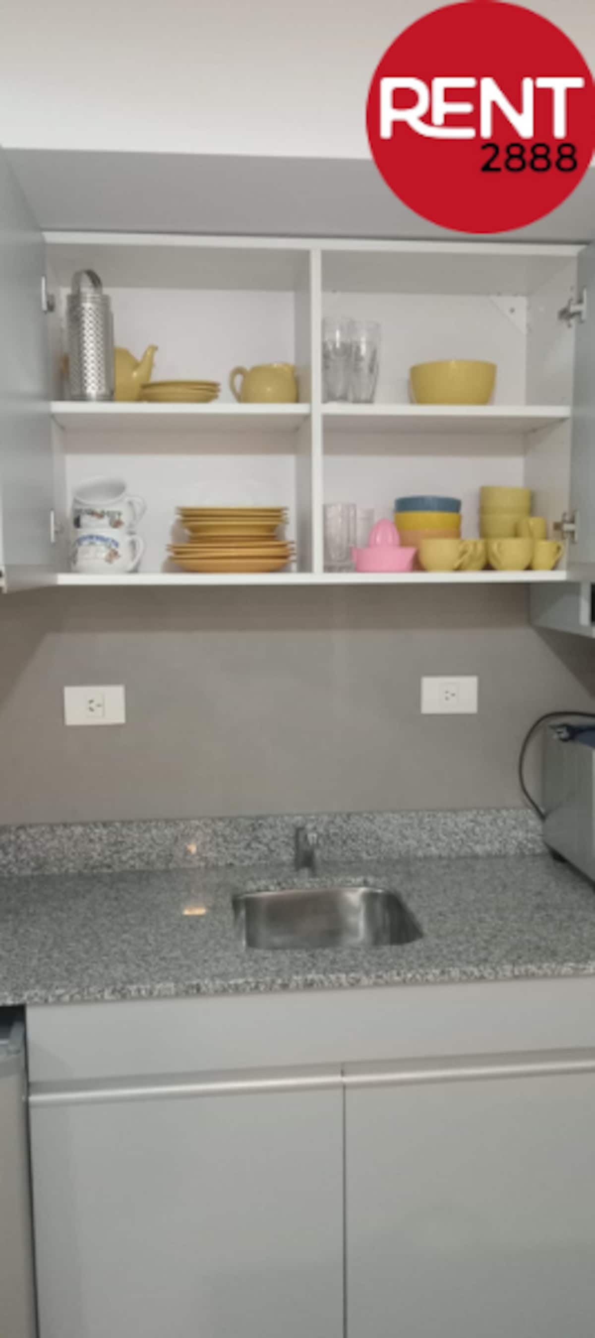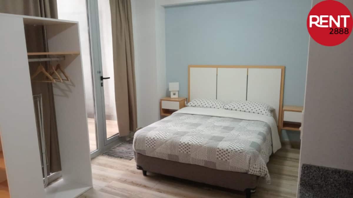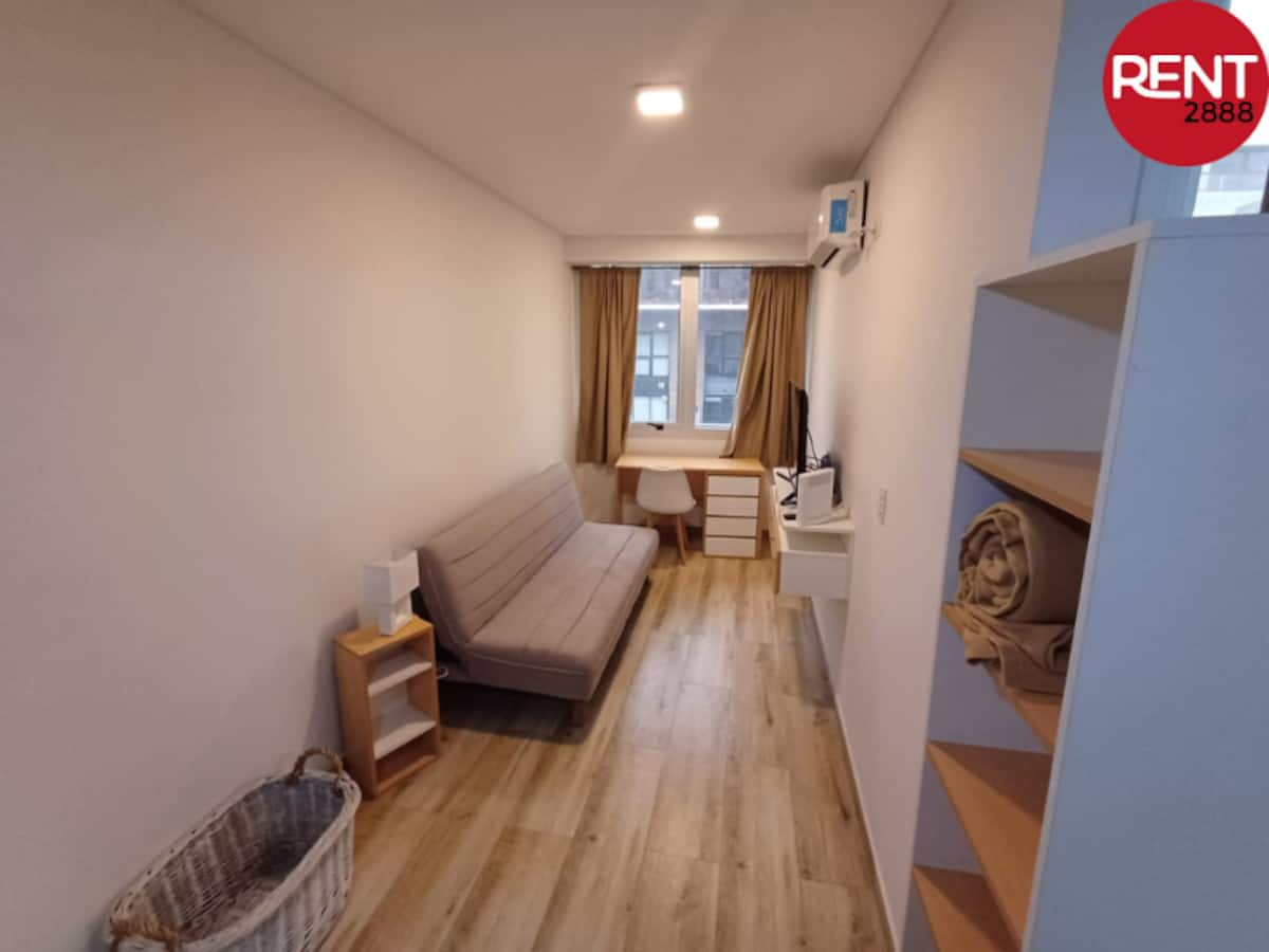 Furnished studio apartment with a balcony, street-facing. The unit includes a fully equipped kitchen, a private bathroom with hot shower, hairdryer, smart TV, Wi-Fi and air conditioning (cold/heat), plus storage space.