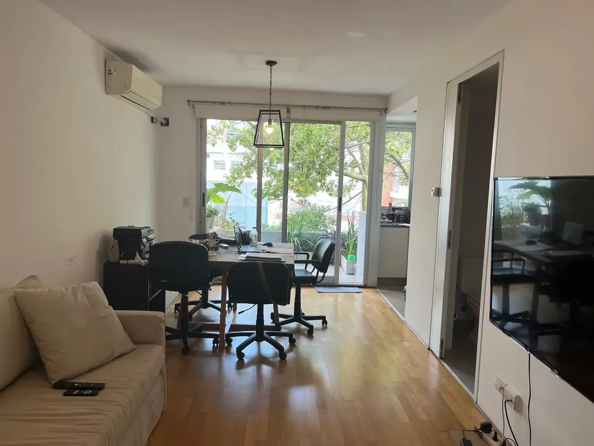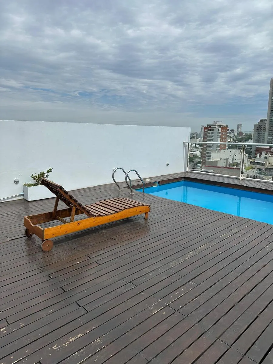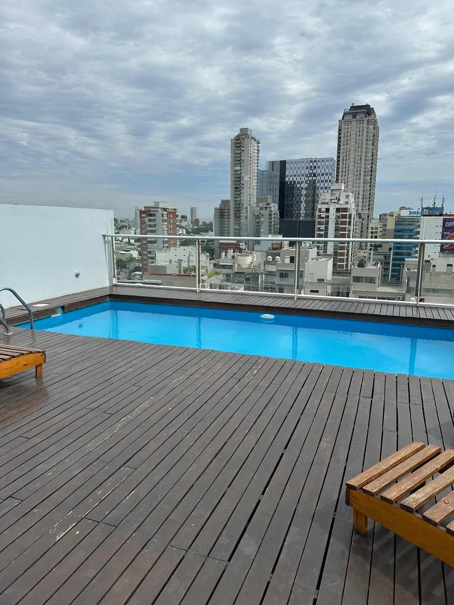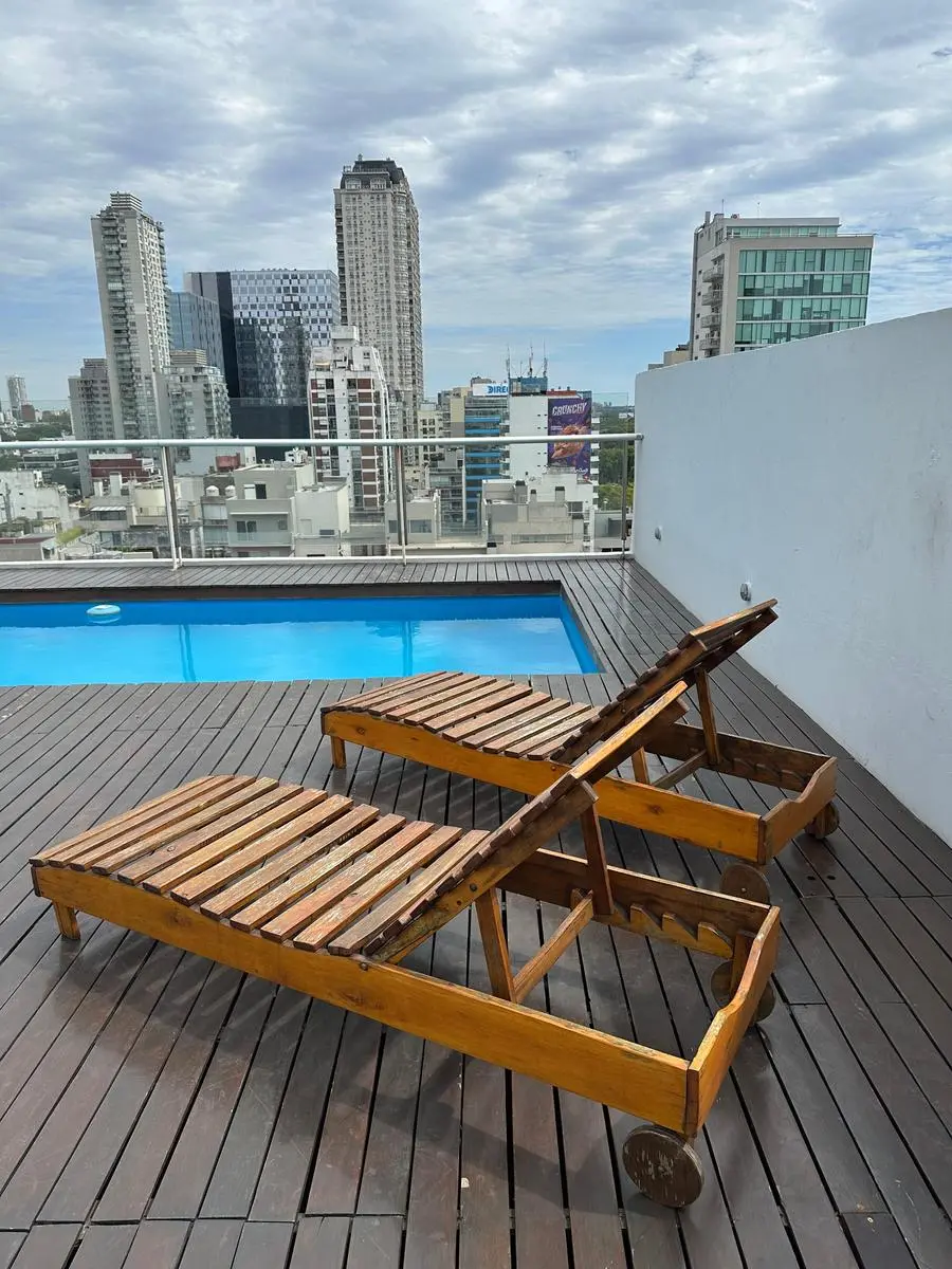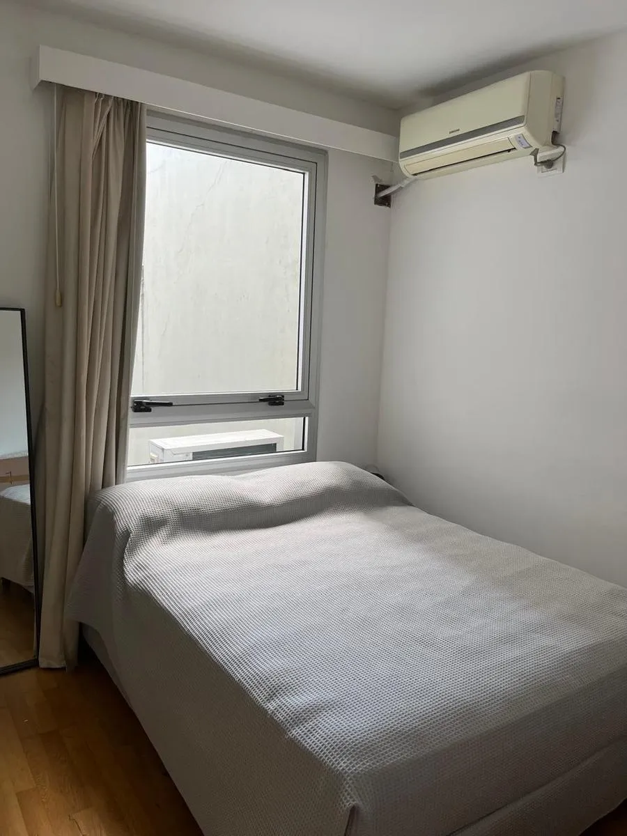 Two-room apartment in Núñez with a living/dining room, 1 bedroom and a separate kitchen. Equipped with 2 hot/cold air-conditioning units (one in each room), an independent electric water heater and a balcony facing the building. The building has a doorman, laundry, a roof-top pool and a deck with a grill, and the unit includes a private uncovered parking space. Av. Congreso 1500.