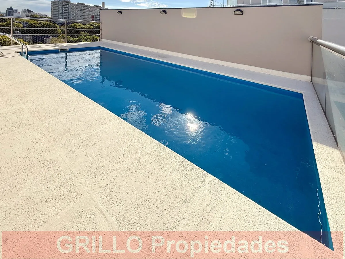 Two-room apartment for rent in Núñez. The unit has 1 bedroom and measures 55 m² total (50 m² covered) with a 5 m² balcony facing the courtyard. Located on the 7th floor of a 9-storey building, East-facing with a living-dining area that includes air conditioning and a balanced flue heater, a bedroom with built-in wardrobe, a separate kitchen with space to install a washing machine, and a full bathroom with bathtub. It includes an assigned covered parking space, a pool, a grill area, and a communa