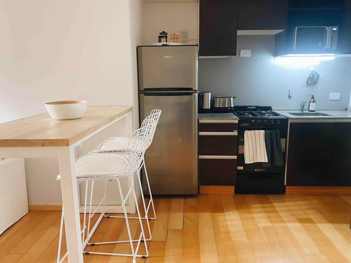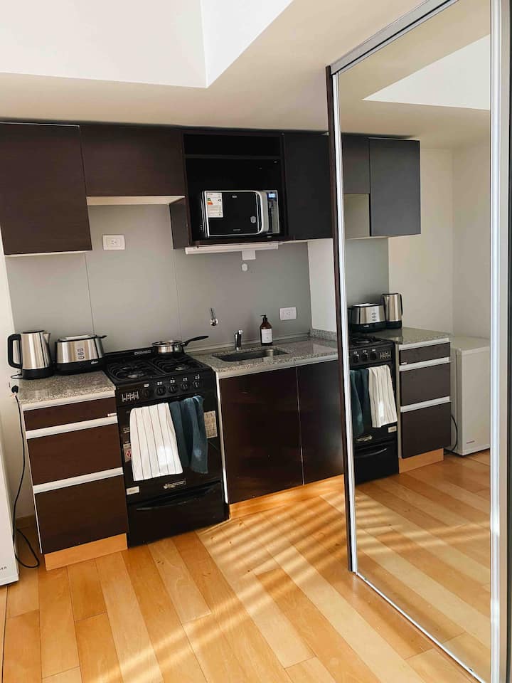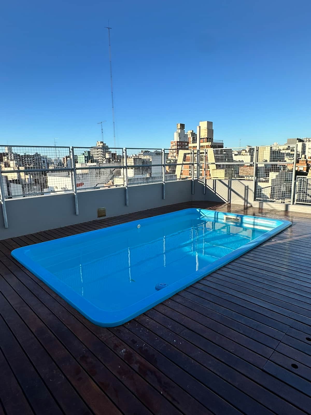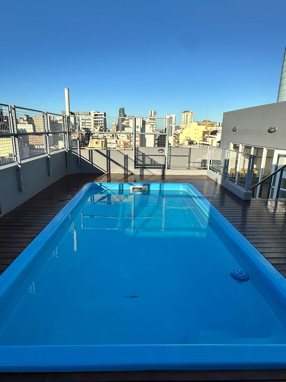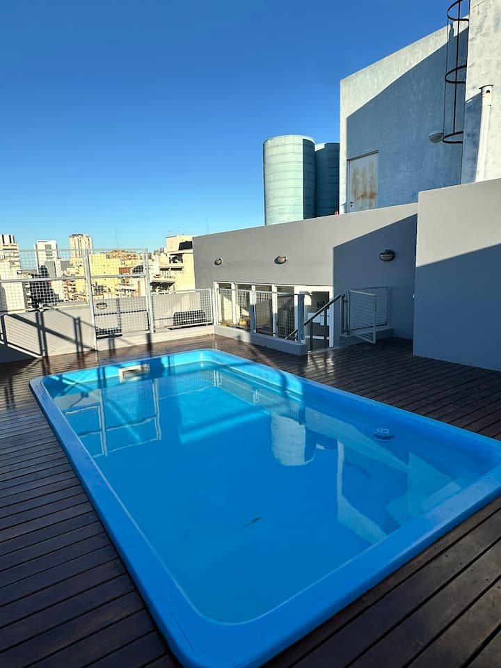 Studio apartment in Núñez. It overlooks an interior block courtyard and is described as quiet. The building has a swimming pool, grill area and a communal room on the terrace, plus a laundry. Access is via public transport, including Subte D, and free street parking is available in the area 24 hours a day.