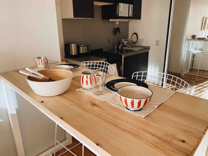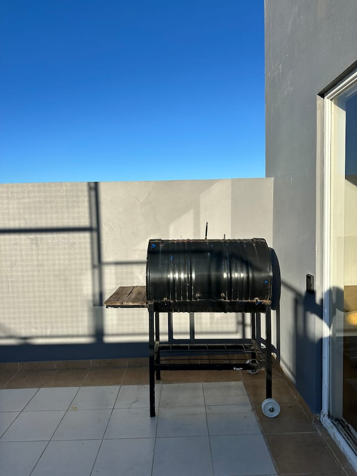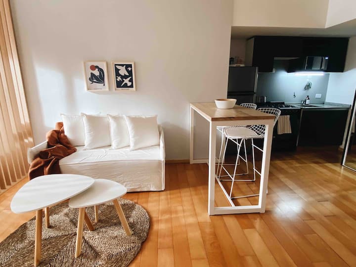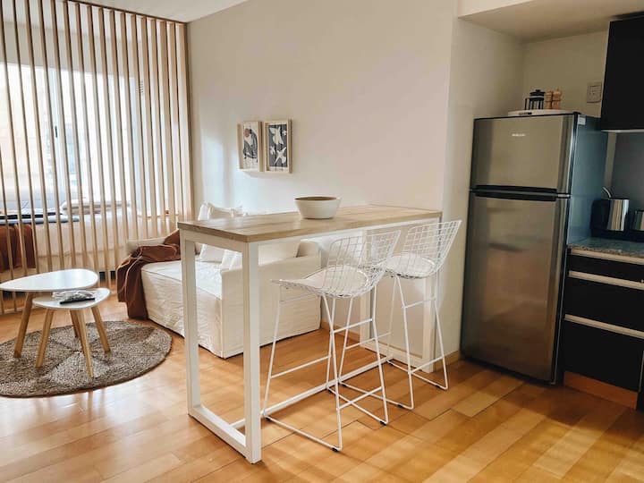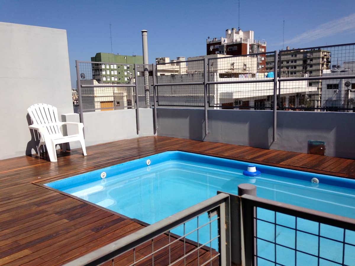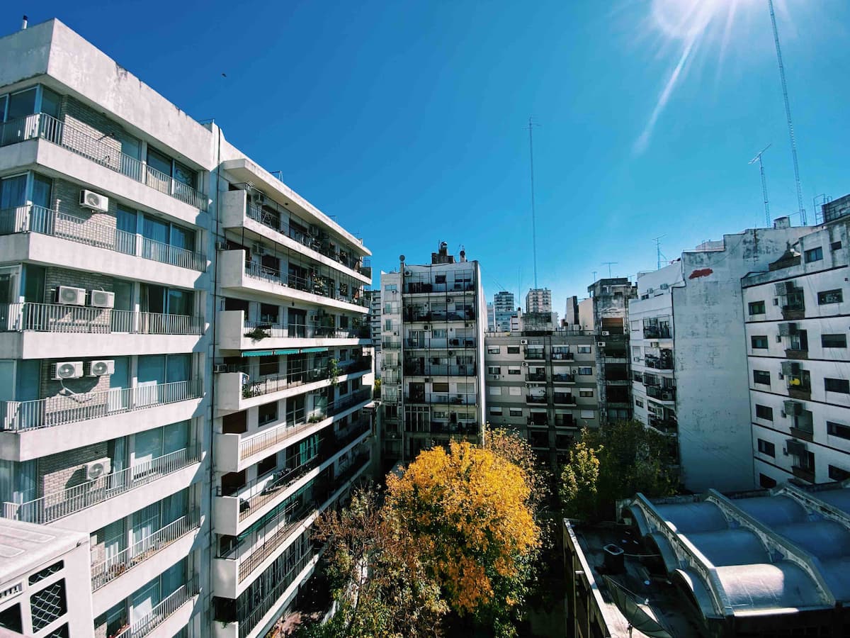 Studio apartment in Núñez. It overlooks an interior block courtyard and is described as quiet. The building has a swimming pool, grill area and a communal room on the terrace, plus a laundry. Access is via public transport, including Subte D, and free street parking is available in the area 24 hours a day.