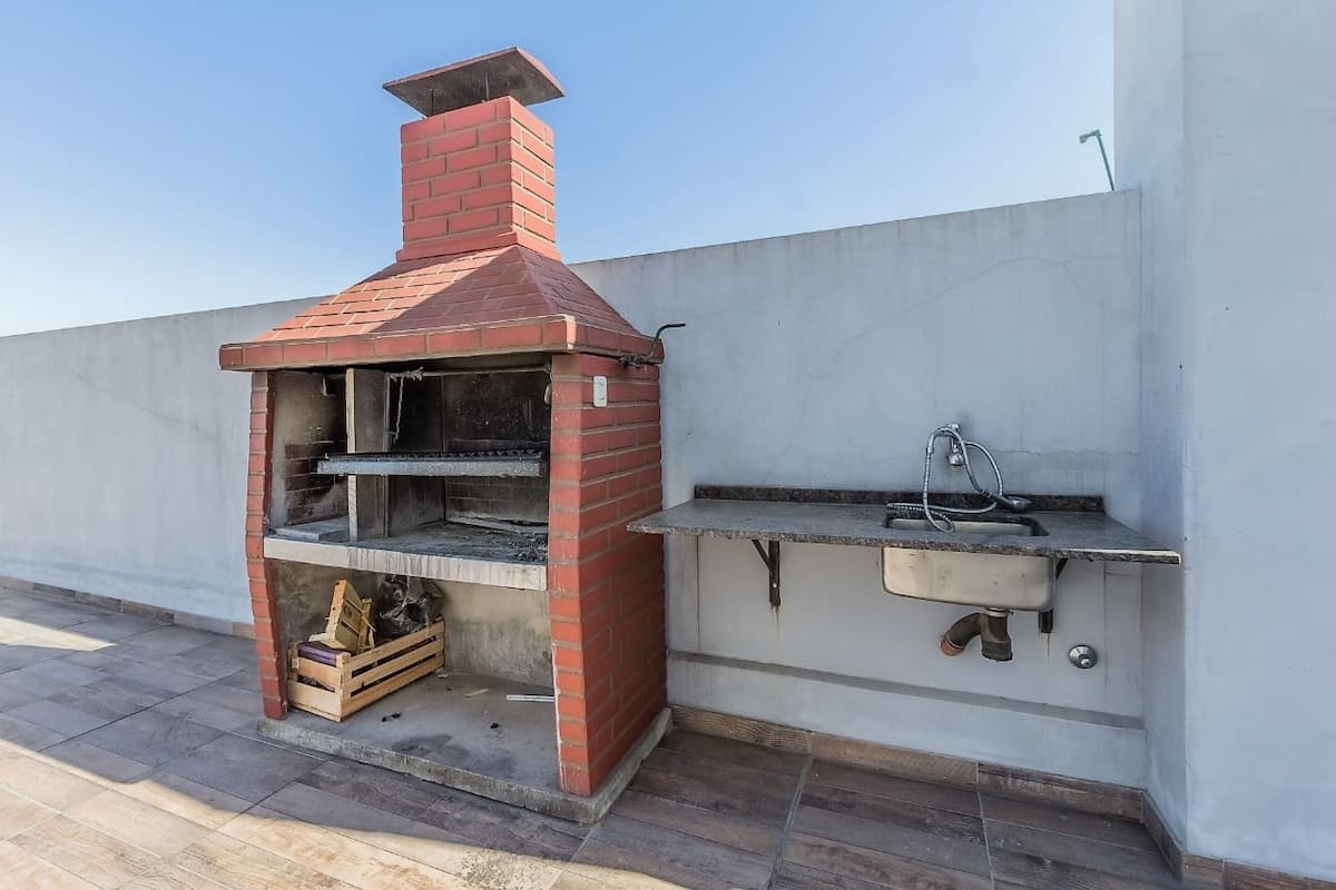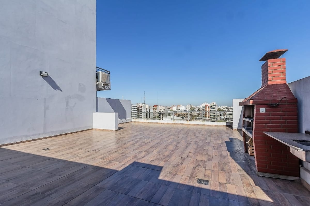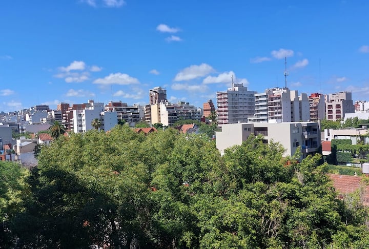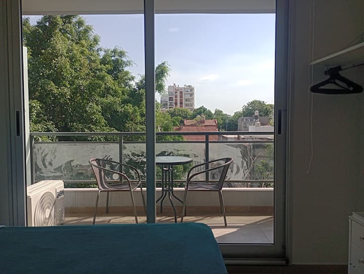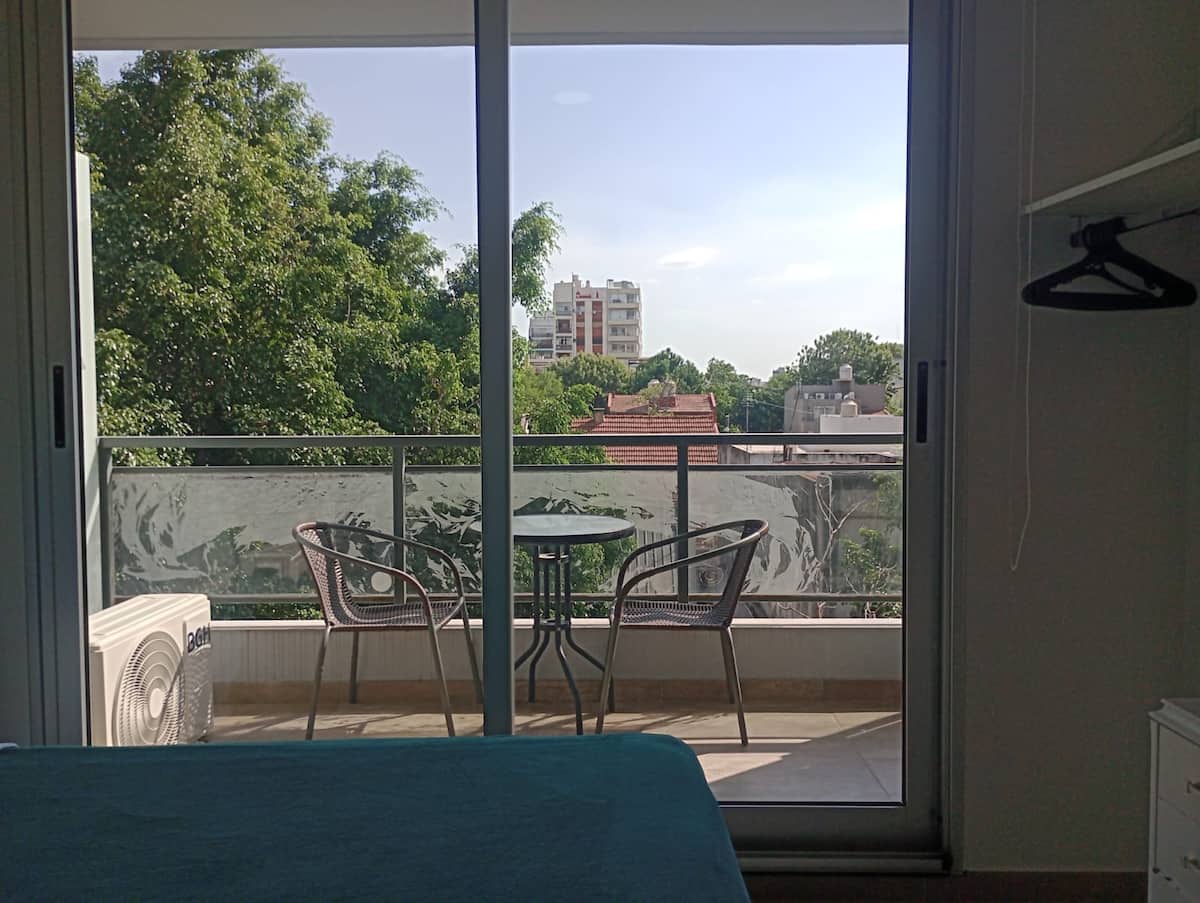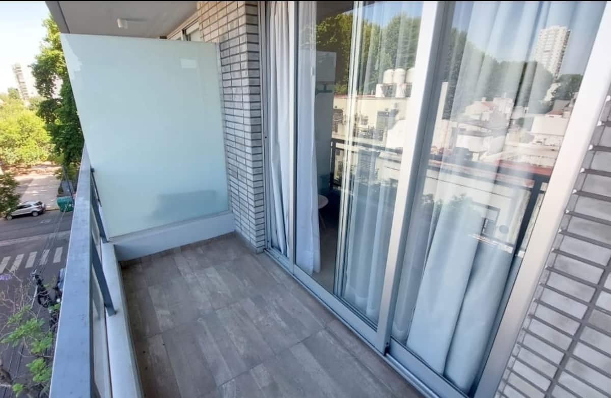One-bedroom apartment in Núñez with furnished living space, a double bed, smart TV, and a sofa bed. The kitchen is fully equipped with appliances and utensils. It includes a full bathroom and a balcony with chairs. On Av. Cabildo, the area has heavy traffic and multiple bus lines, including 19, 29, 41, 57, 59, 60, 68, 71, 130, 133, 151, 152, 161, 168, 184 and 194.