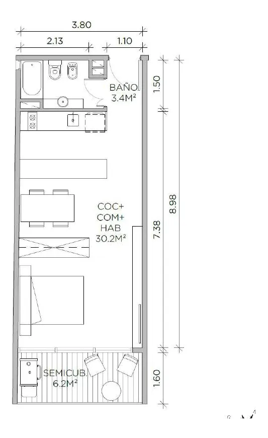 New studio apartment (divisible) in Núñez on the 5th floor, courtyard-facing (contrafrente), with a 7 m² balcony and 35 m² covered area (total 42 m²). Integrated kitchen, full bathroom, and a main room designed for dividing living and sleeping areas. Building amenities include an infinity pool with solarium/sun deck, communal room with co-working and garden, laundry, 24-hour security with HD cameras and concierge, and high-speed stainless-steel elevator. The unit includes central hot water, mult