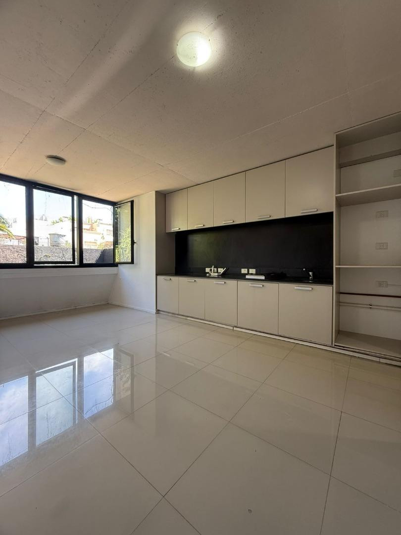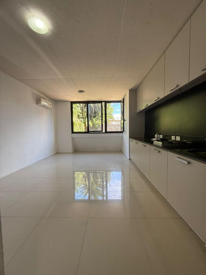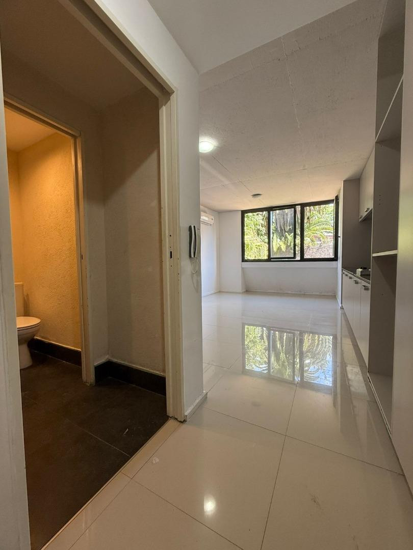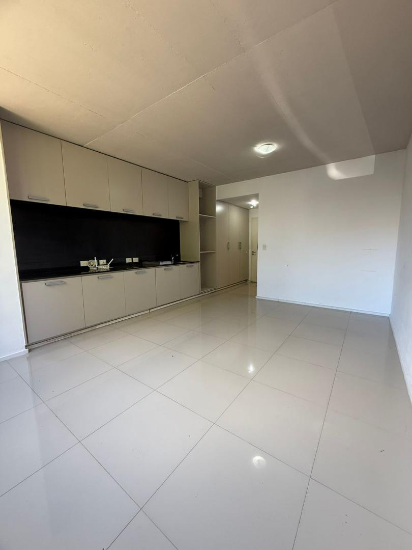 Studio apartment at the courtyard-facing side in Núñez, with a built-in wardrobe. American-style kitchen with electric hotplate, full bathroom, and air conditioning. The building has a communal terrace, residents' lounge (SUM), and bicycle storage space.