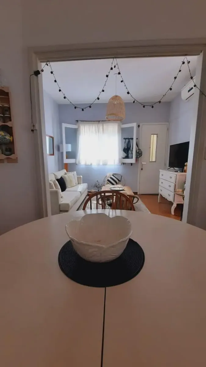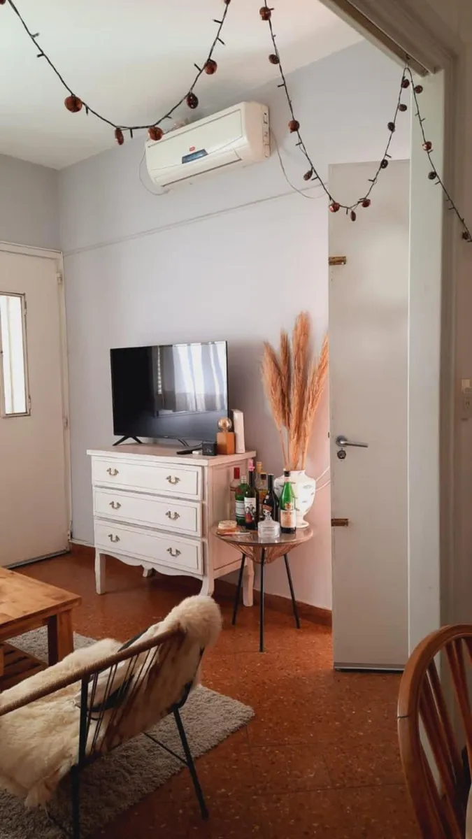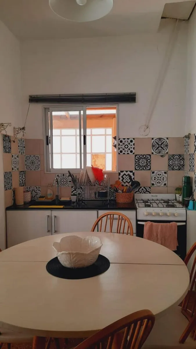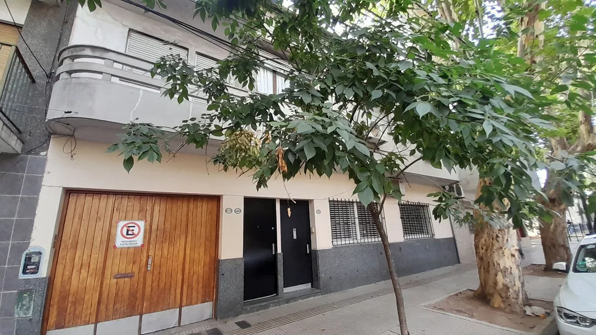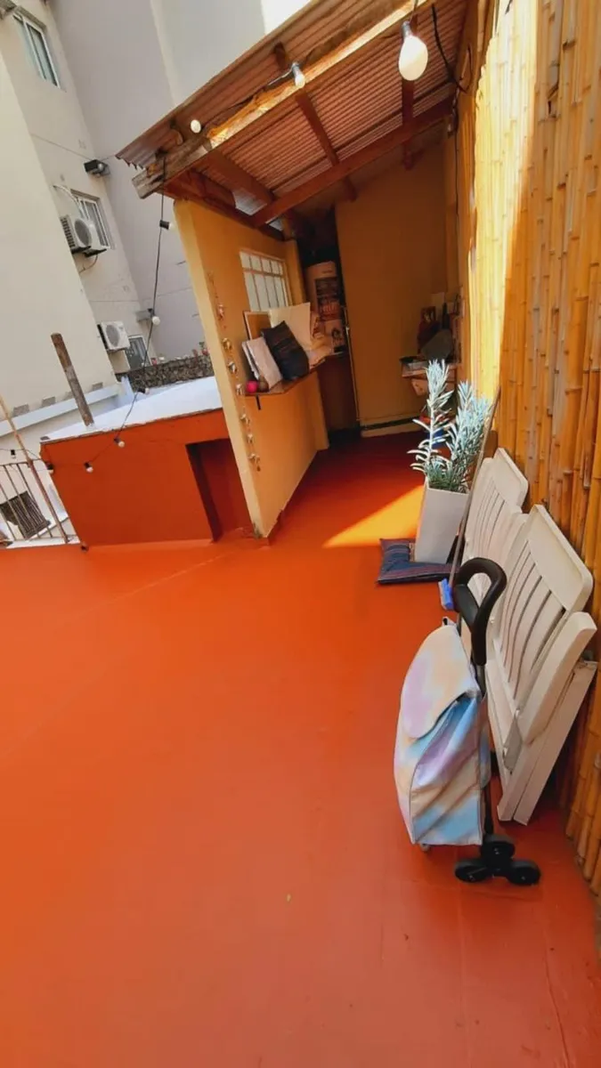 Ground-floor or upper unit with private entrance, two-room PH on the courtyard-facing side, with a private terrace. The unit has a living-dining room with an integrated kitchen, a refurbished full bathroom with a shower, and a bedroom with parquet floors and a built-in wardrobe. There is a semi-covered separate laundry area with a breakfast bar connected to the terrace, plus a new gas water heater (termotanque). Building fees cover cleaning and lighting at $5,000 per month; ABL is $18,165 and AY