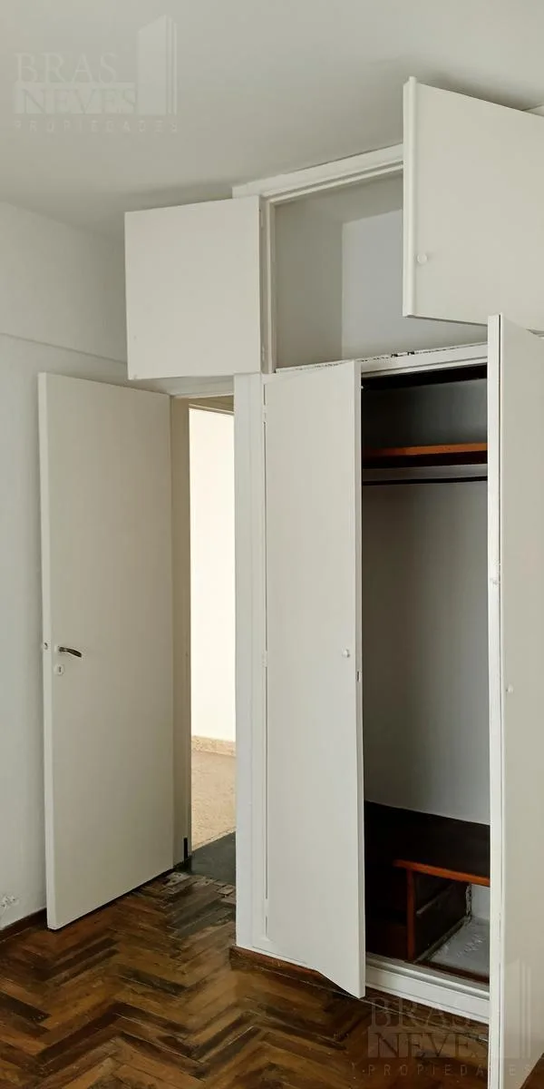 Two-room apartment on the 2nd floor, accessed by stairs only, with a courtyard-facing balcony. Living-dining area with a small semi-integrated kitchen; bedroom with a fitted wardrobe and parquet flooring. Building fees include ABL and AYSA. Rental contract is for 2 years with quarterly rent increases linked to IPC (INDEC); a property guarantor or FINAER guarantee is required.