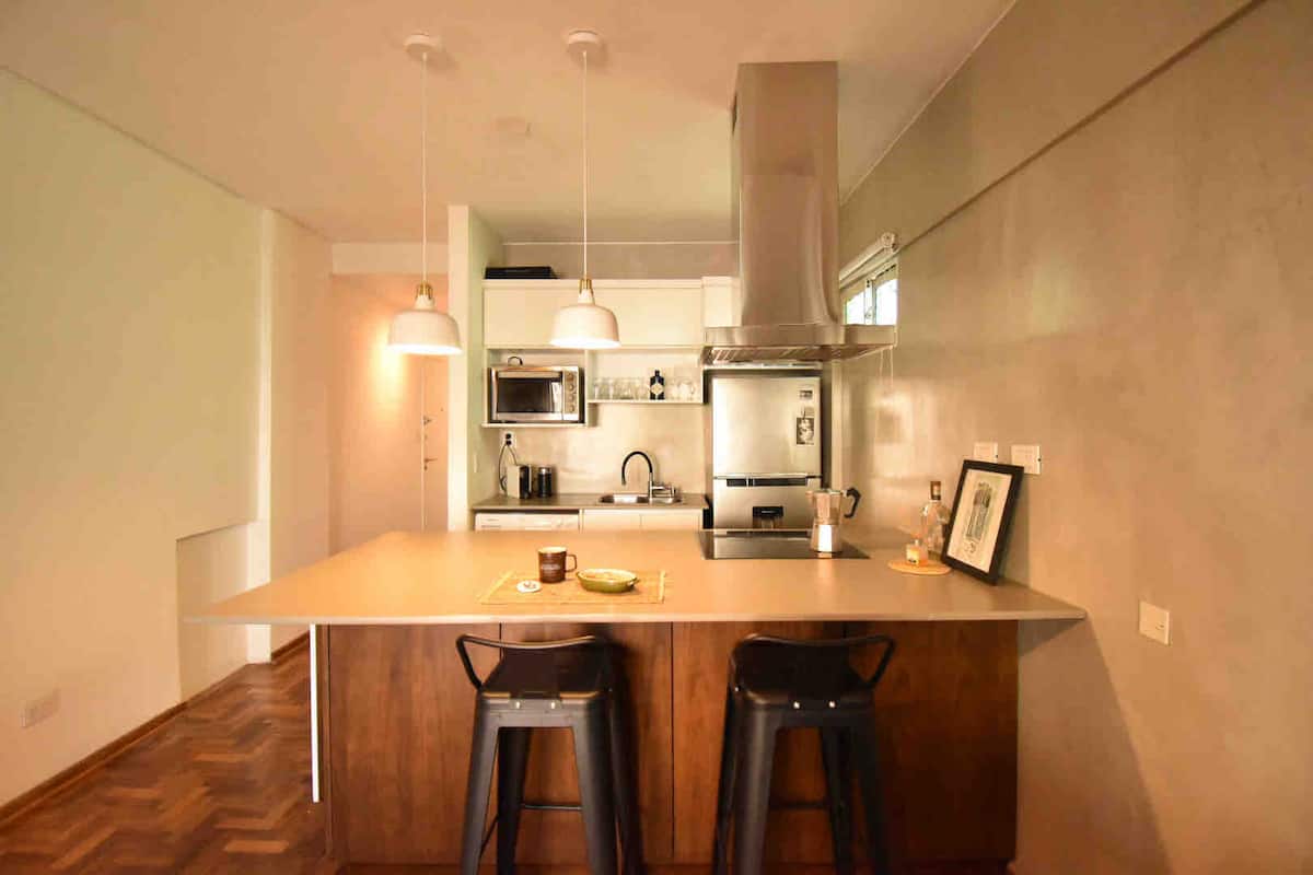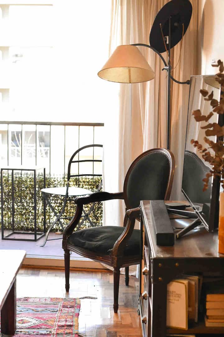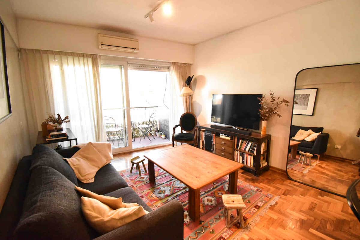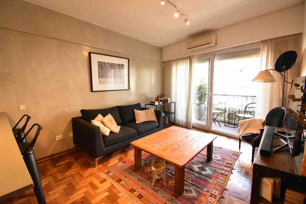 One-bedroom apartment in Olivos with a balcony and windows with distinctive designs. Living room and kitchen are connected with an island; the unit includes a sound system and a collection of books. The bedroom is small and has a three-quarter bed; the living-room sofa is not a sofa bed.