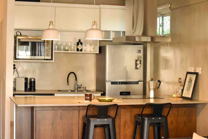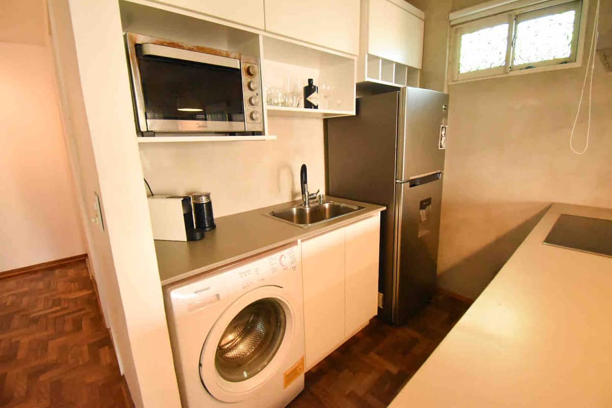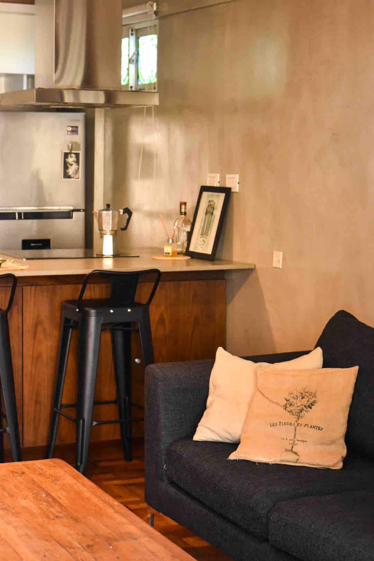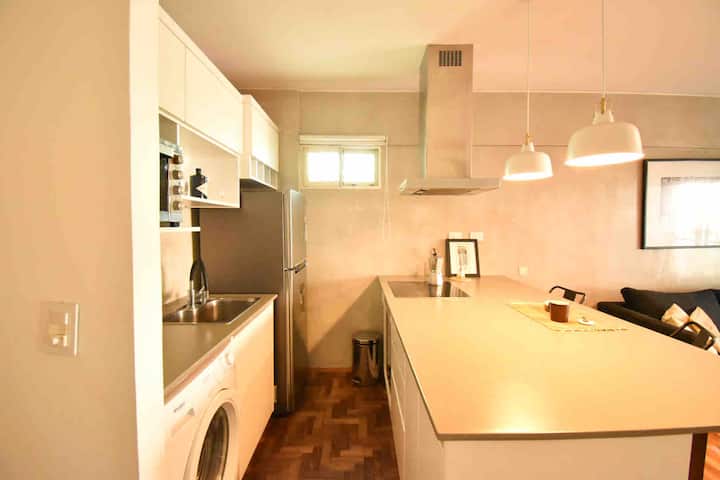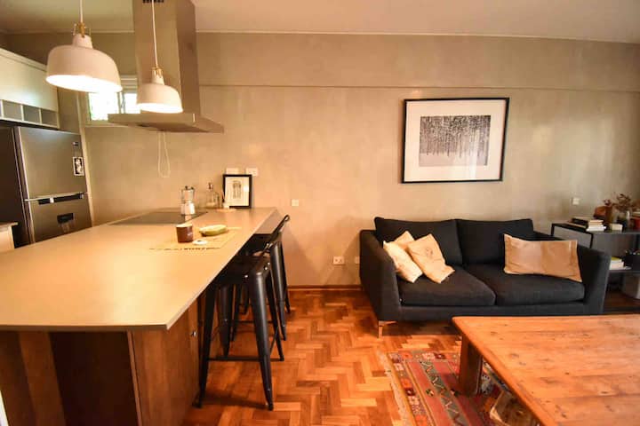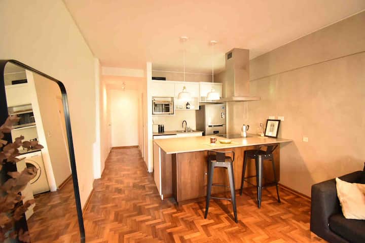 One-bedroom apartment in Olivos with a balcony and windows with distinctive designs. Living room and kitchen are connected with an island; the unit includes a sound system and a collection of books. The bedroom is small and has a three-quarter bed; the living-room sofa is not a sofa bed.