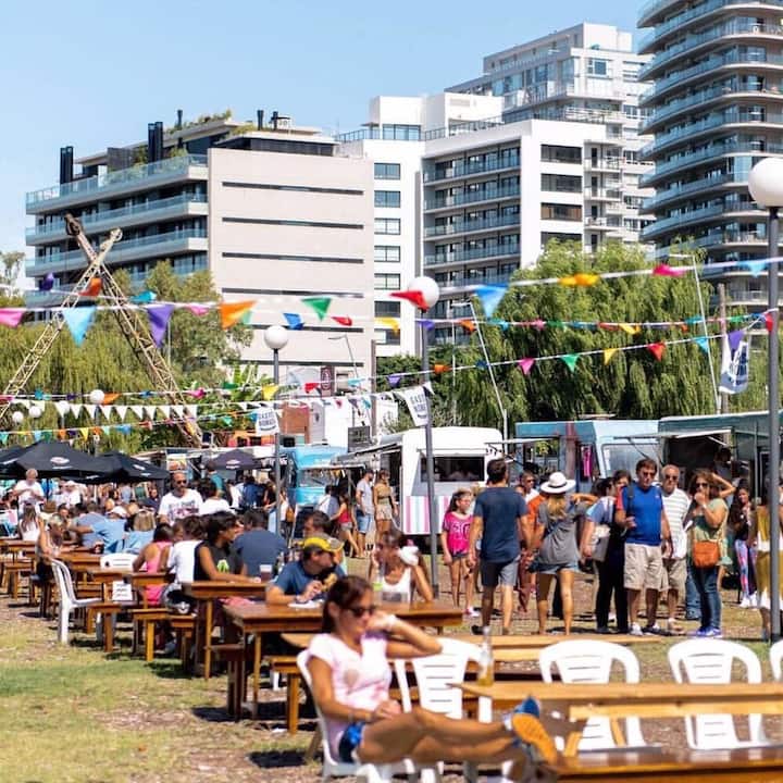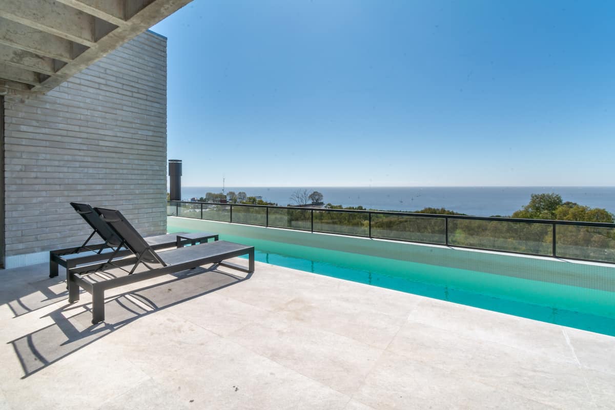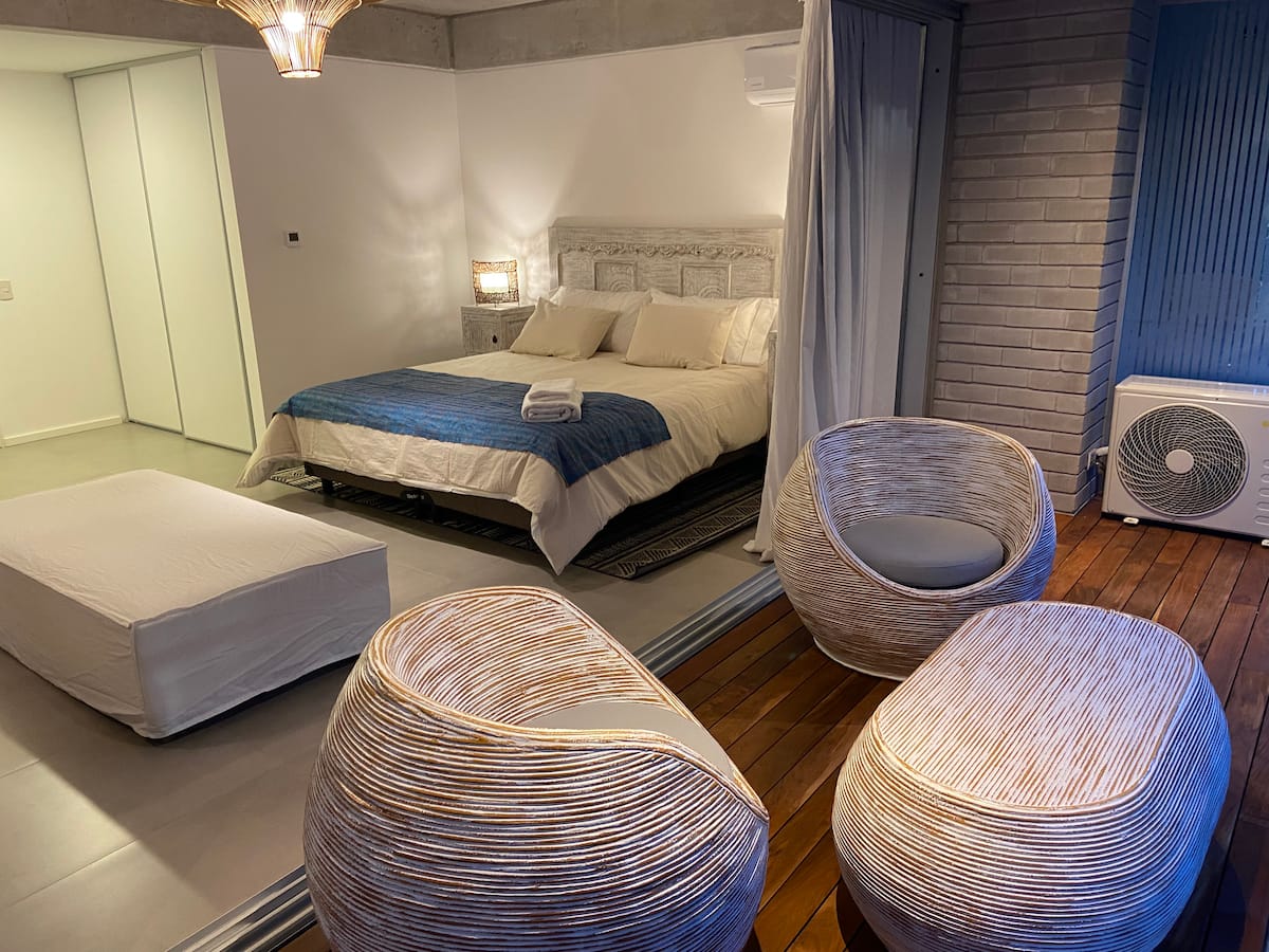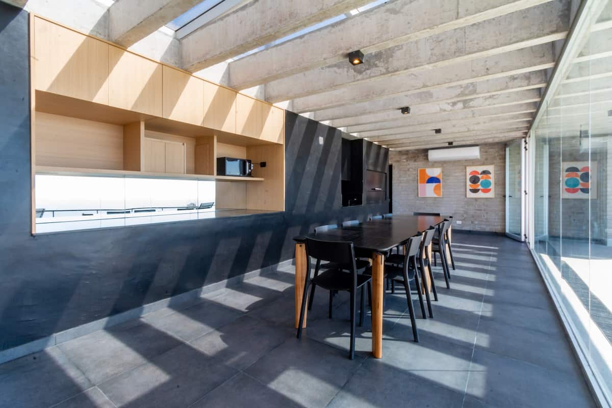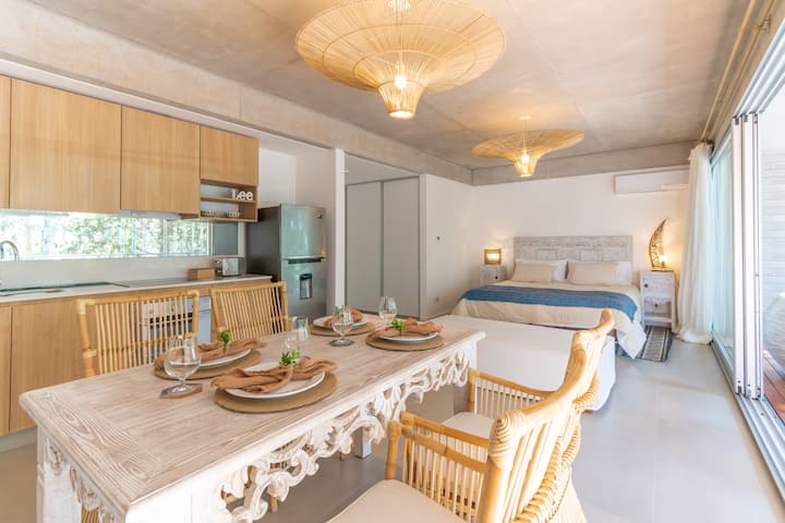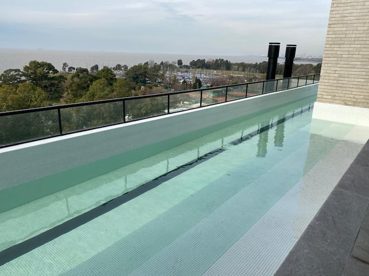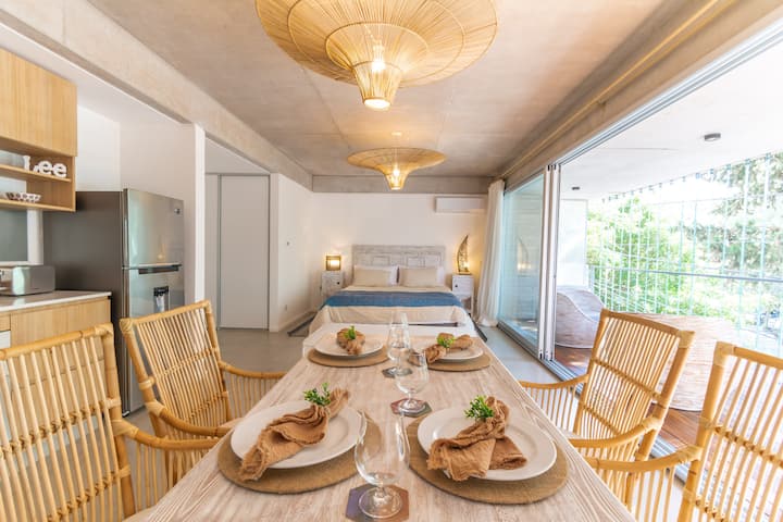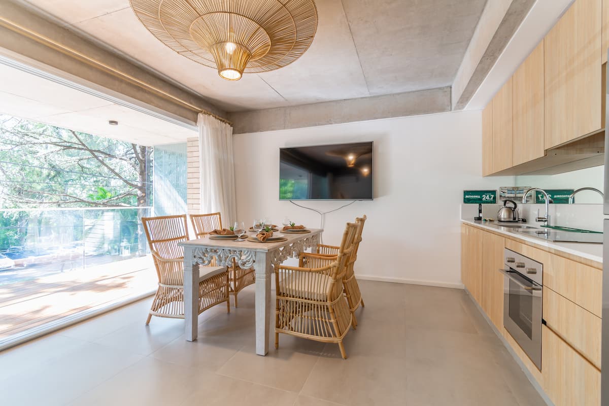 One-bedroom apartment in Olivos Harbour with a terrace and riverside views, covering 54 m². The open-plan layout includes an integrated kitchen and living room, a Queen bed, and a dining area opening to the balcony terrace. Fully equipped for stays, including Nespresso and a 65-inch smart TV, with 600 Mb Wi‑Fi and Indonesian rattan furnishings. The complex offers 24-hour security and shared amenities including a gym, pool, laundry and terrace; free parking is available in front of the apartment