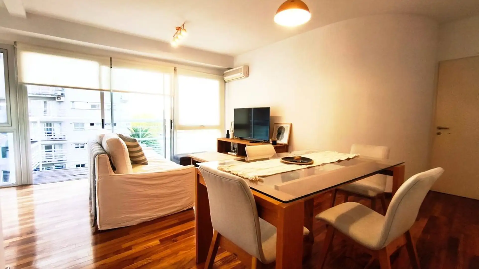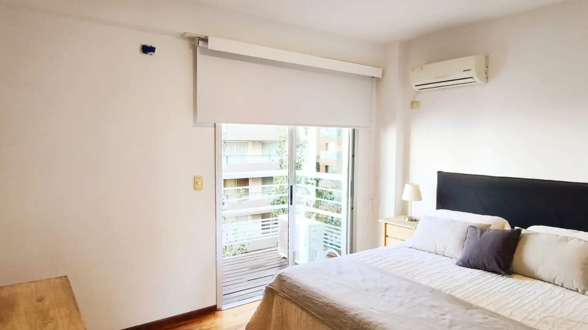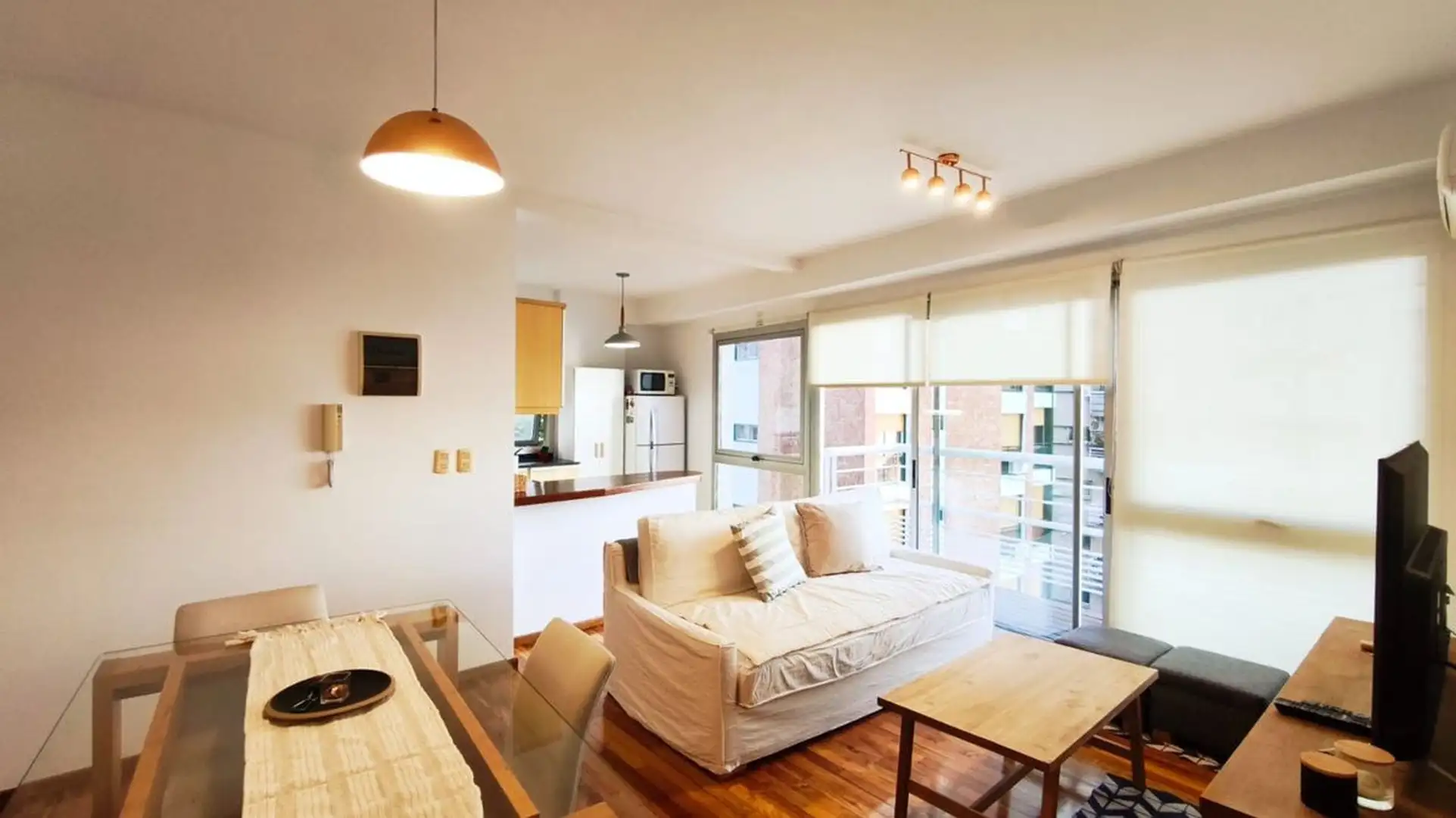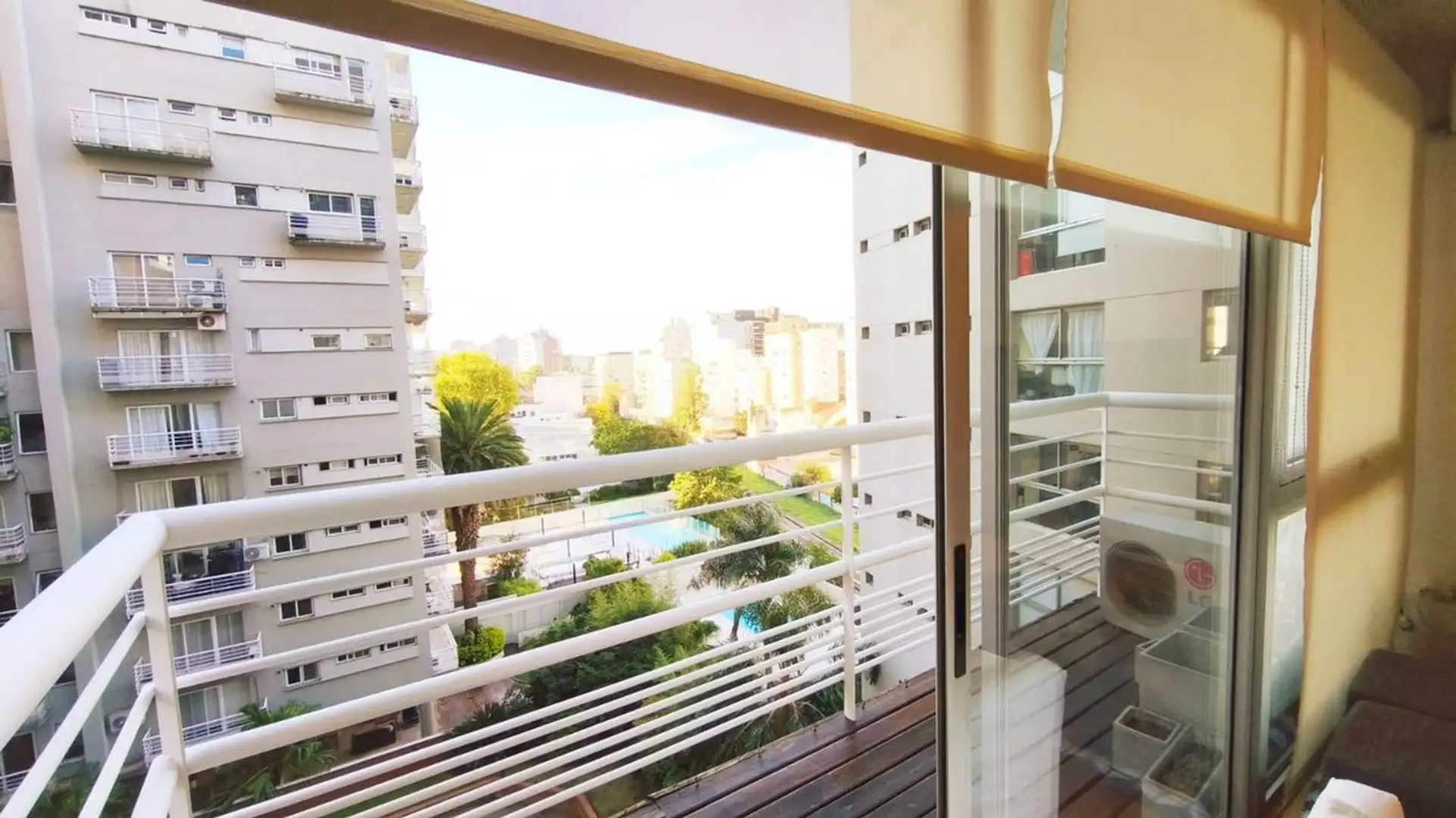 One-bedroom apartment in Olivos, 59 m² covered with a 6.55 m² balcony, north-east facing. Living-dining area with integrated, fully equipped kitchen opening directly to the balcony, with double-glazed windows (DVH). Building amenities include a pool, gym, communal room (SUM), laundry and 24-hour security. The unit includes a covered assigned parking space, and the building offers visitor parking. Nearby transport includes bus lines 29, 59 and 168, and the Mitre train line at Olivos station.