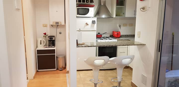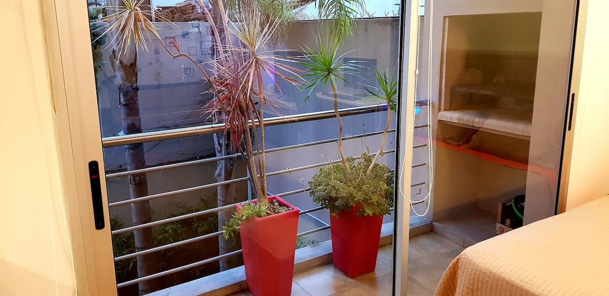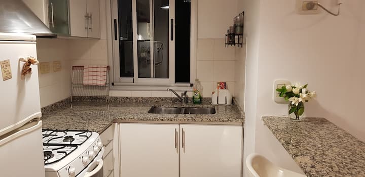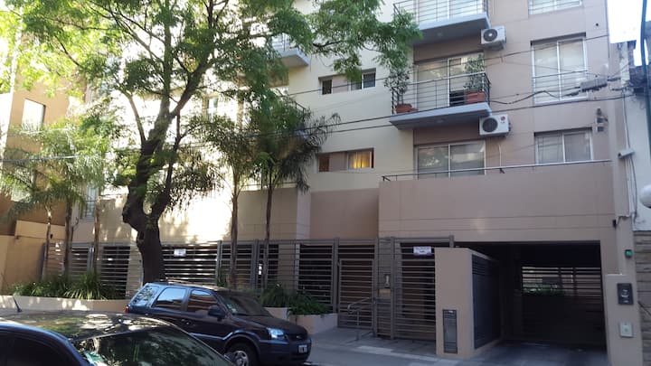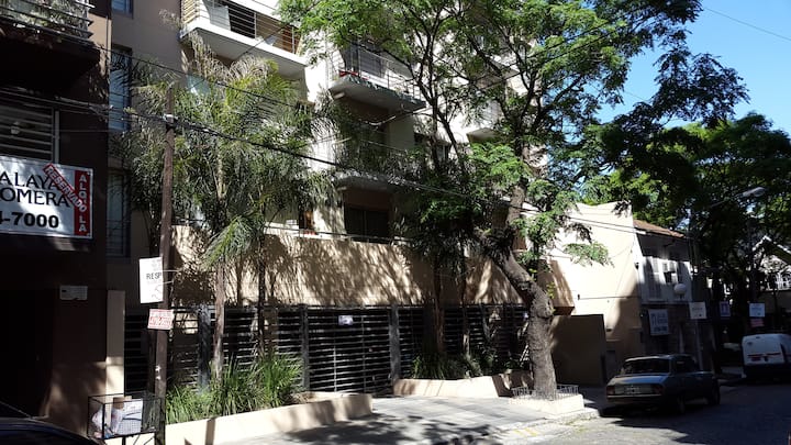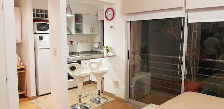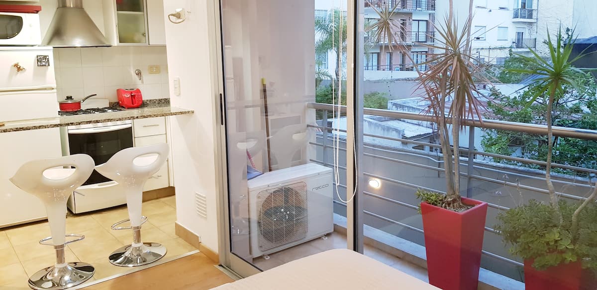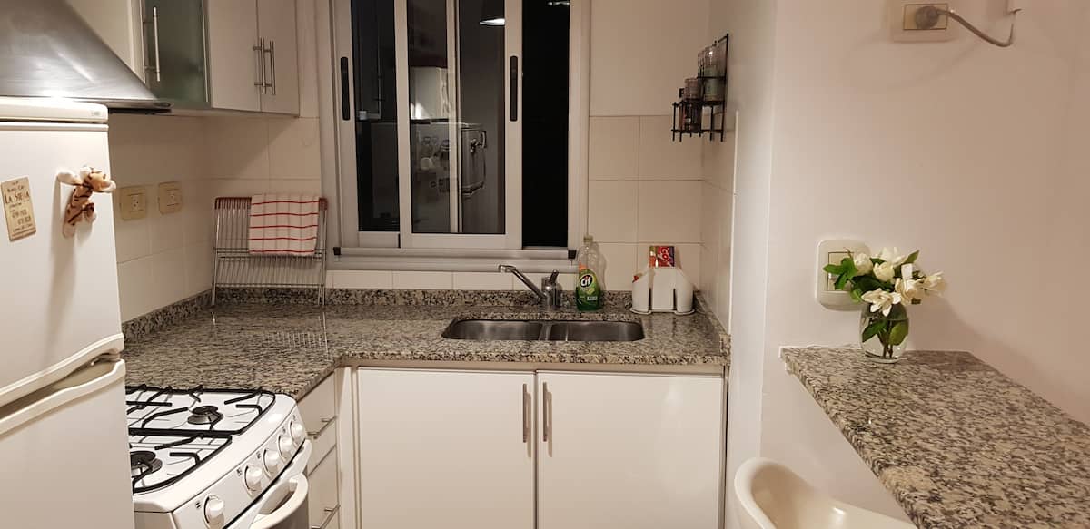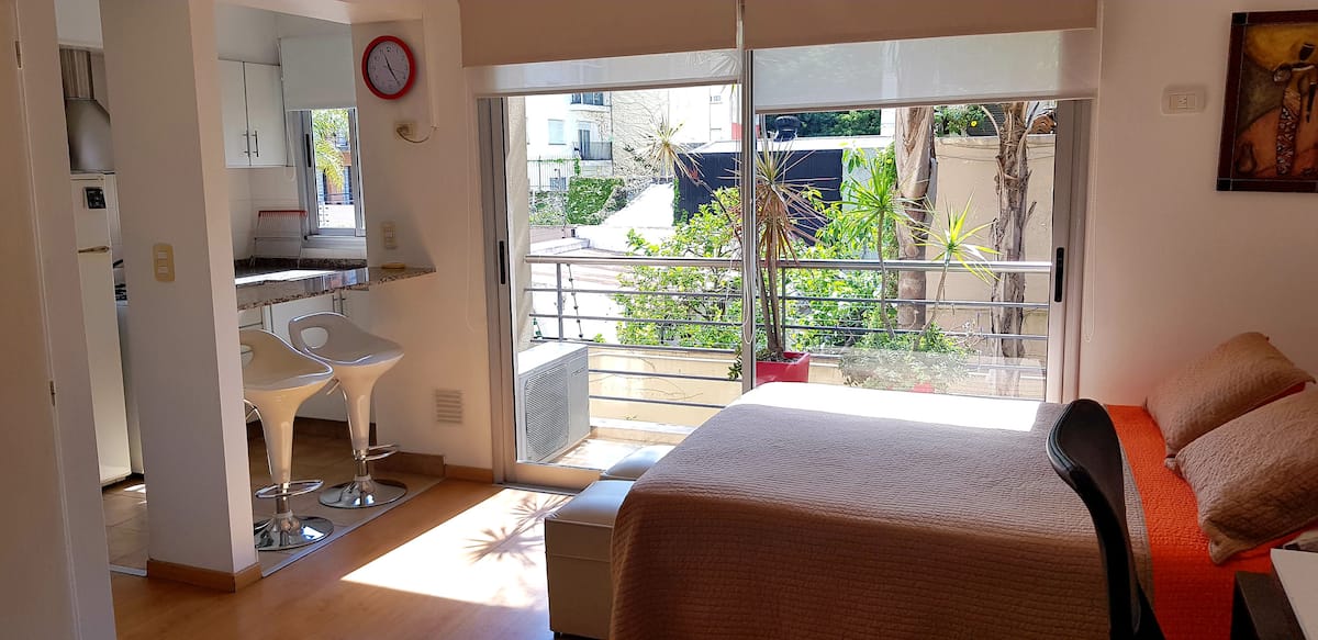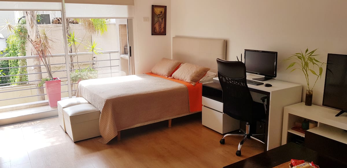 One-bedroom apartment in Olivos. The listing describes it as modern, in a safe and quiet area, about 100 metres from Olivos train station and 300 metres from the harbour. The area is described as offering green spaces and good connections to downtown.