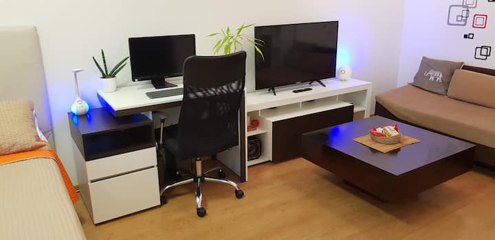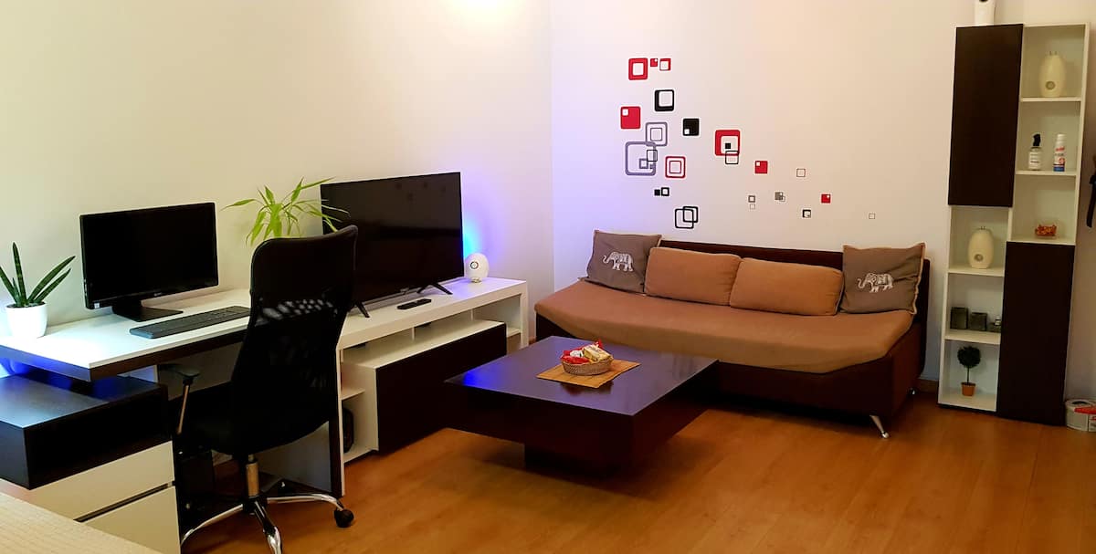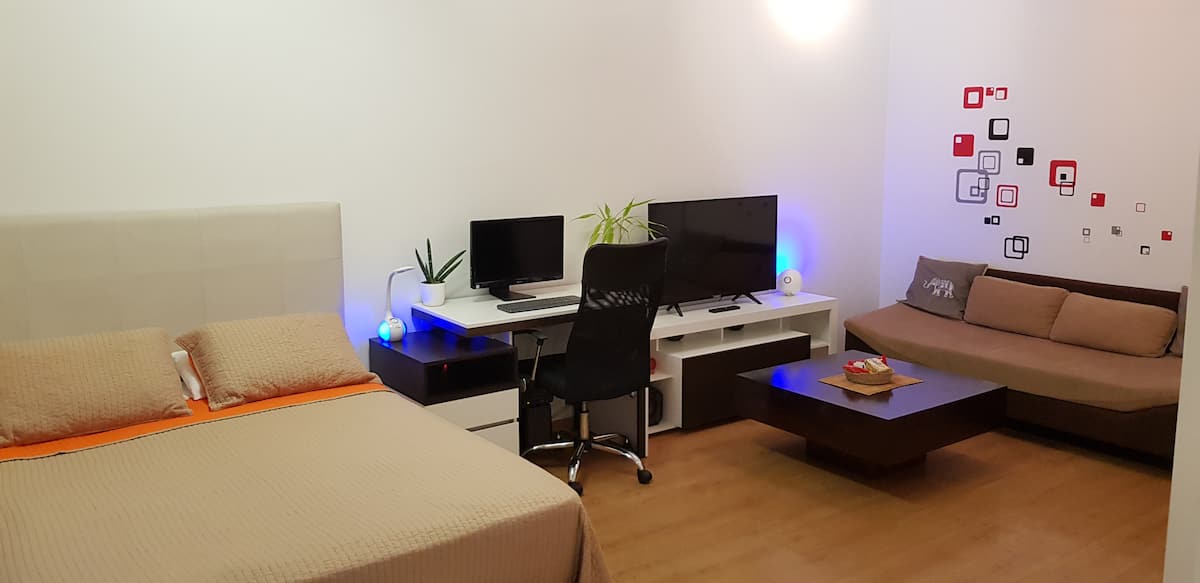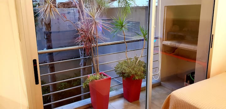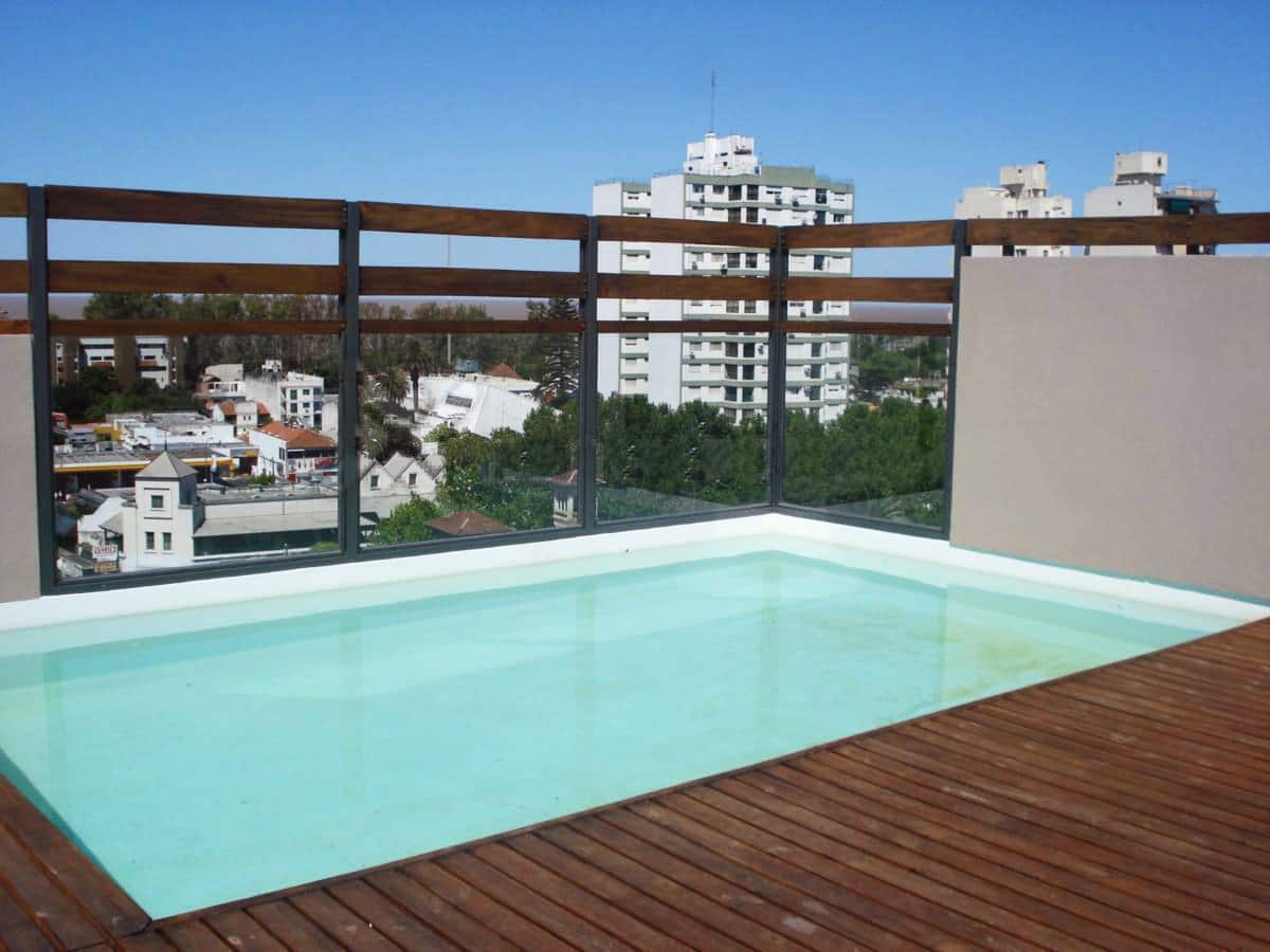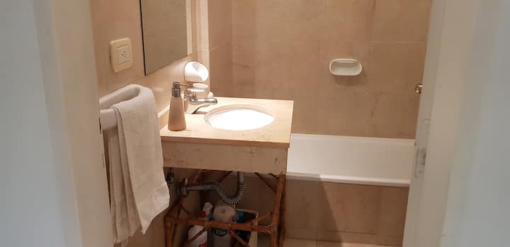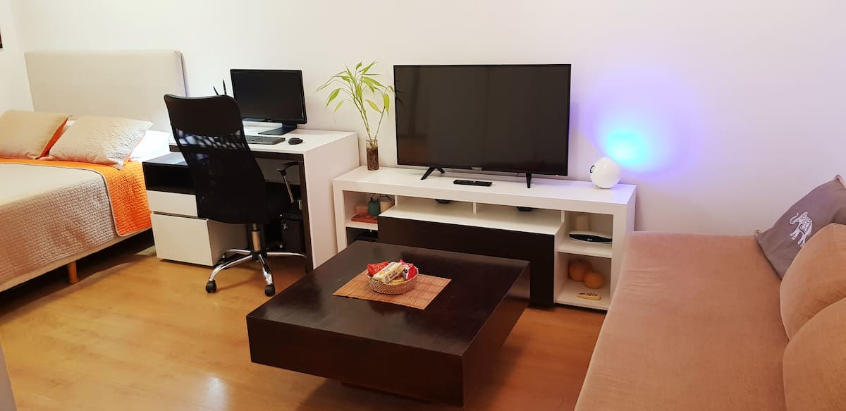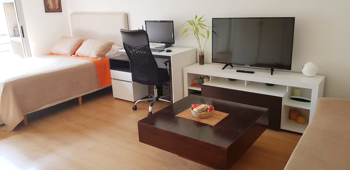 One-bedroom apartment in Olivos. The listing describes it as modern, in a safe and quiet area, about 100 metres from Olivos train station and 300 metres from the harbour. The area is described as offering green spaces and good connections to downtown.