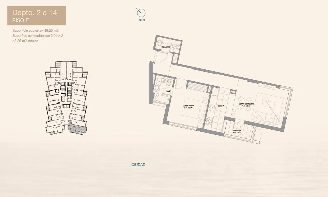 Two-room apartment of 54 m² in Puerto de Olivos, in the Star Tower, with lateral river views. The unit has an entrance hall, a living-dining room with access to a balcony, an en-suite bedroom with a full bathroom and built-in wardrobe, and a separate toilet. It includes a covered (assigned) parking space; a semi-integrated kitchen with a breakfast bar and daily dining area; double-glazed windows; porcelain tile flooring; air conditioning with cold/heat settings; blackout blinds in the bedroom an